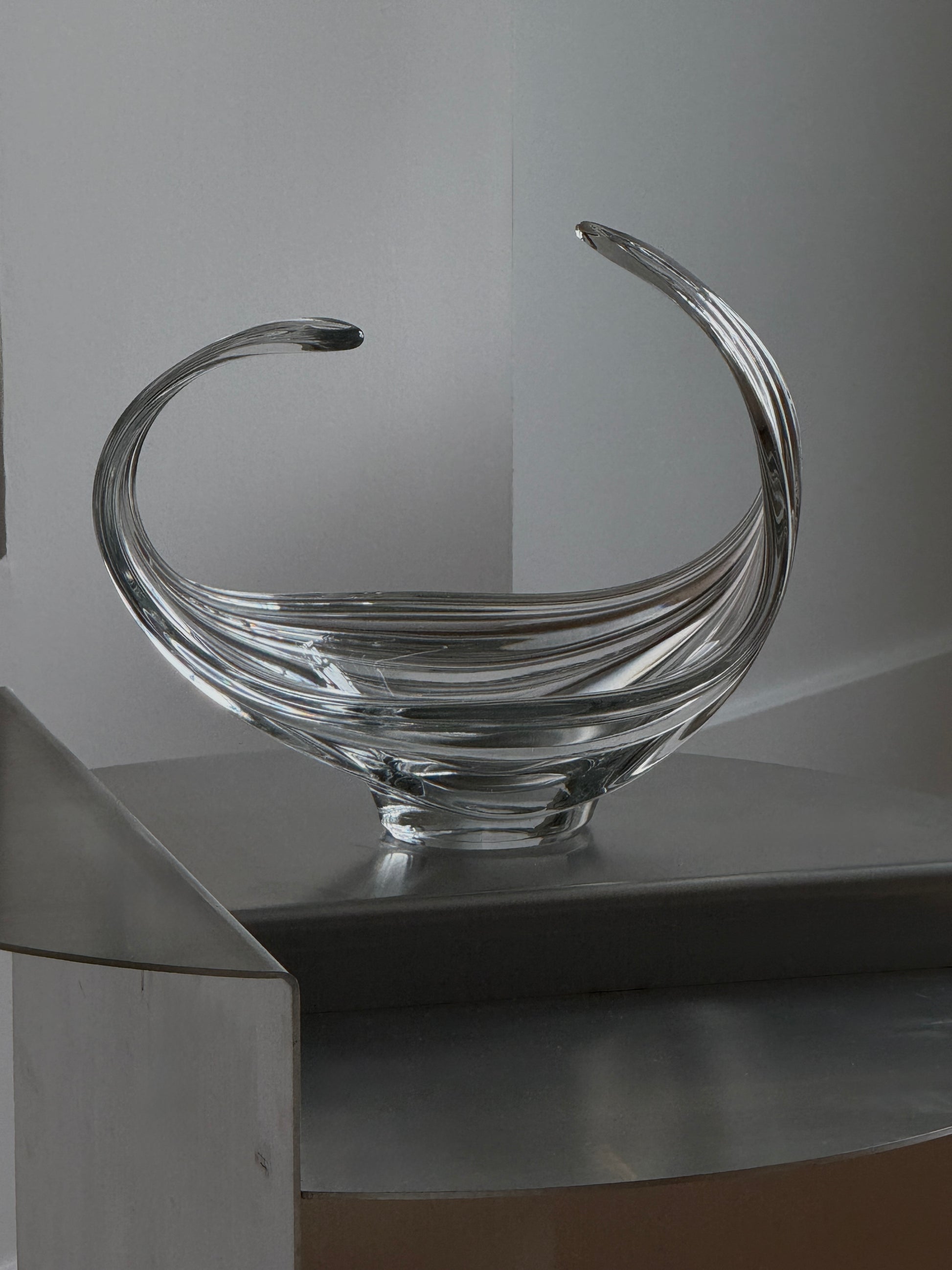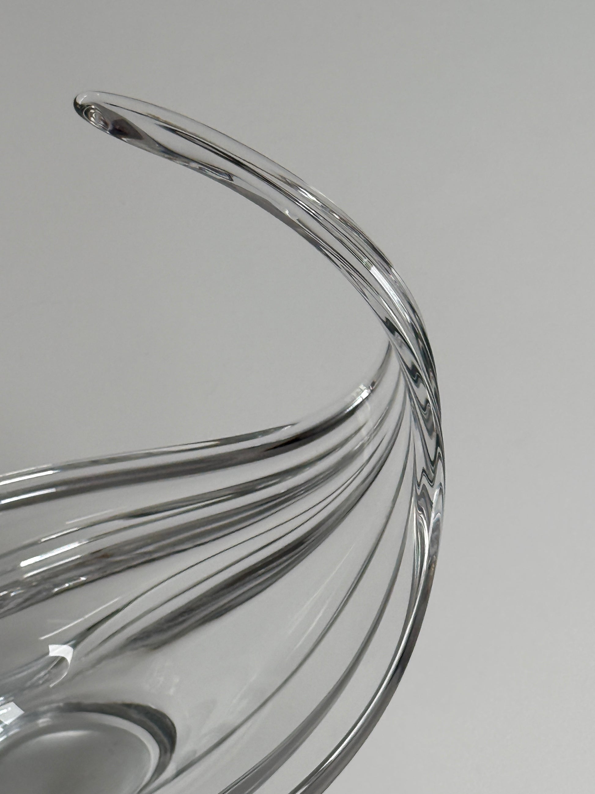 This elegant French glass centerpiece features a flowing, sculptural design that beautifully reflects light - a timeless mid-century statement piece.