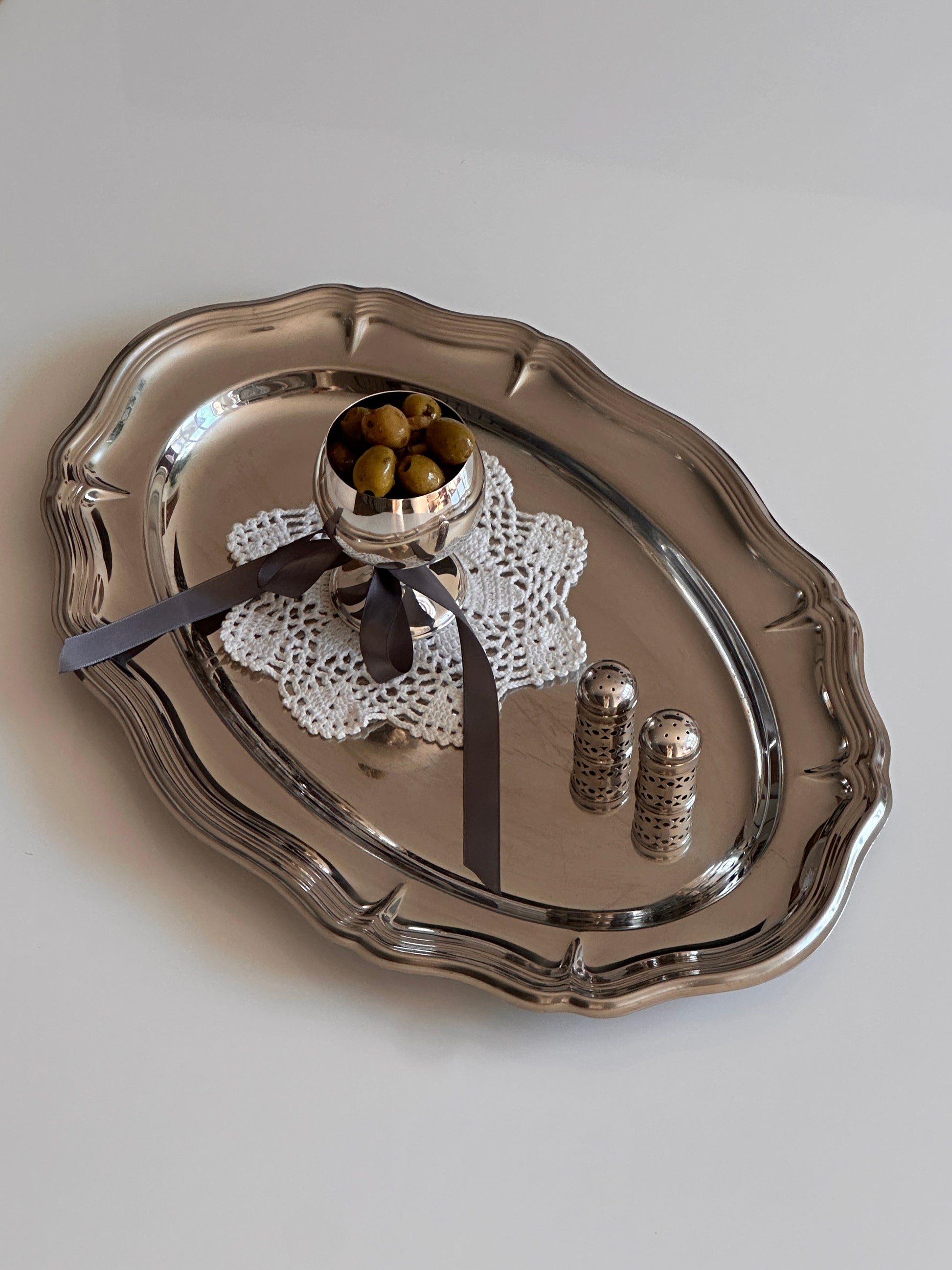 Add a touch of elegance to your serving collection with this large adorned steel tray, made in Italy. Featuring a beautifully scalloped edge and polished finish, this versatile tray is perfect for entertaining or as a decorative piece.