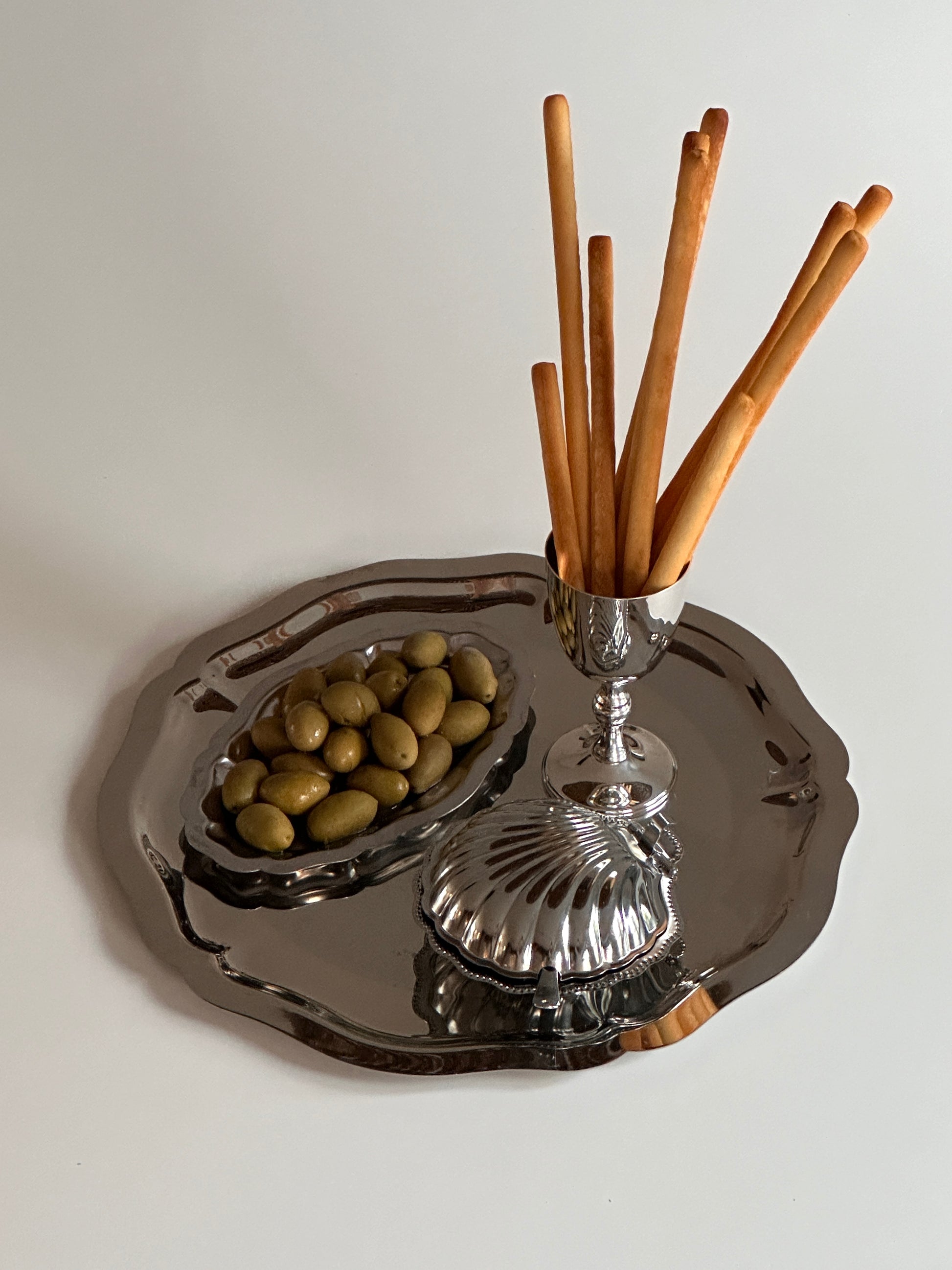 Add a touch of elegance to your entertaining with this beautifully adorned French steel tray. Its sleek, polished surface and classic design make it the perfect backdrop for serving appetizers, drinks, or displaying décor. Timeless and versatile, it’s a stylish addition to any table setting.