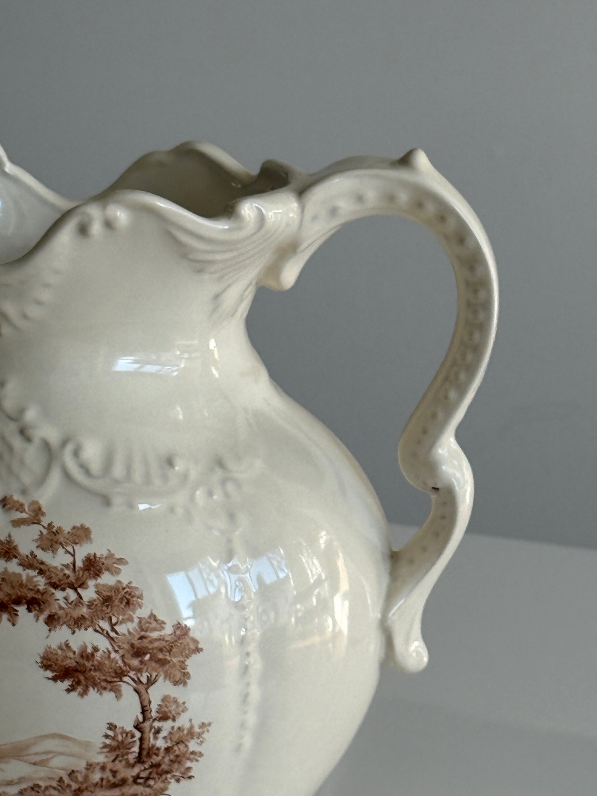 Add timeless charm to your space with this Antique Pitcher Vase, featuring delicate brown scenic detailing. Perfect as a standalone piece or filled with fresh or dried florals.