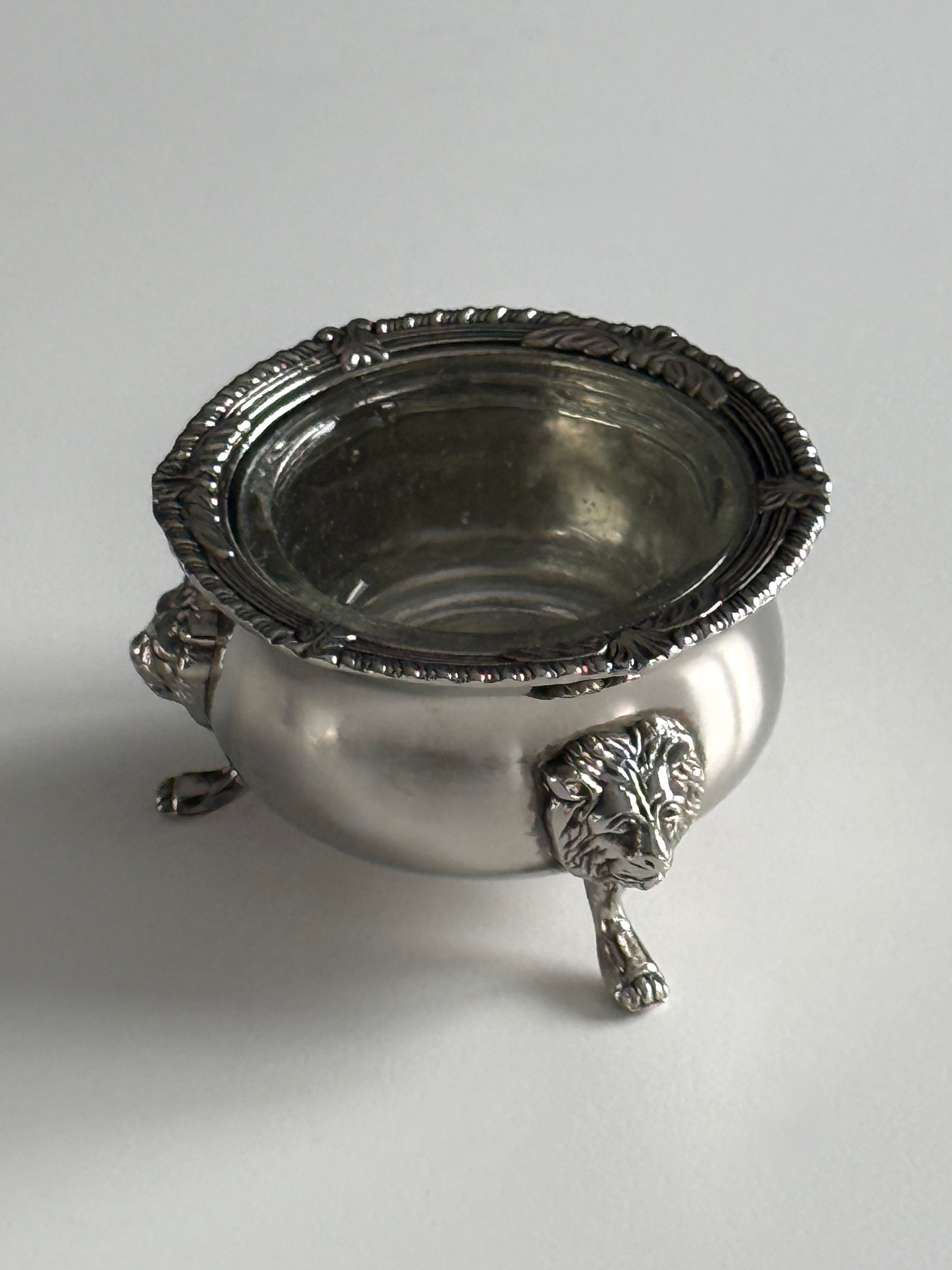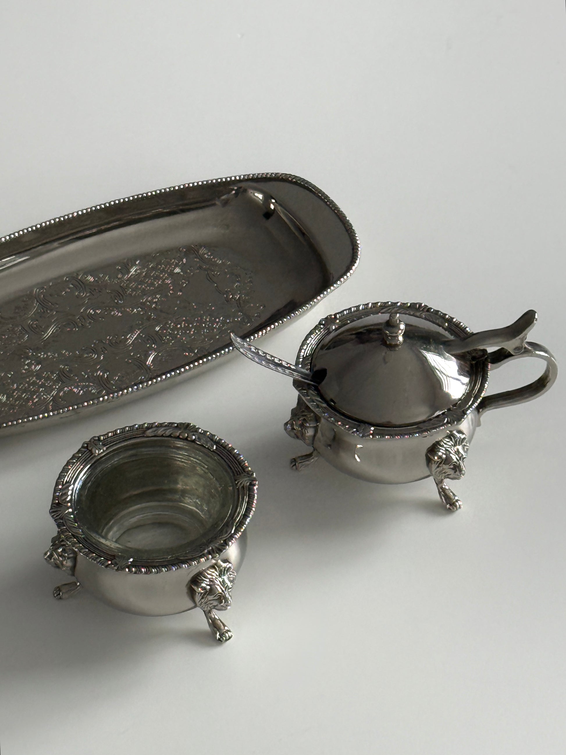 An elegant antique silver-plated condiment set presented on its original matching tray, richly detailed with sculptural lion’s head and paw feet. The etched underplate is finished with a refined beaded rim, creating a timeless piece that brings a sense of heritage and sophistication to the art of entertaining.