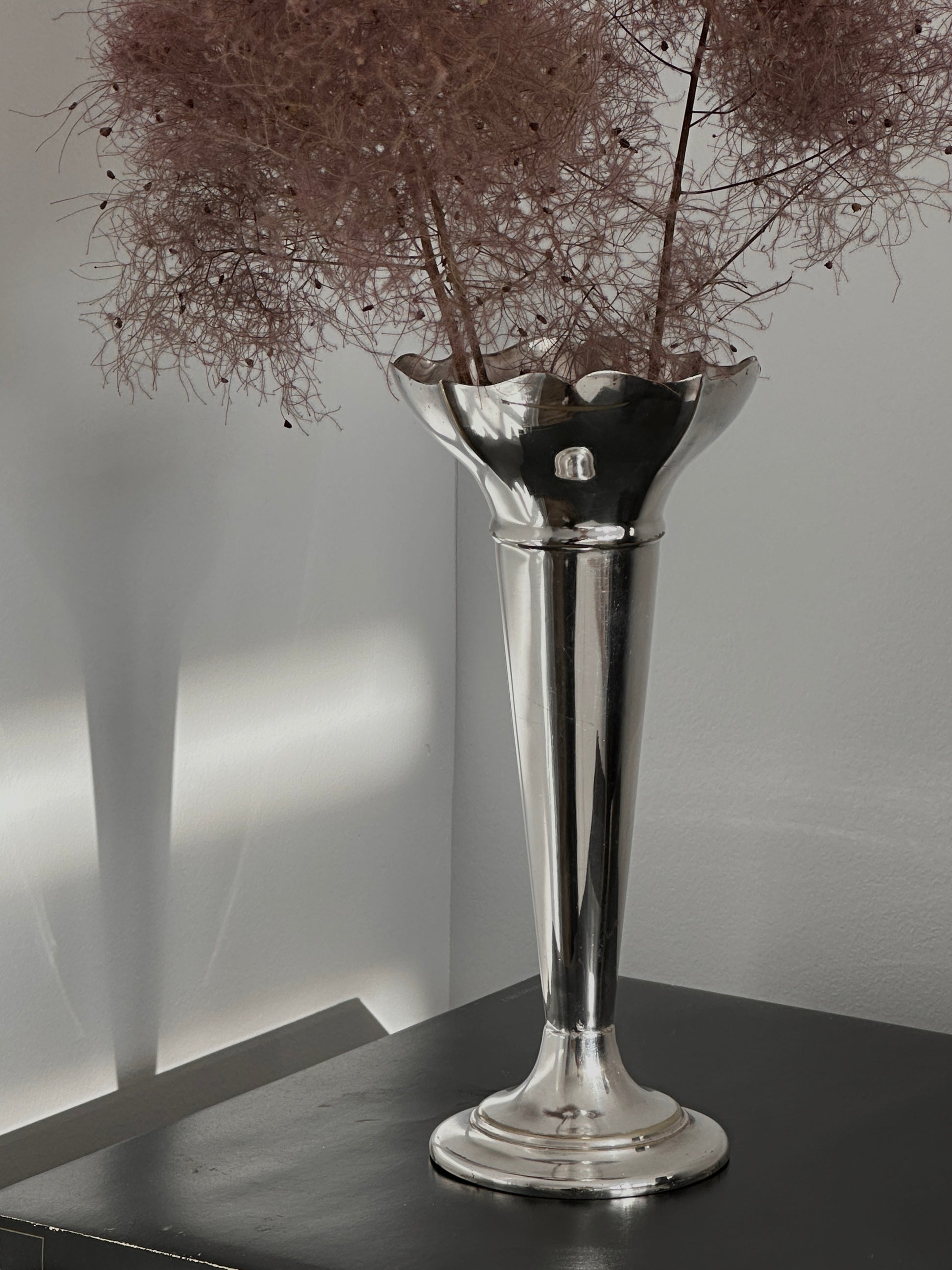 This refine vase features a unique trumpet shape. Its timeless and sleek design makes it a striking piece, beautiful with or without flowers.
