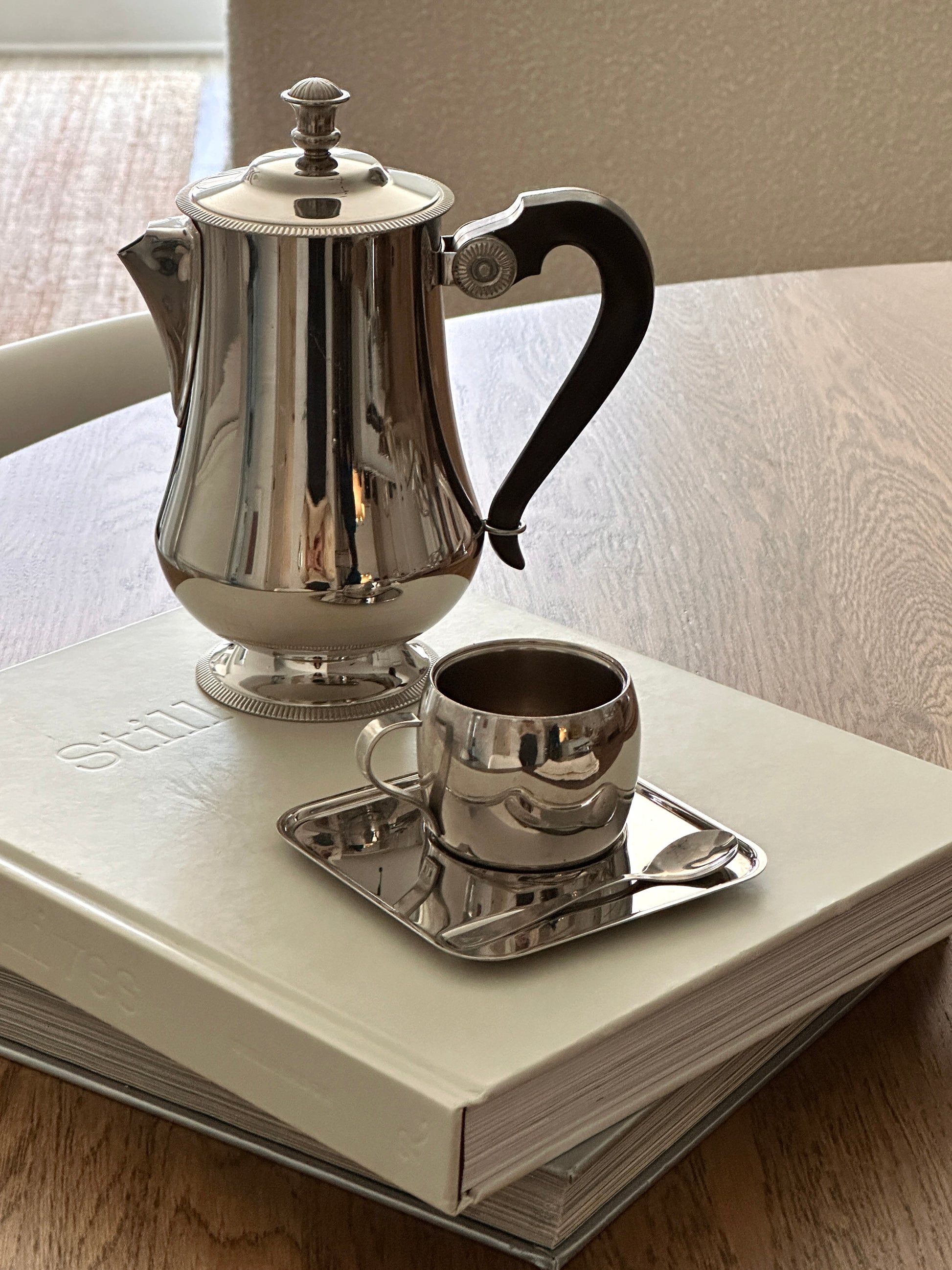 This Art Deco Stainless Steel Coffee Pot offers a mirror finish with sleek contours and a polished surface that exude sophistication.