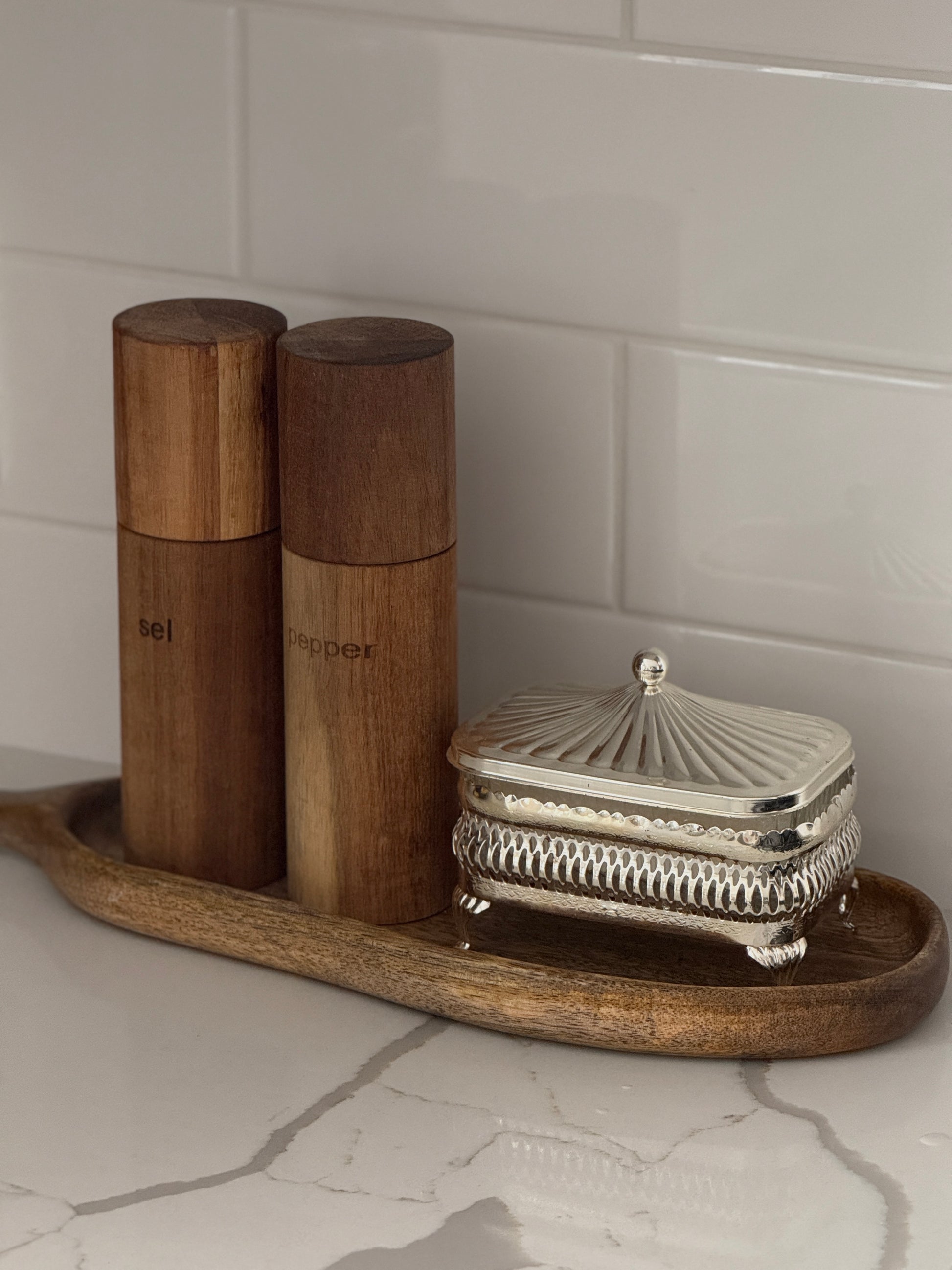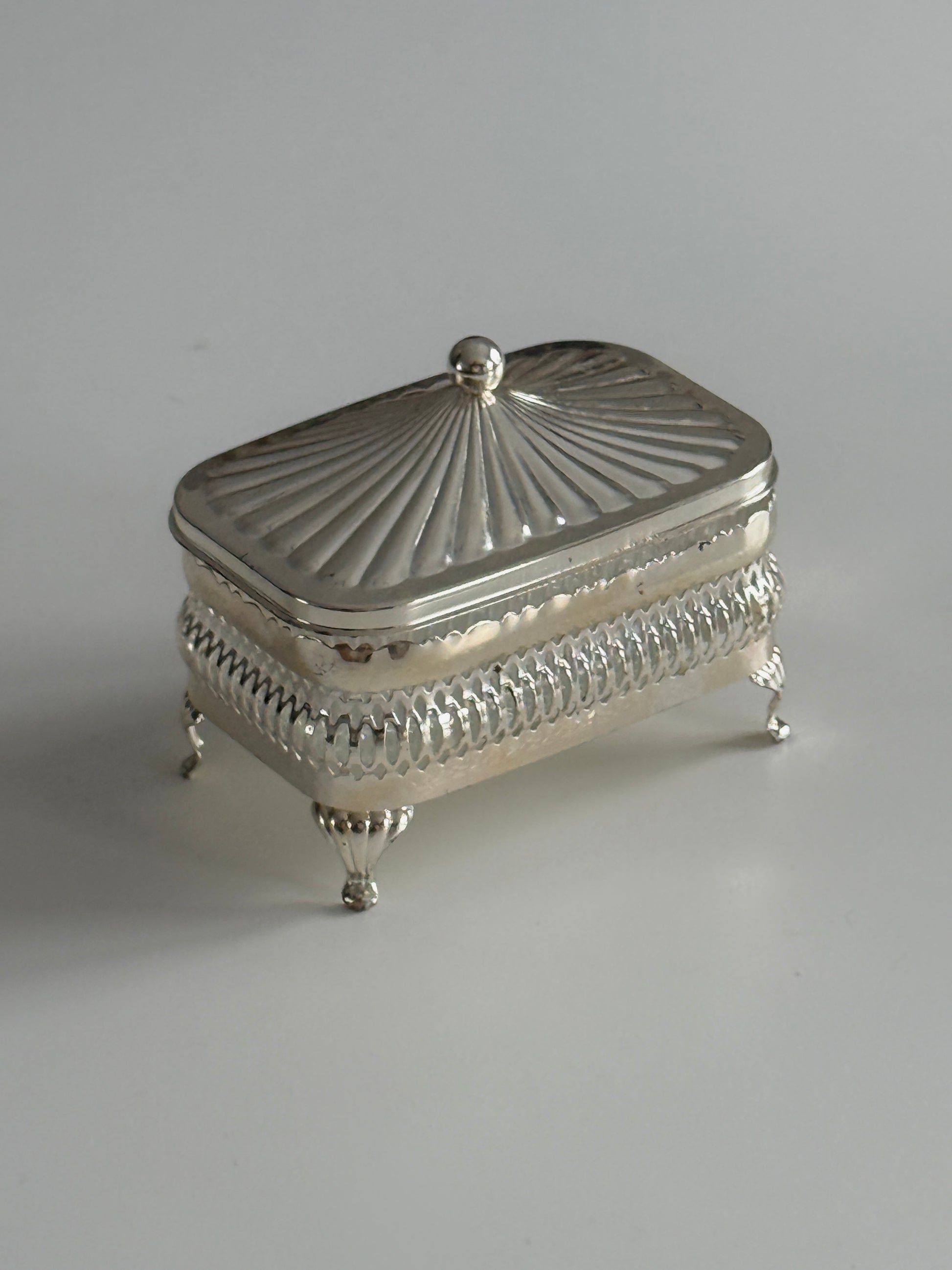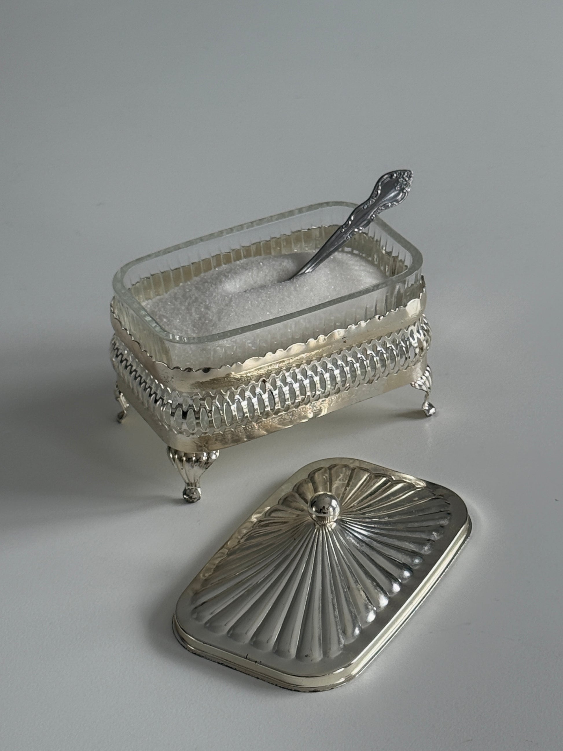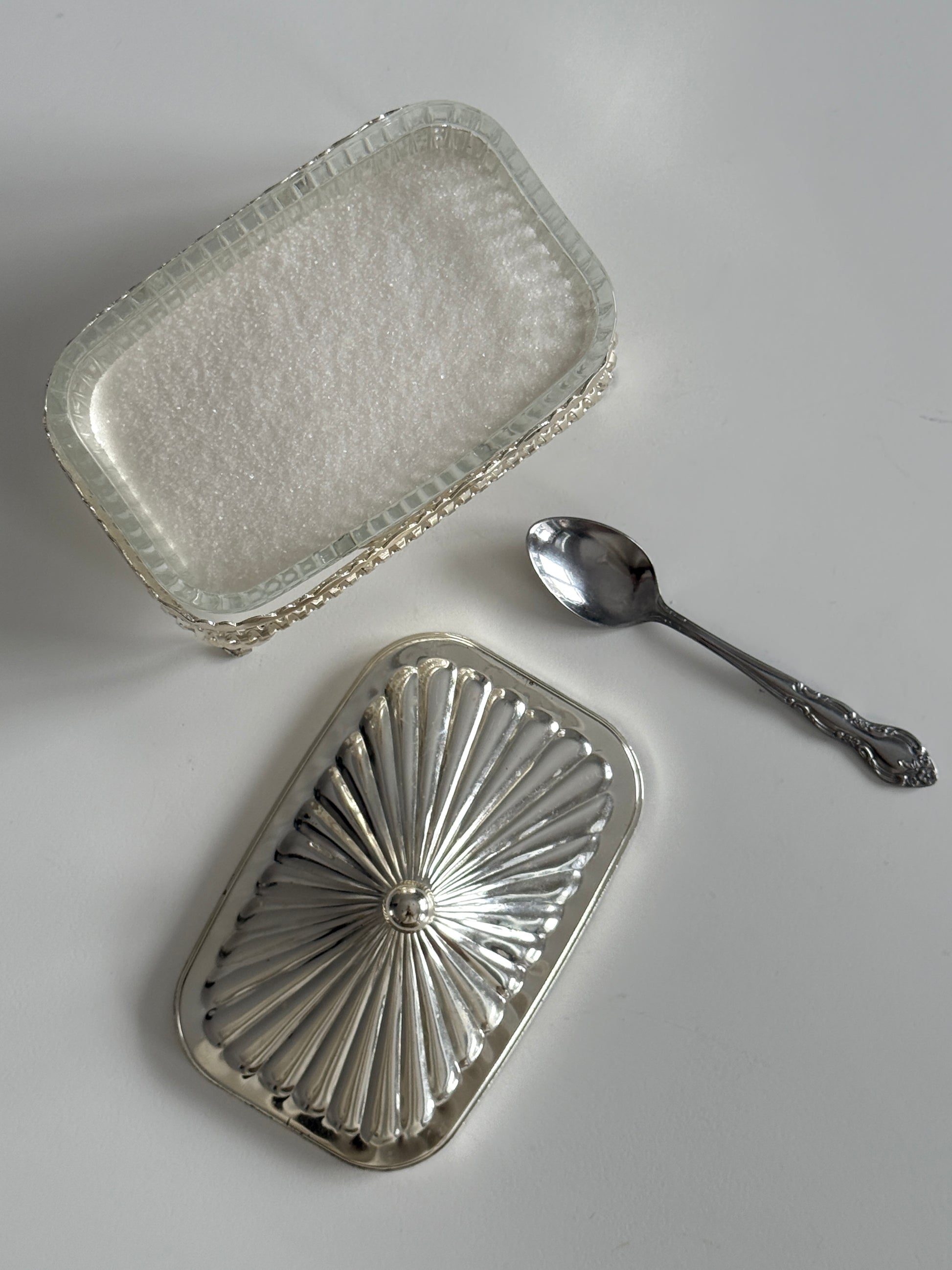 This English Silver Plate Butter Dish features elegant footed detailing and includes a separate glass insert, perfect for serving butter in style.
