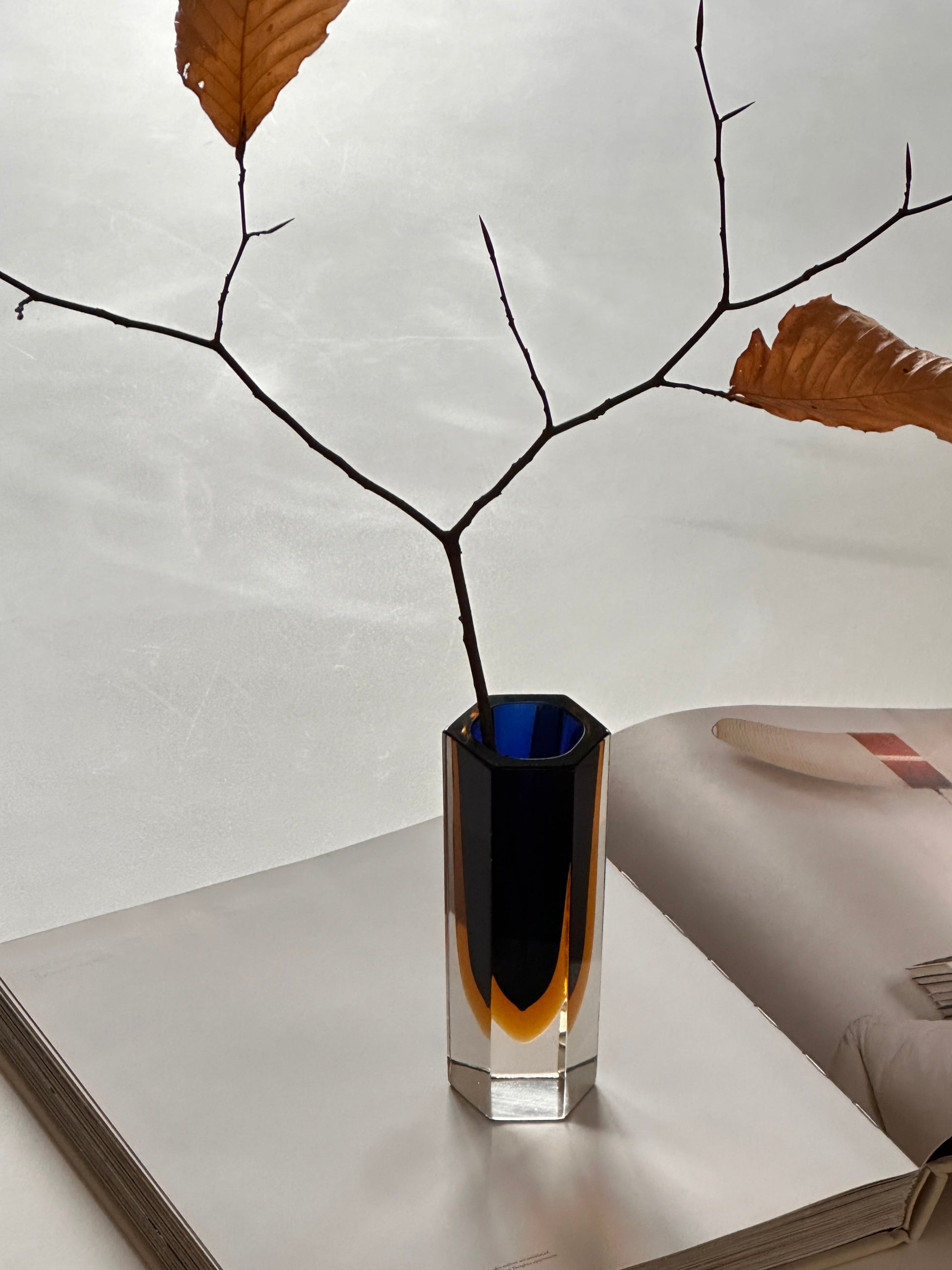 Explore mid-century charm with the Flavio Poli Sommerso case. Crafted in the 1960s, this Seguso creation features captivating blue, yellow, and clear glass layers using the 'Sommerso' technique from Murano. Adaptable as a sophisticated centerpiece, it adds refined elegance to any space.