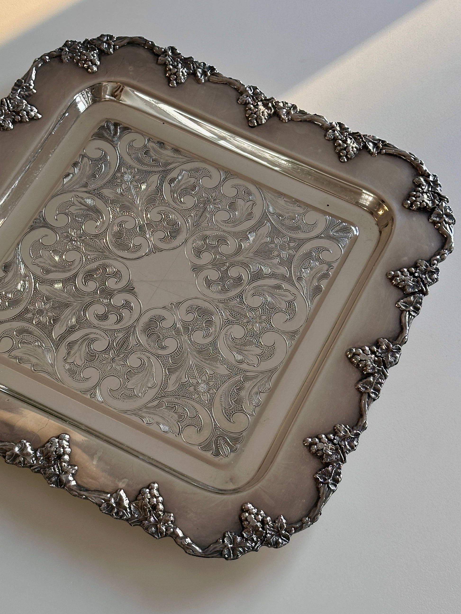 This silver-plated square shape serving tray features intricate floral detailing and a polished finish, adding a touch of elegance to any occasion. Perfect for serving cheeses, charcuterie, or appetizers, it combines style and function, making it a standout piece for any sophisticated setting.