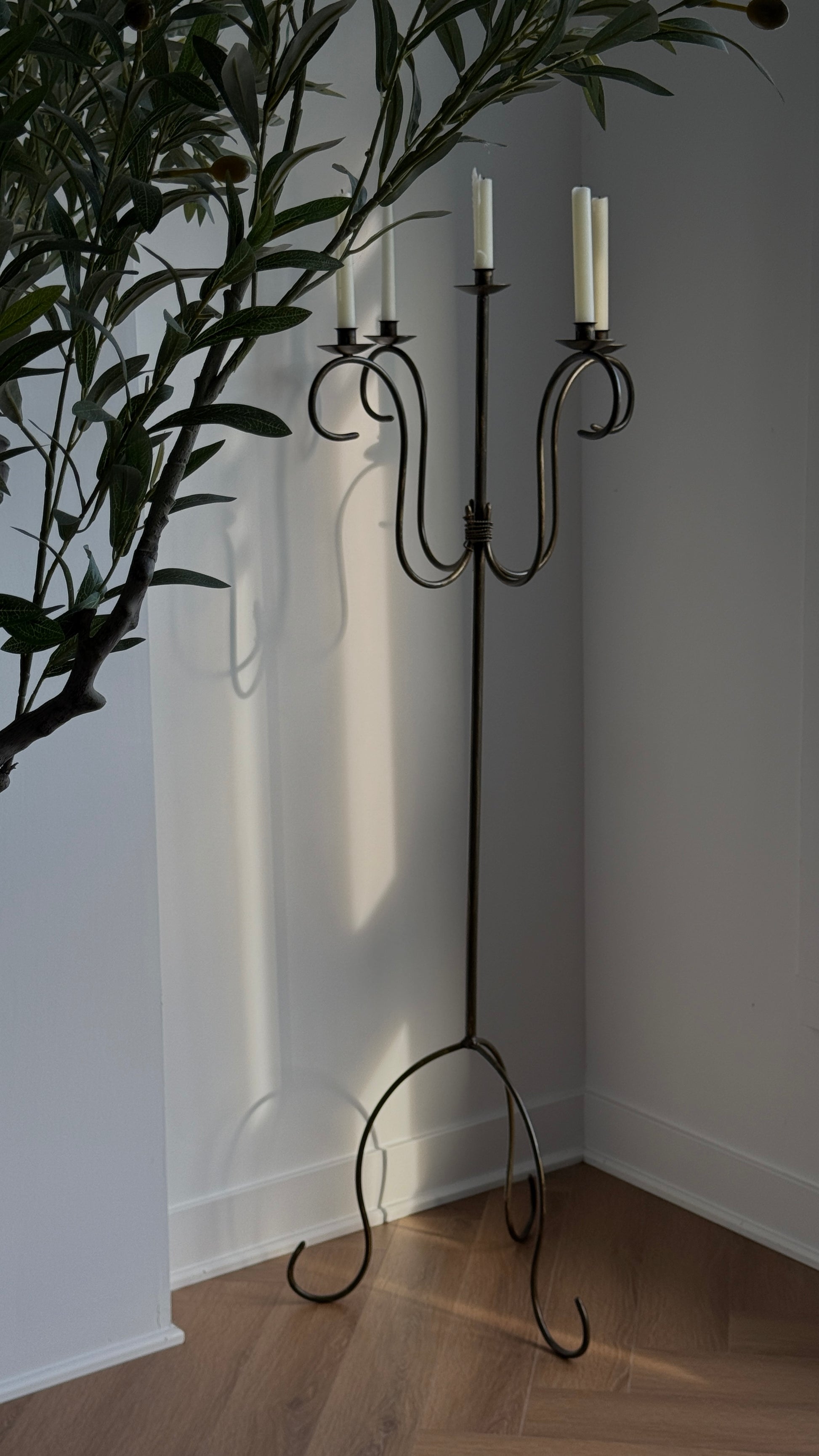 Introducing our Iron Vintage Floor Candelabra, a tall and slim piece with a unique design, featuring five wicks for a stunning display of ambient lighting. Made from durable iron, its timeless design and intricate details make it a standout piece for enhancing the ambiance of your home decor.