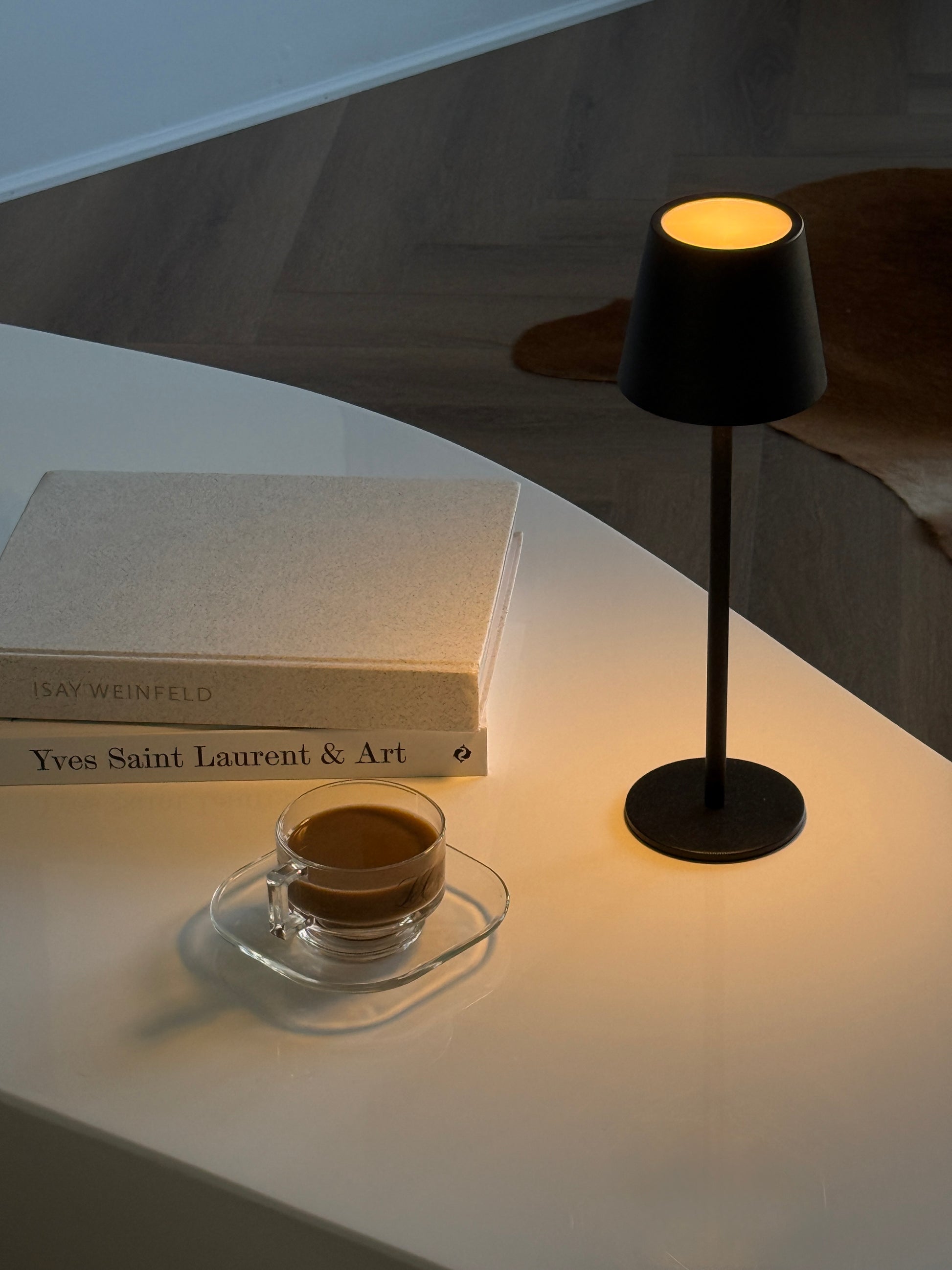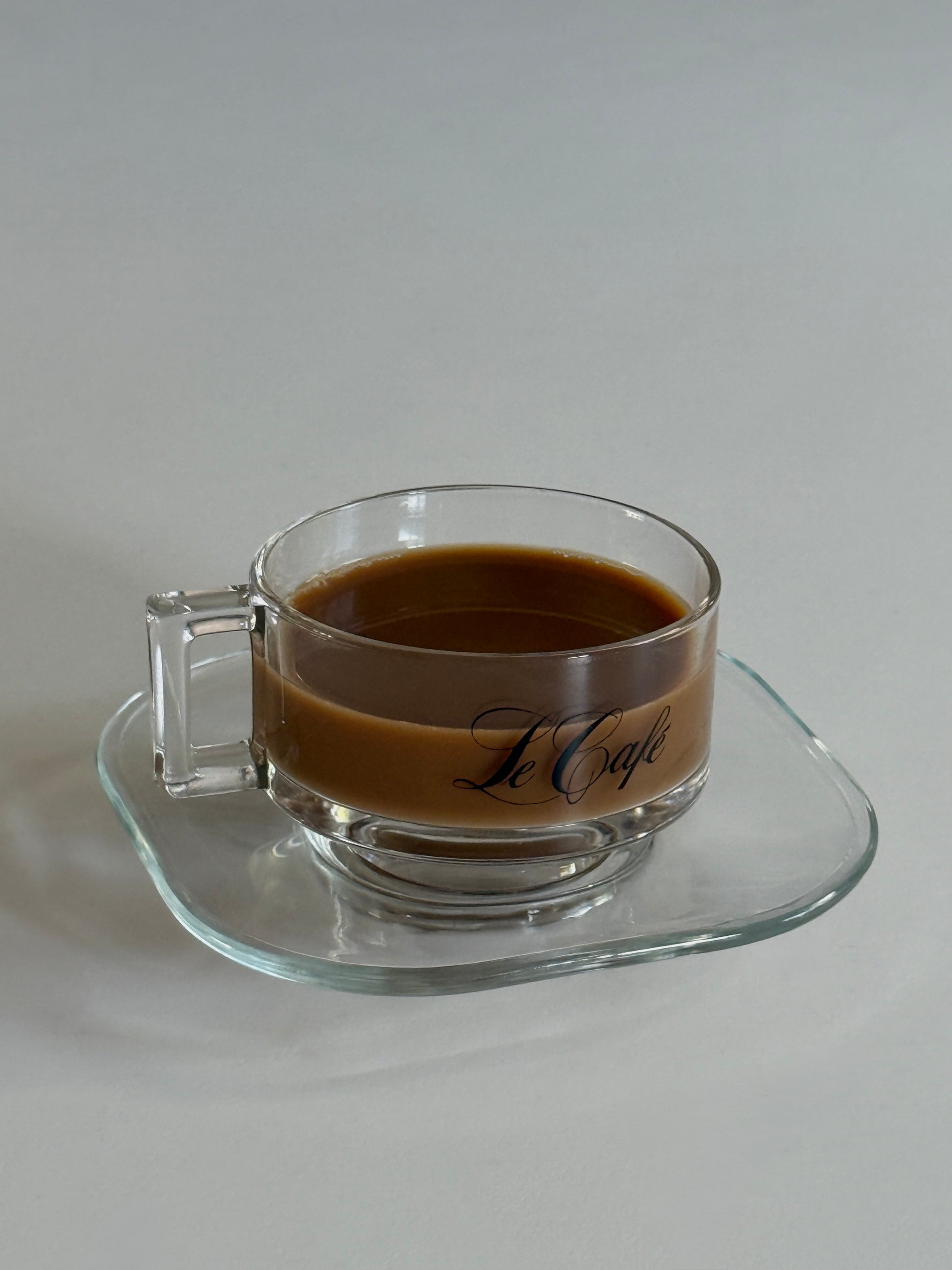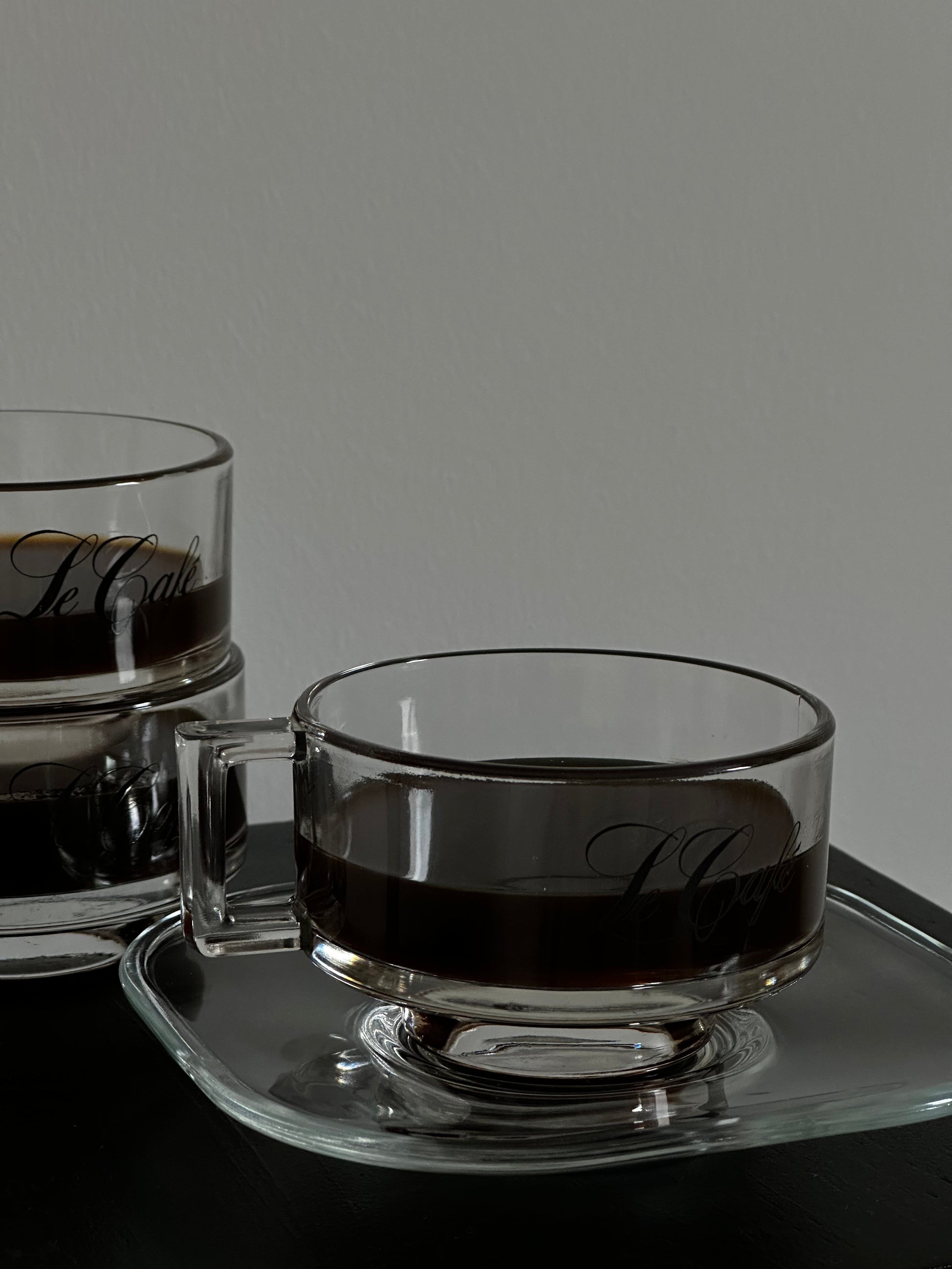 Set of Joe Colombo Arno "Le Cafe" clear glass espresso cups and saucers, known for their distinctive square handles and stackable design. These stunning pieces not only celebrate the art of coffee but also bring a beautiful aesthetic to your daily coffee ritual.