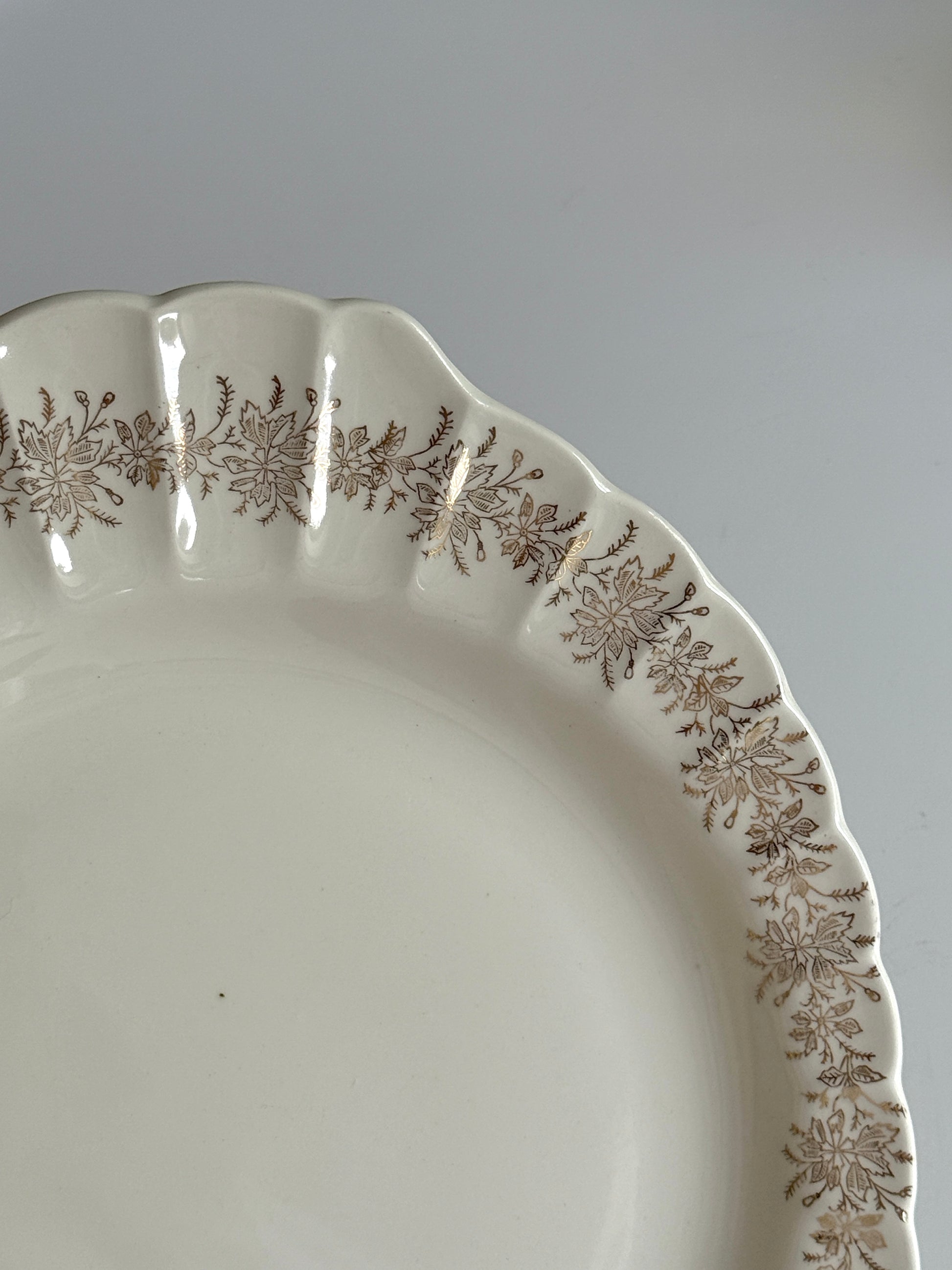 Elegant vintage Limoges porcelain serving plater, adorned with a delicate gold flower trim and finished in warranted 22K gold plate — a timeless piece for refined entertaining or display.