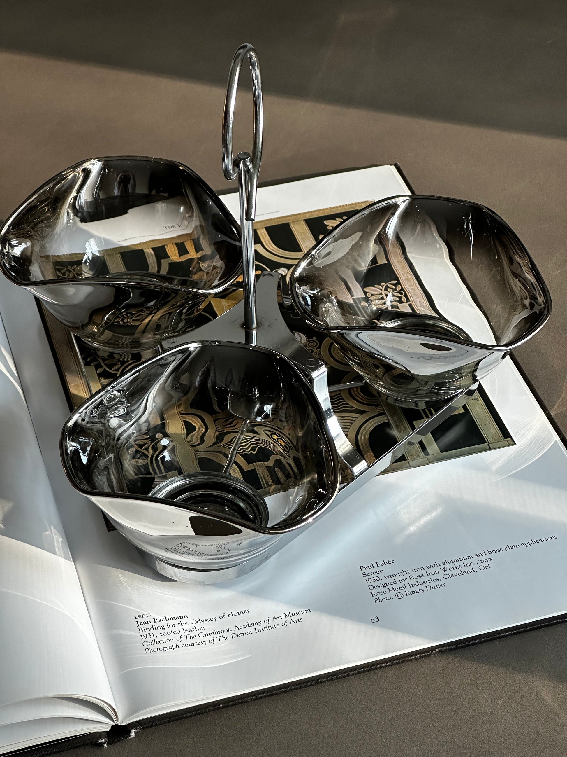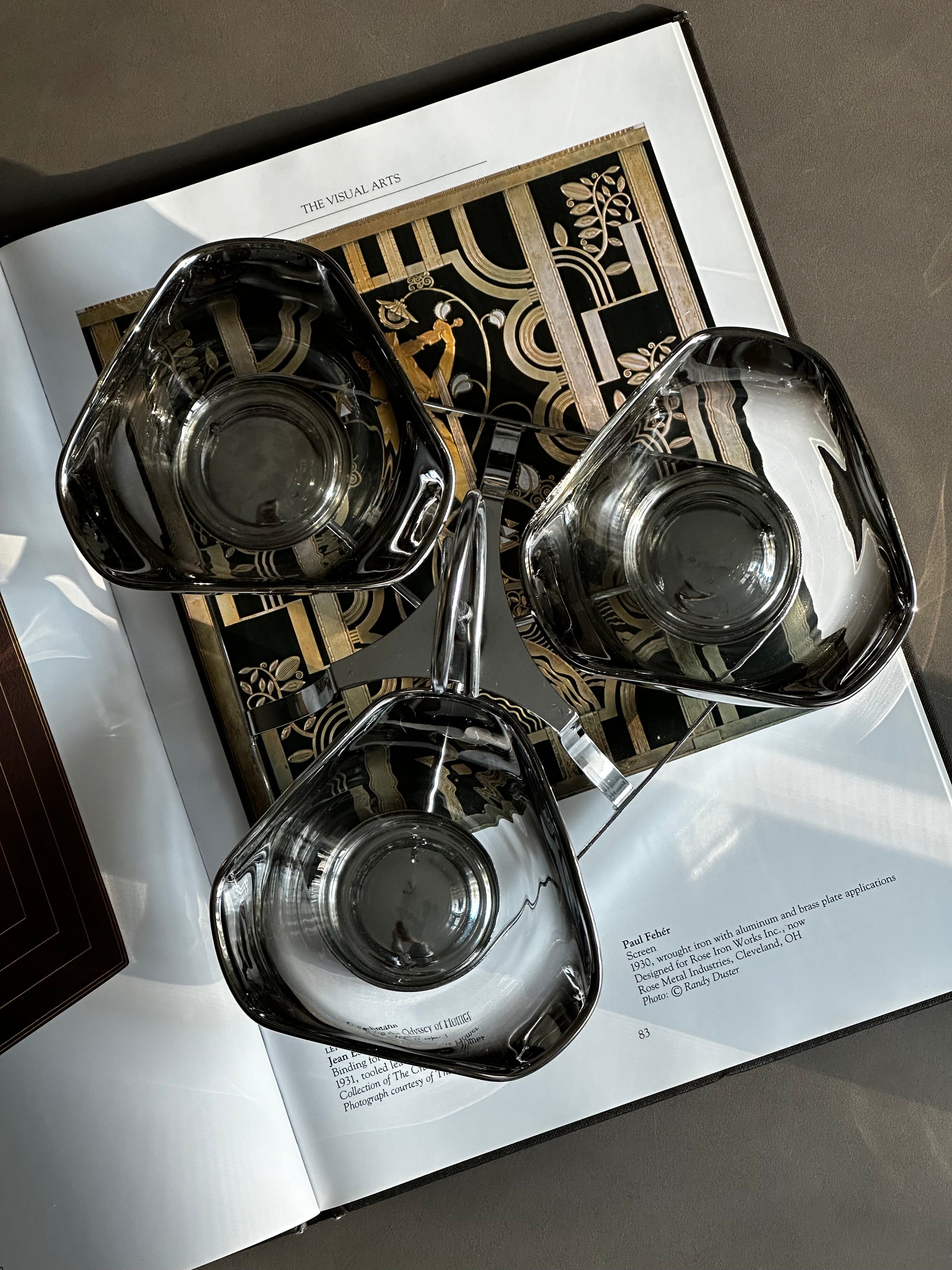 Mid Century Silver Ombre Glass Condiment Bowls with Chrome Caddy