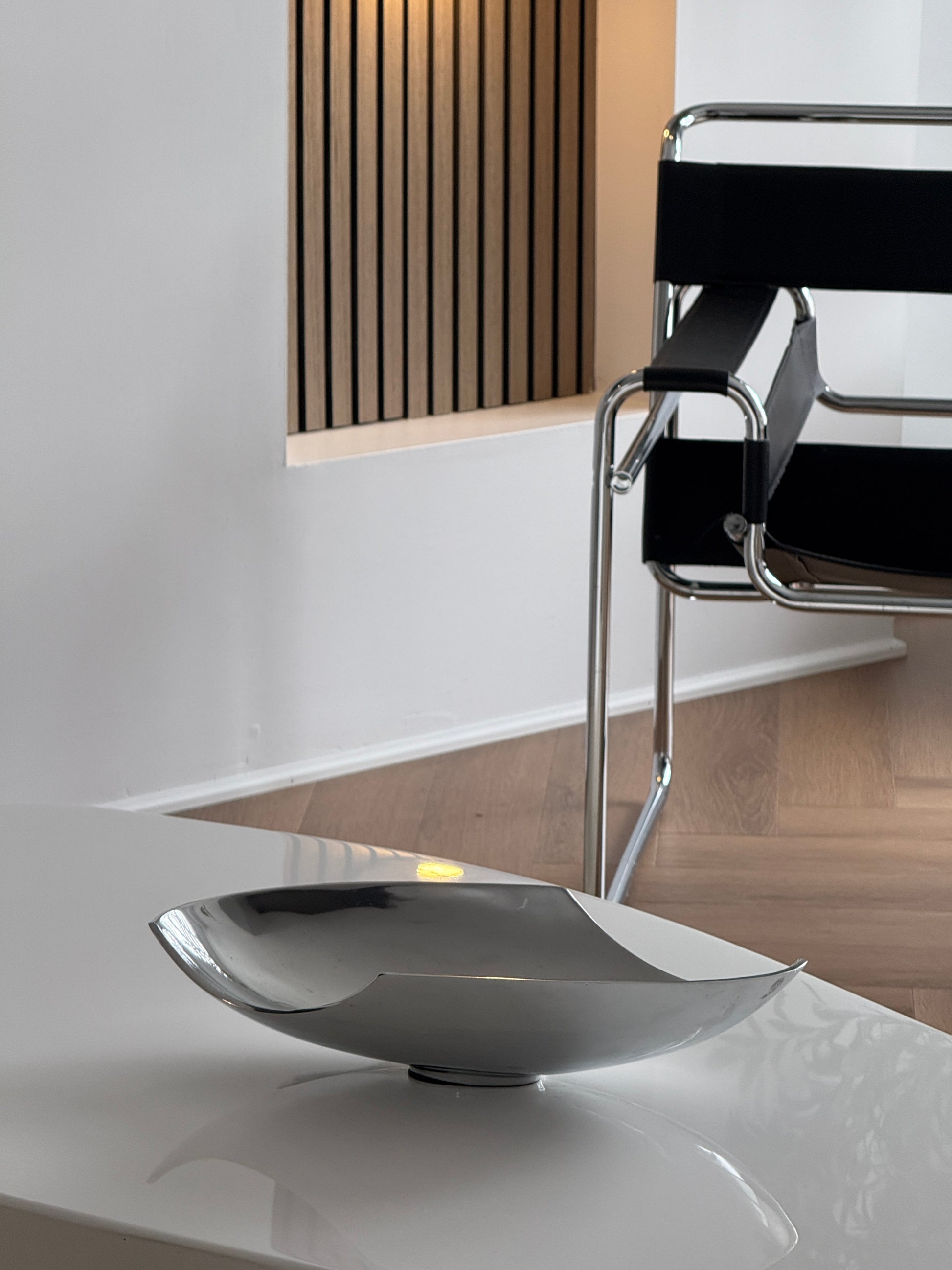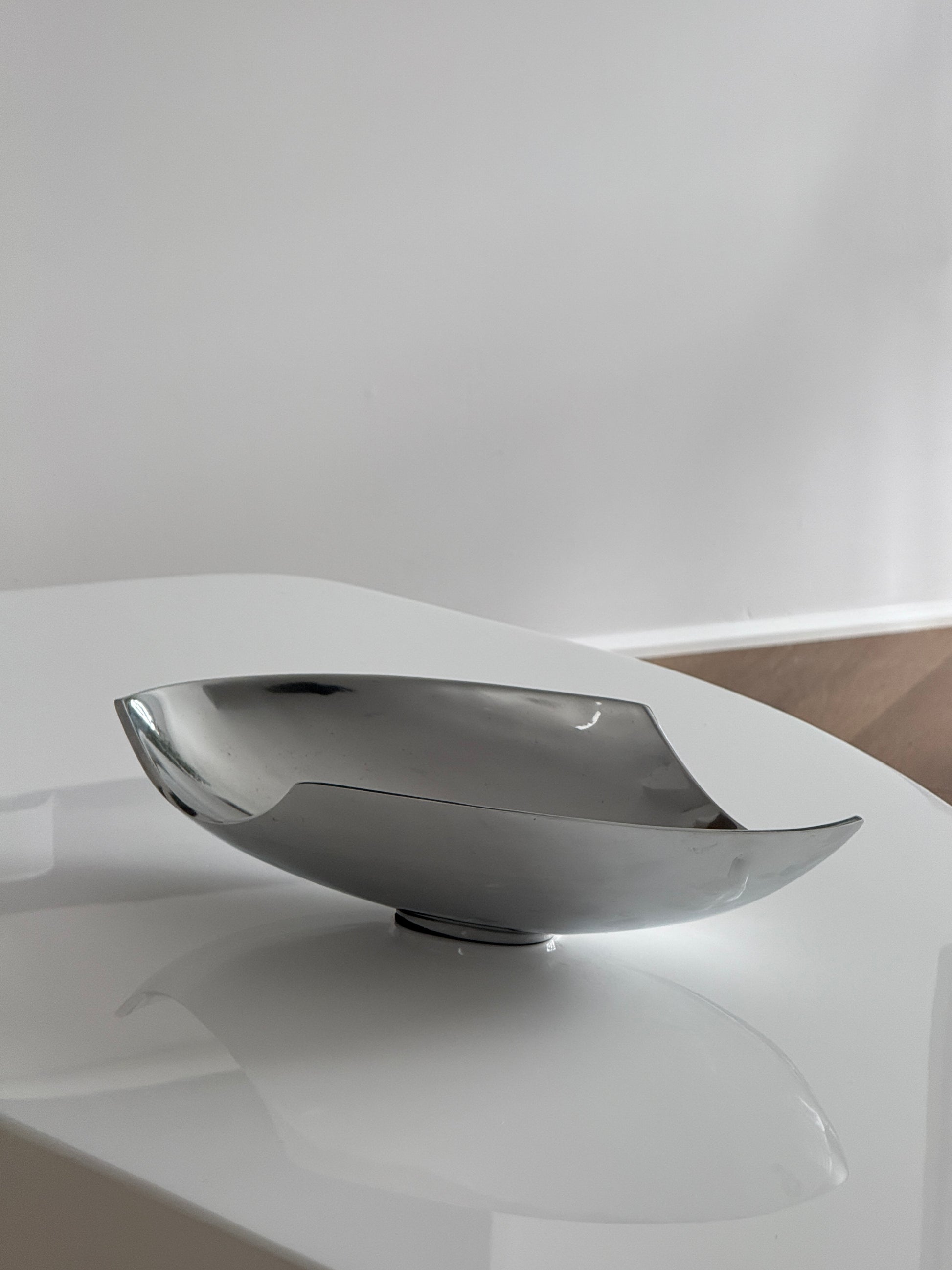 This Mid Century Chrome Bowl from the 1980s features a sleek, abstract shape, adding a modern touch to any space. Perfect for displaying small items or as a statement piece.
