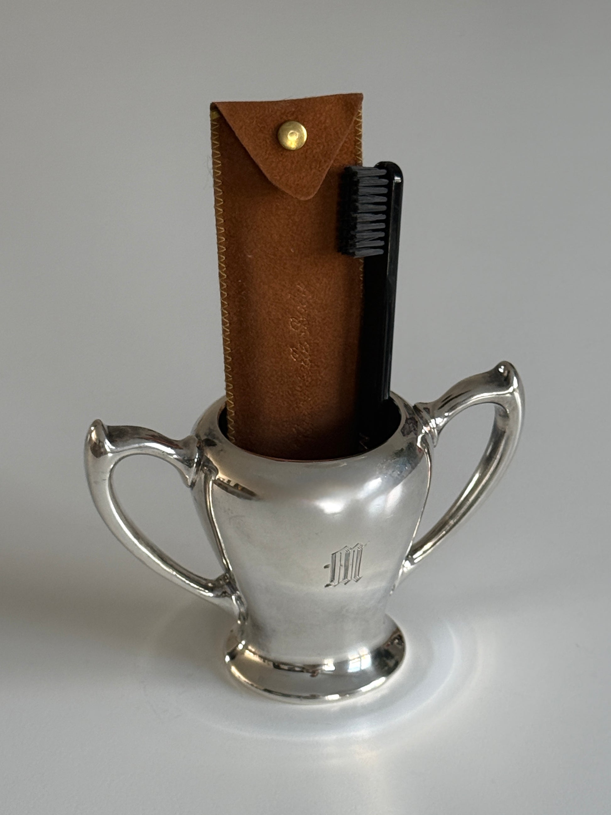 An elegant monogrammed silver-plated sugar bowl featuring a refined “M” engraving. Its classic silhouette and polished finish make it perfect for tea service or as a charming vanity piece, ideal for holding small beauty essentials with vintage flair.
