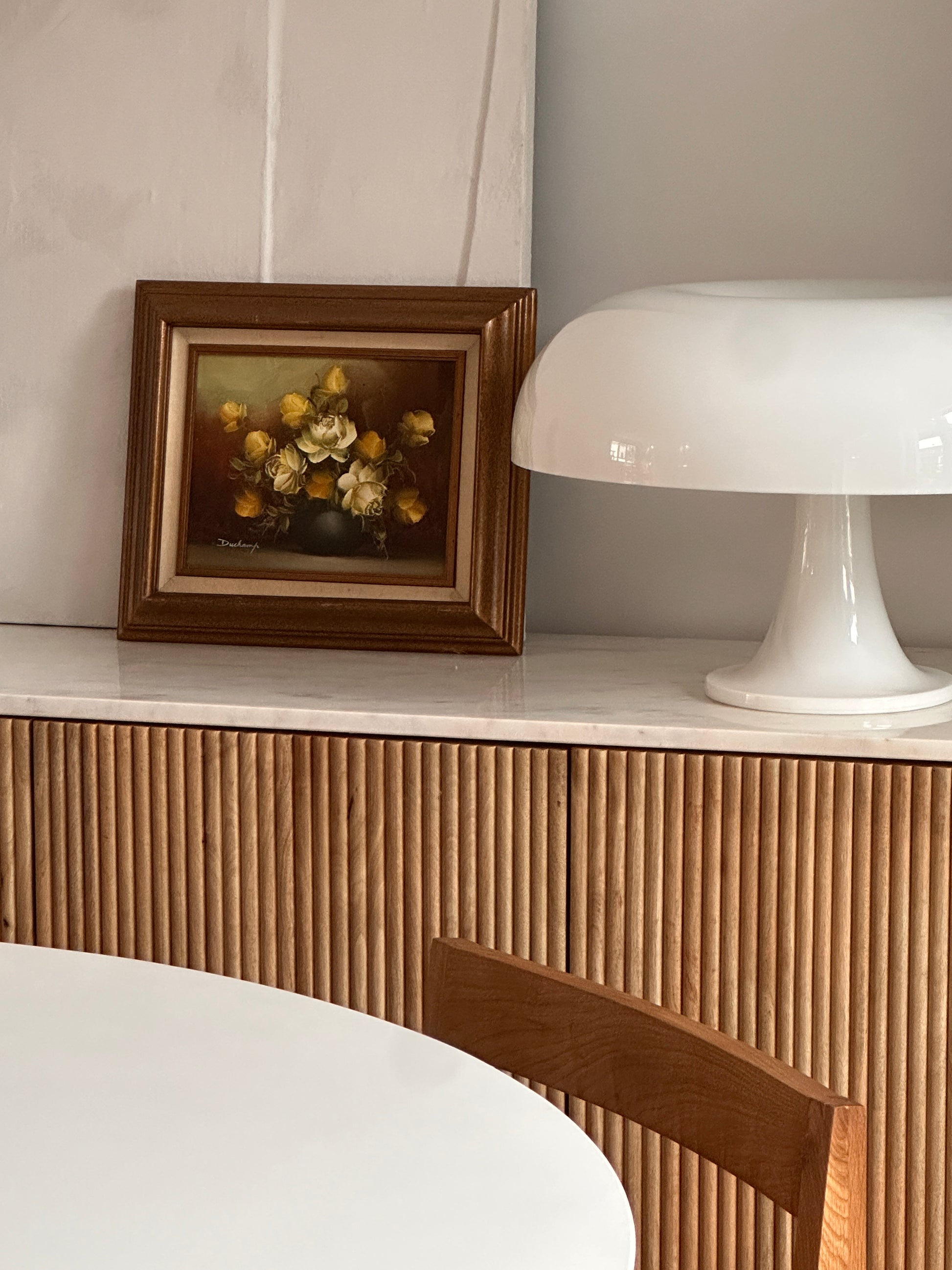 This striking moody floral painting, signed by an unknown artist in 1981, captures a blend of bold colors and soft textures. The rich, atmospheric tones evoke a sense of depth and emotion, making it a captivating piece for any space. Framed and ready to display, it offers a unique, timeless addition to your art collection, perfect for adding character and intrigue to your home decor.