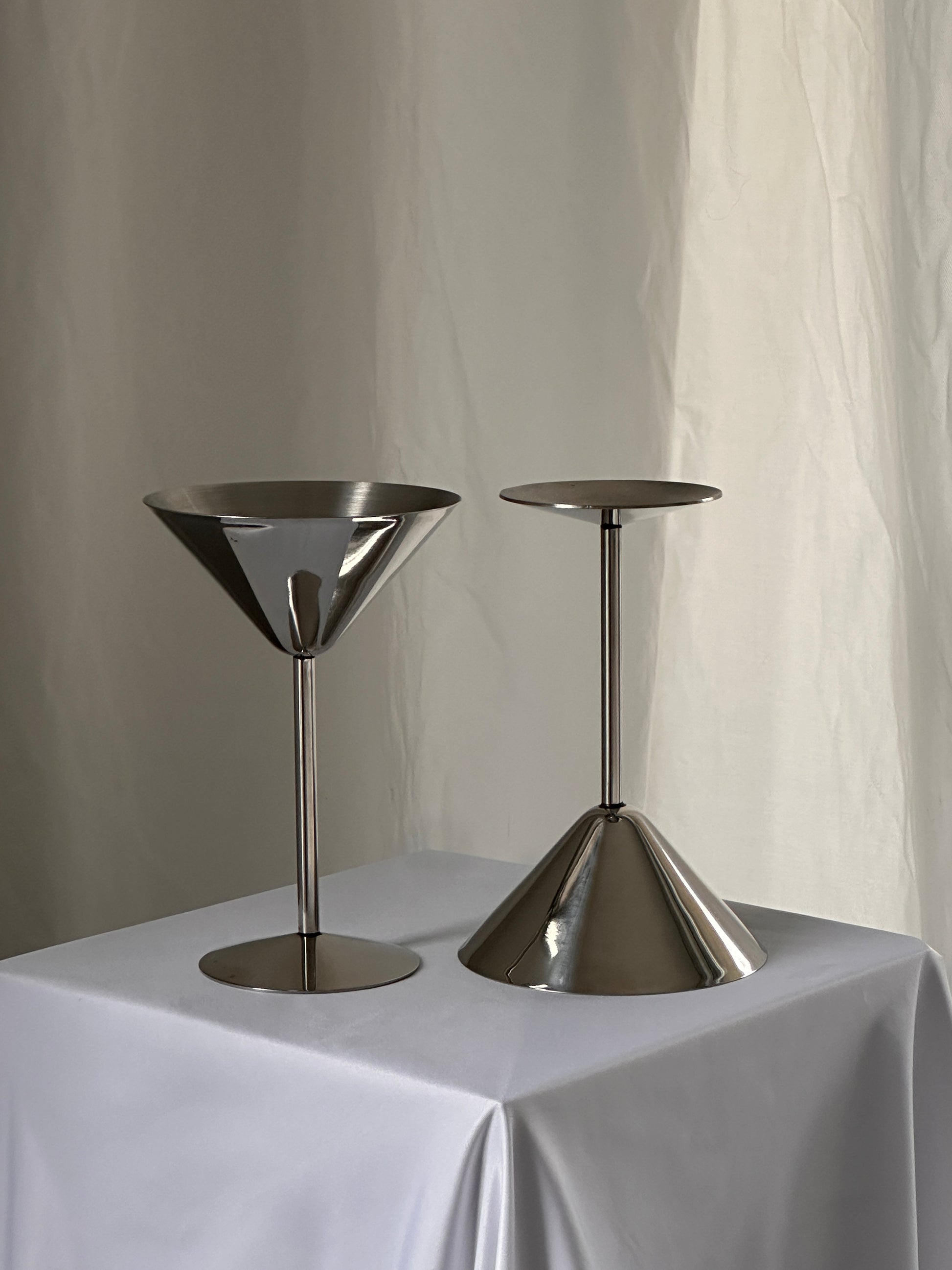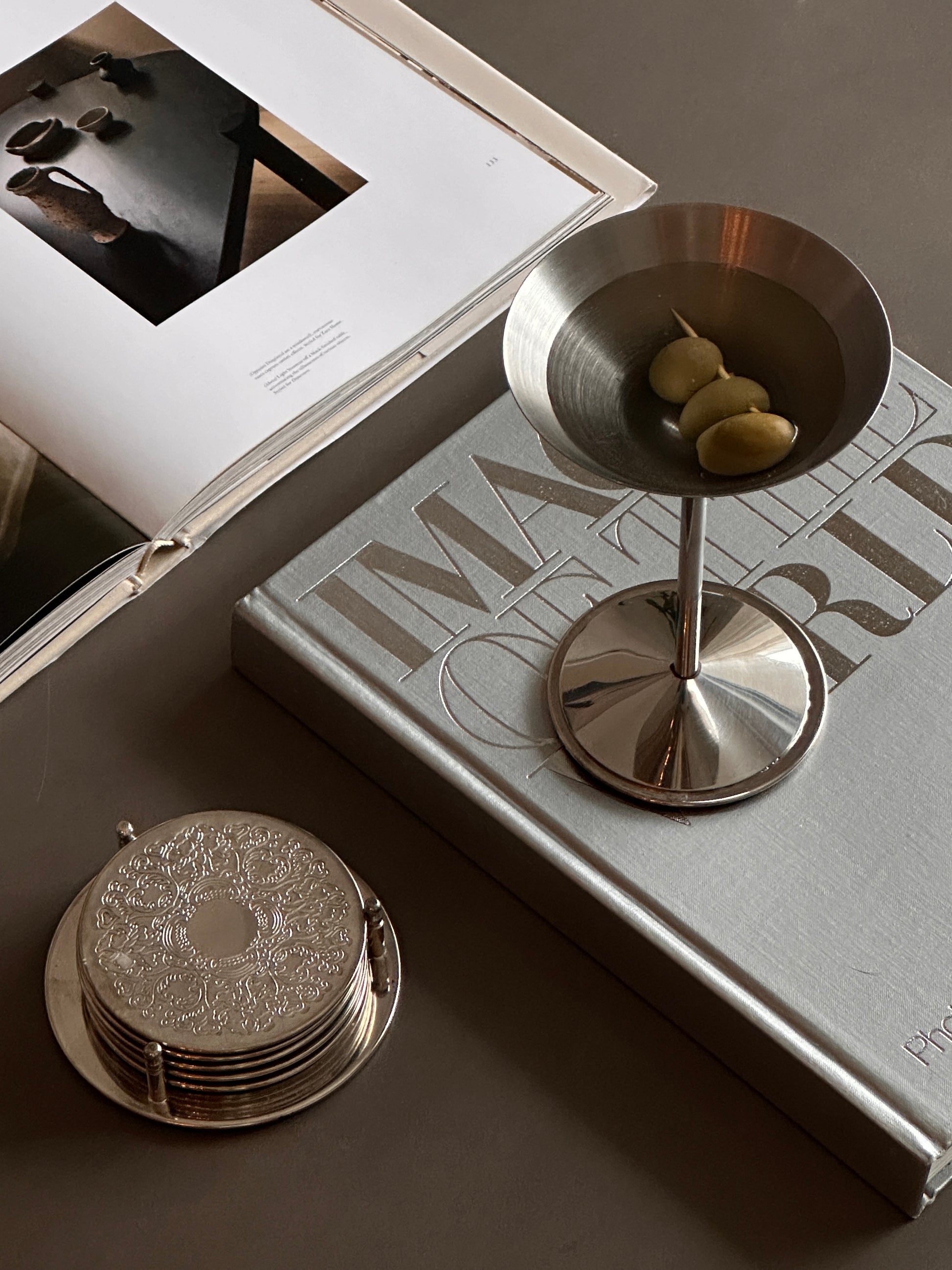 Mid-Century Chrome Martini Glasses, the perfect addition to your barware collection. The sleek and elegant design of the glasses adds a touch of sophistication to any cocktail party or special occasion.