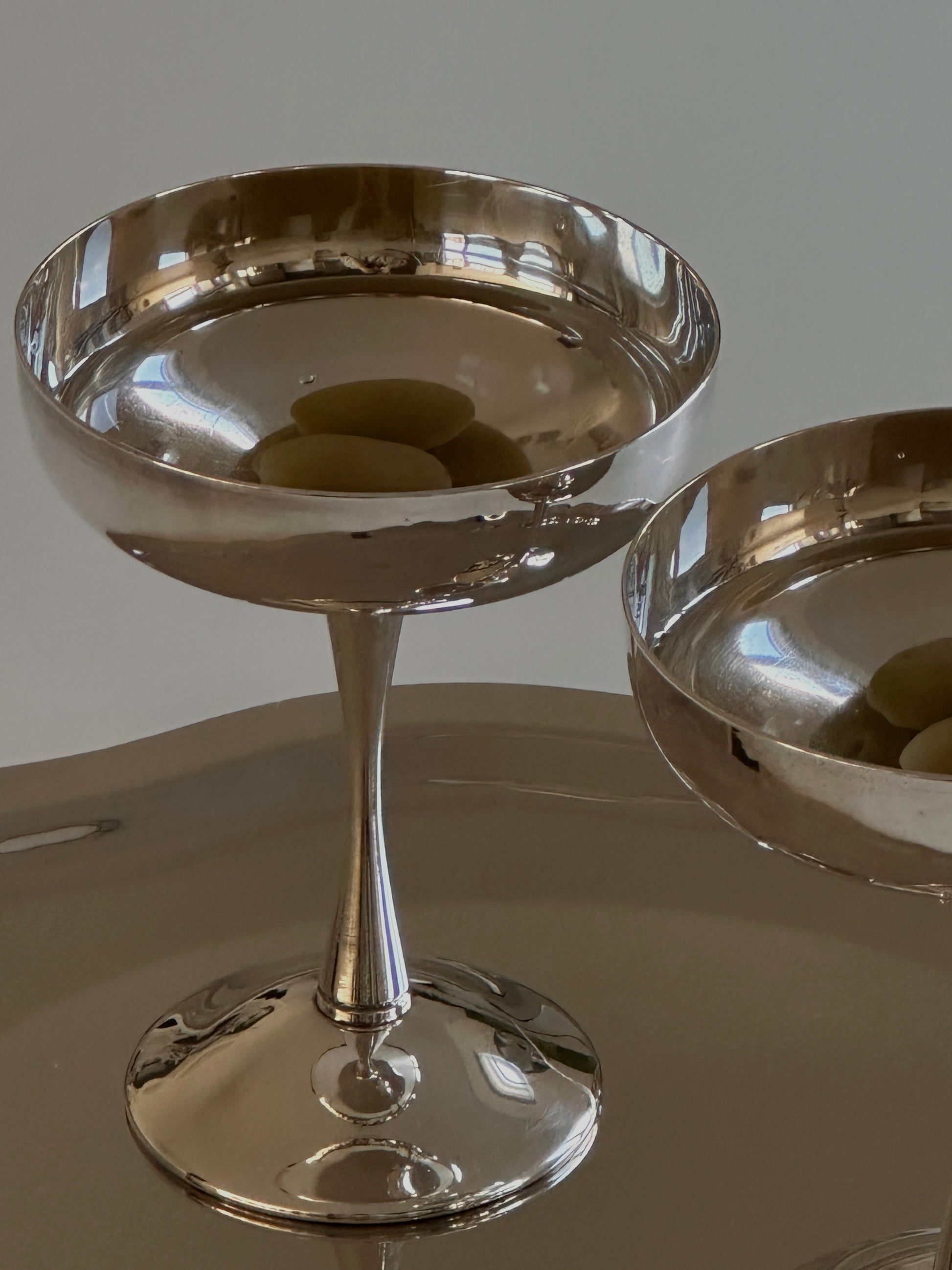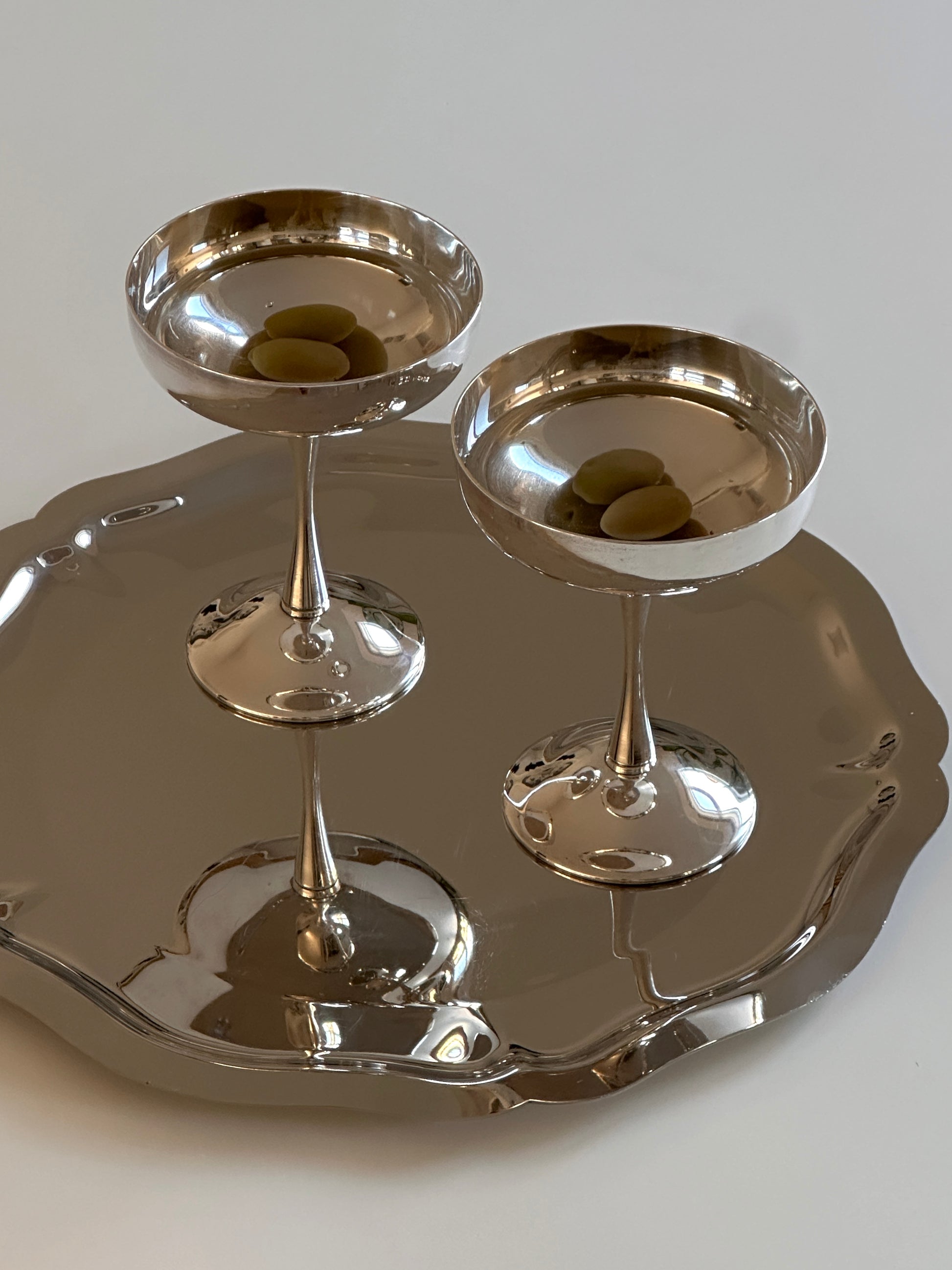 This elegant set of Silver Plated Vintage Coupes features a sleek, polished design that adds sophistication to any occasion. The versatile coupe can be used for toasting champagne or creatively serving appetizers, adding a refined touch to your table.