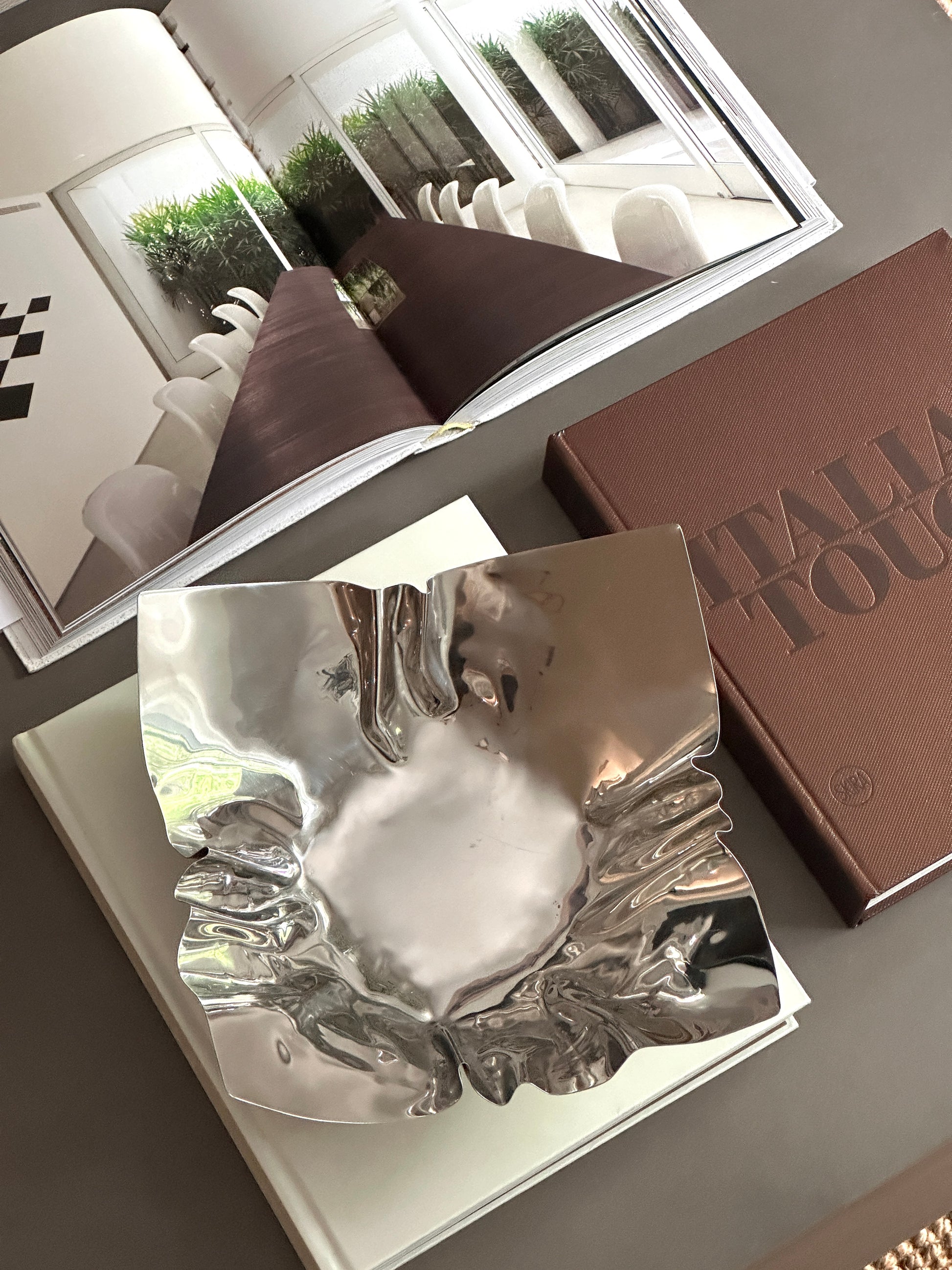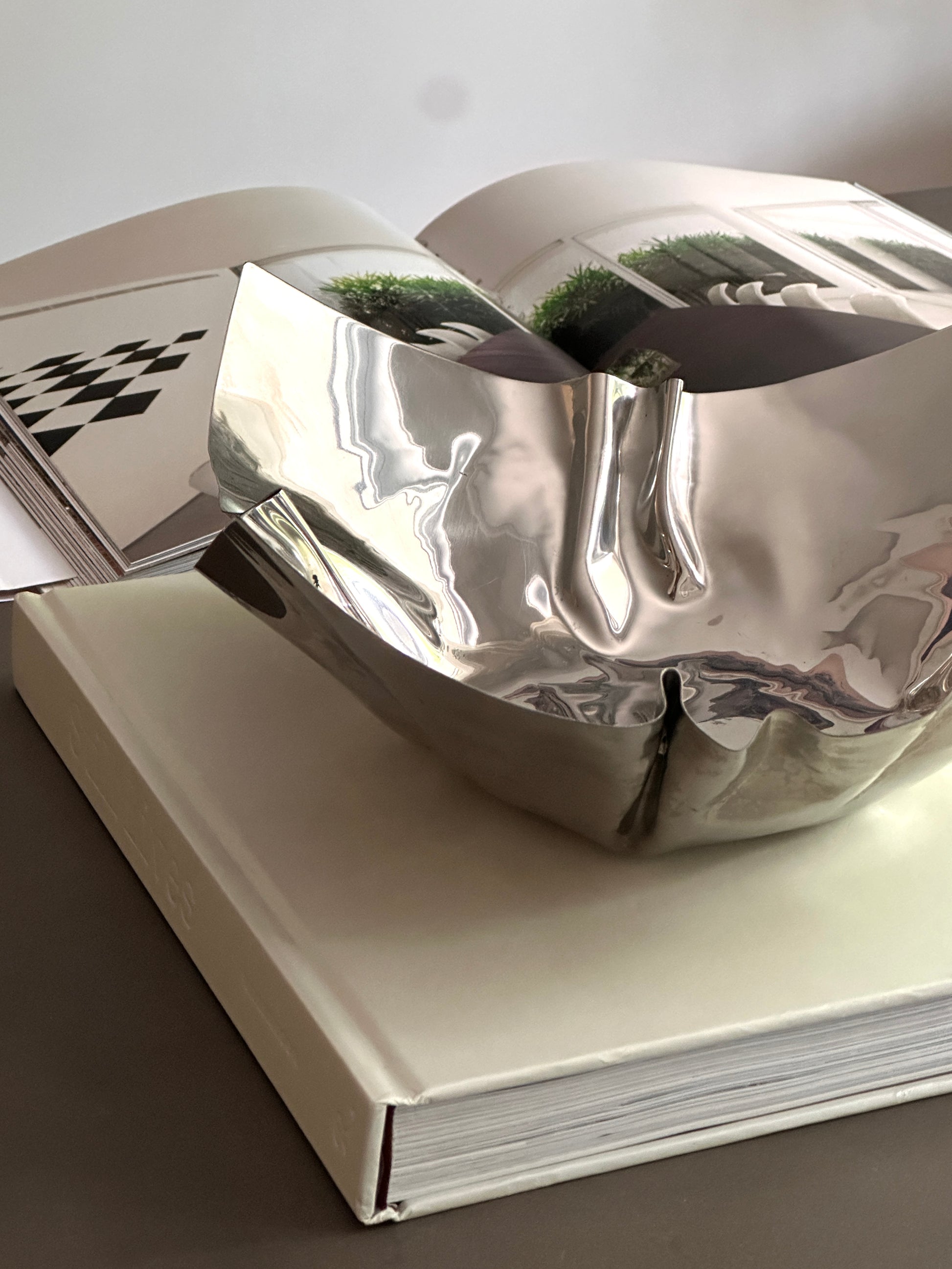 Crafted from mirror finish chrome, the bowl’s reflective surface adds a touch of modern elegance to any space. Its asymmetrical edges and unconventional shape create a dynamic visual impact, making it a conversation-worthy piece of functional art.