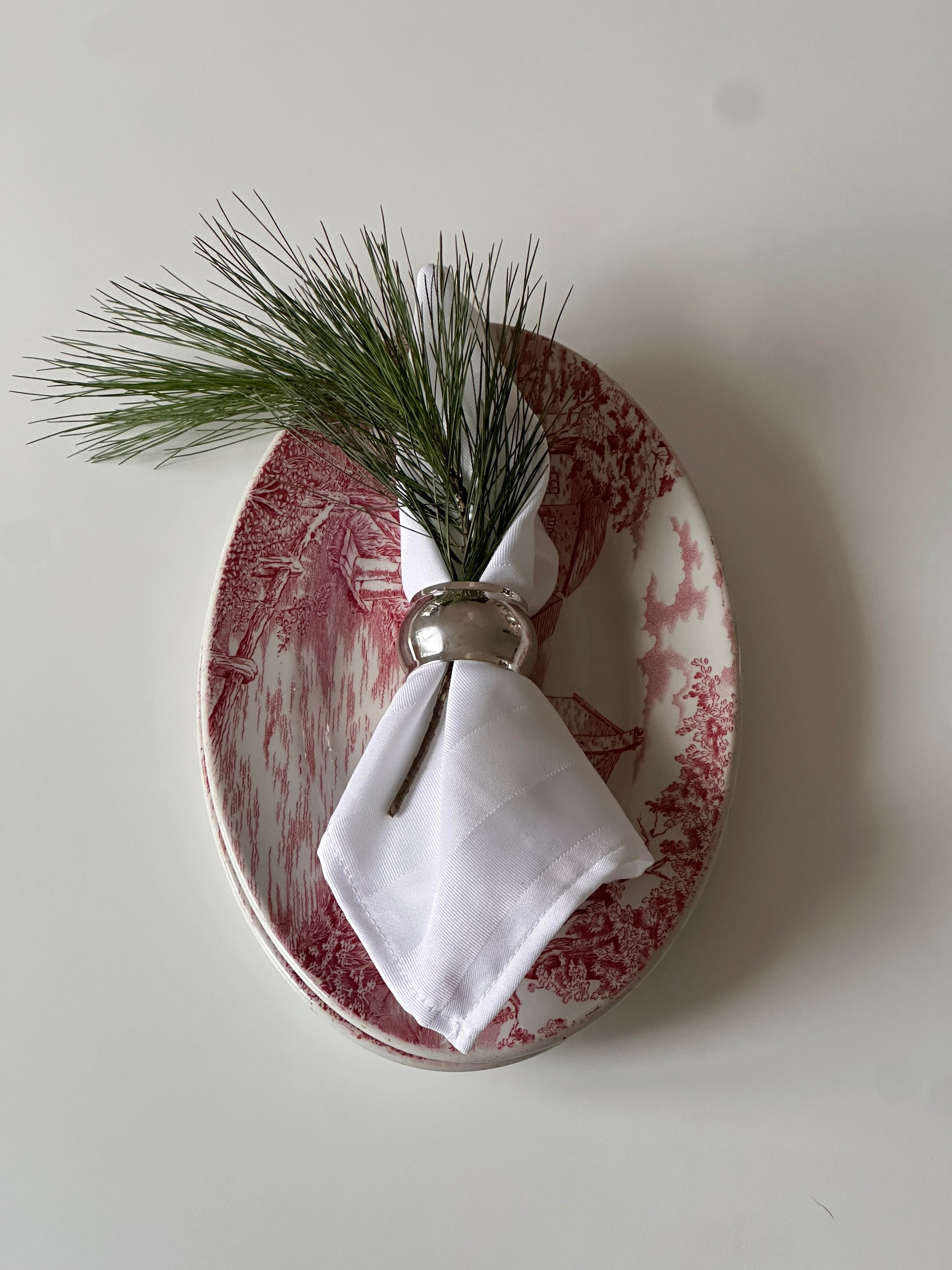 These oval plates feature a detailed red transferware design countryside farmhouse scene. Perfect for collectors or as a rustic accent for your table setting.