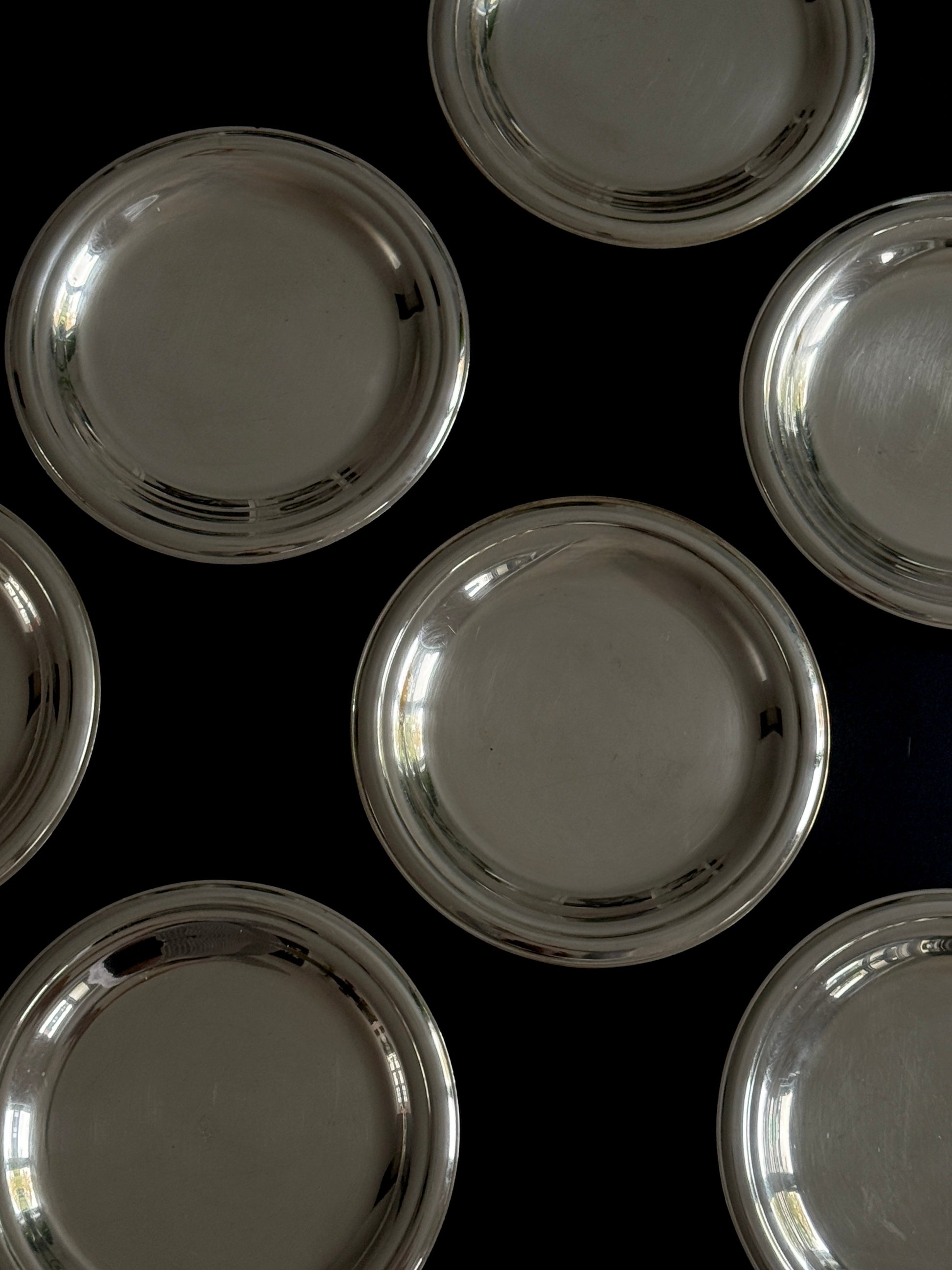 A refined set of ten silver-plated appetizer plates, each showcasing a graceful, polished finish that adds timeless elegance to any gathering — perfect for entertaining with classic sophistication.