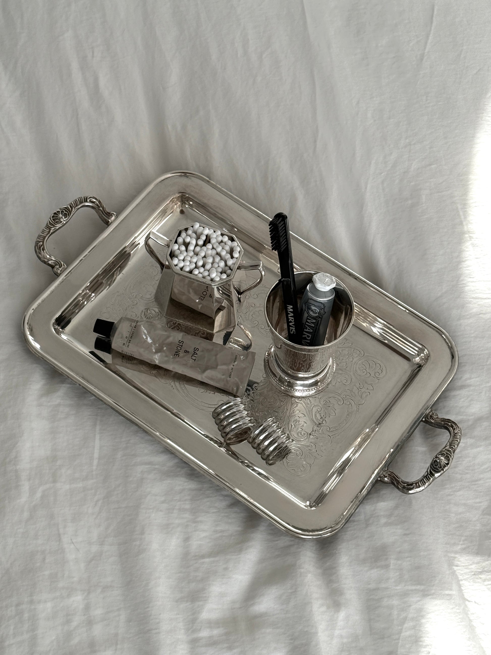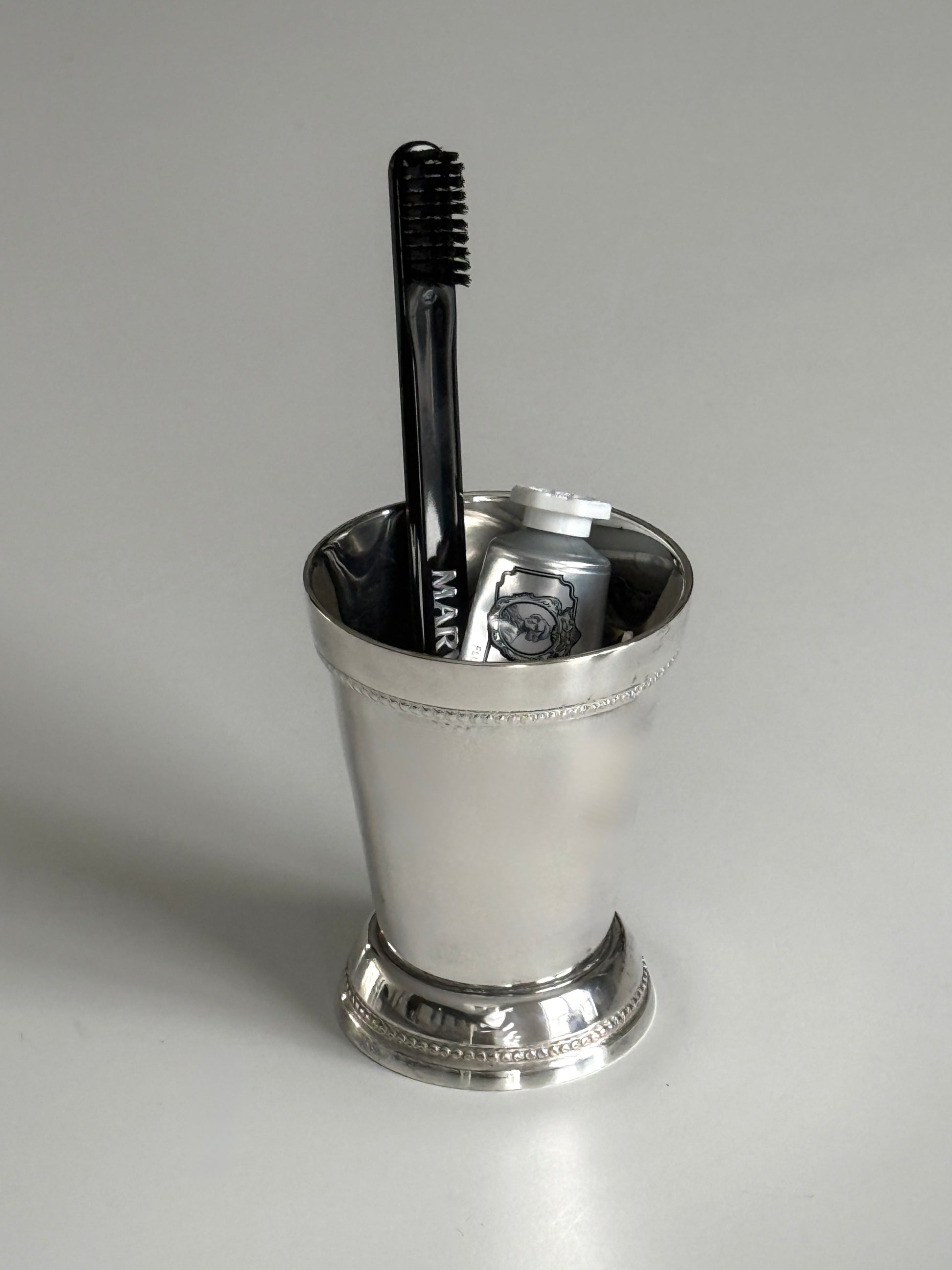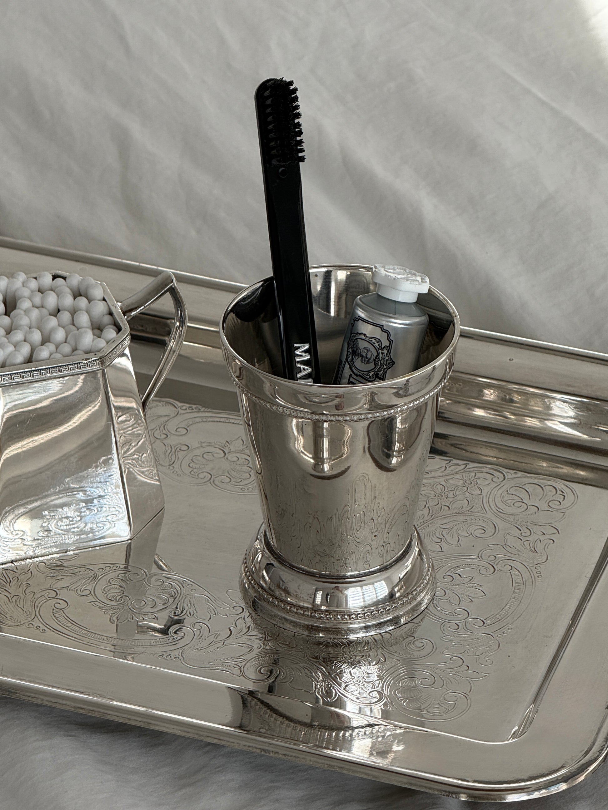 A silver-plated beaded julep cup with an engraved R/S initial beneath the base. Timeless and refined, it’s equally elegant on a vanity—ideal for makeup brushes or small essentials—an heirloom accent with quiet character.