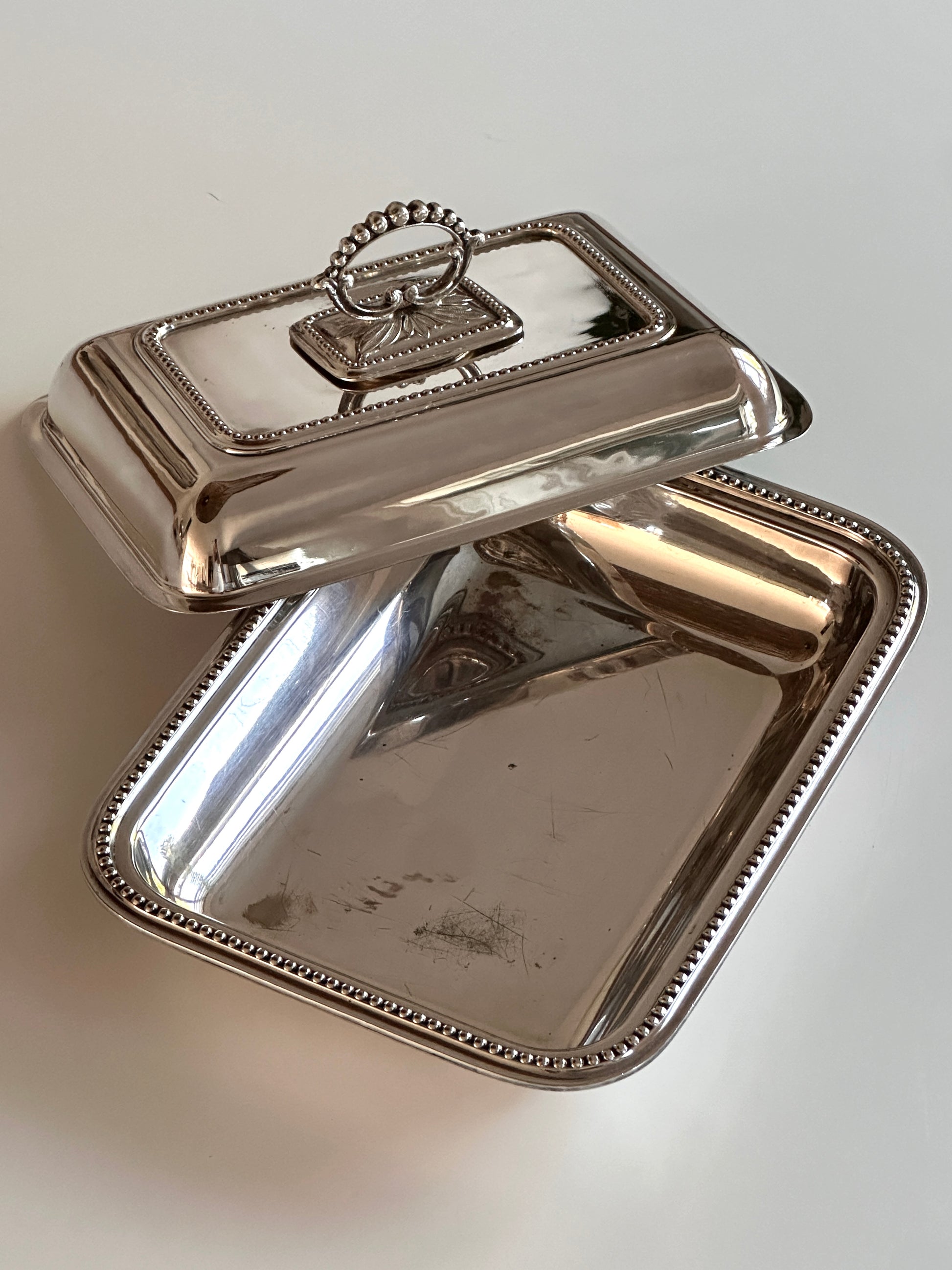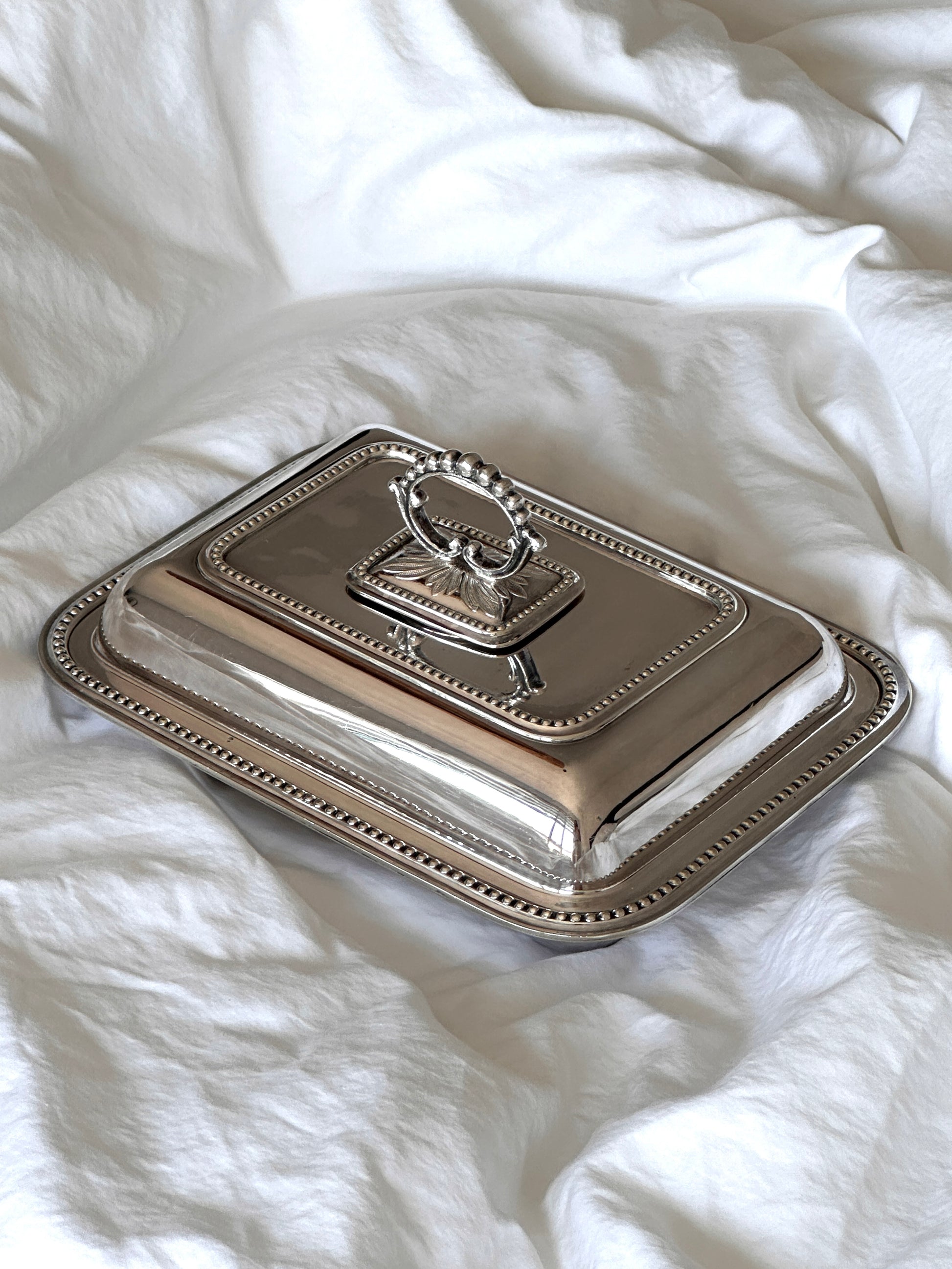 Add timeless elegance to your dining with this silver-plated entrée dish. Featuring a sleek rectangular design and a removable key handle for easy serving, it’s both functional and stylish. Perfect for enhancing your table’s aesthetic, its polished finish brings sophistication to any occasion.
