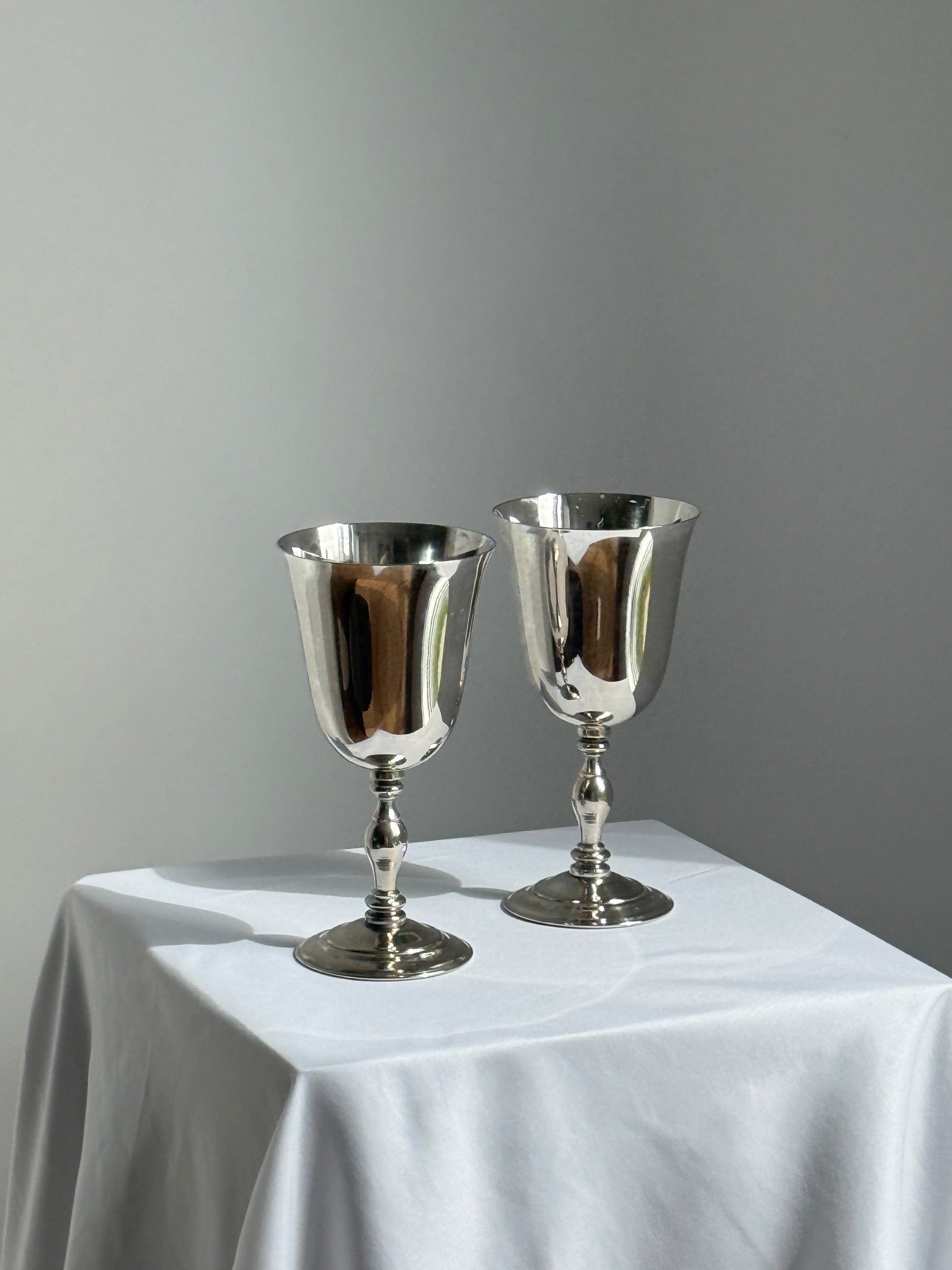 Elegant and timeless, this pair of silver-plated Spanish goblets features graceful silhouettes and a lustrous finish—perfect for special toasts, intimate dinners, or as a refined decorative accent.