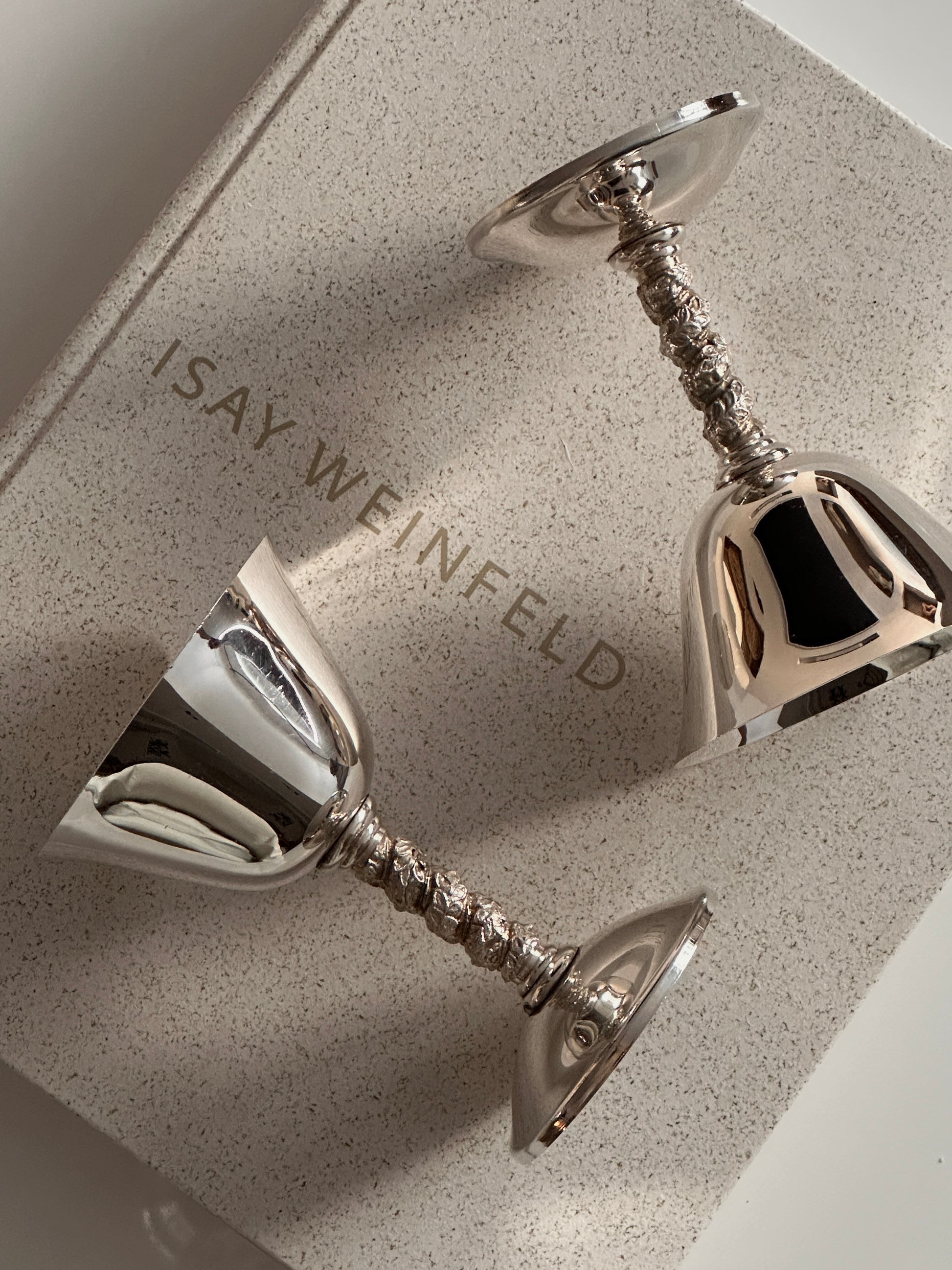 Exude elegance with these silver plated Spanish goblets, featuring a beautifully twisted stem that adds a touch of sophistication to any setting. Its polished silver finish enhances the intricate detailing, making it an ideal choice for special occasions or as a decorative accent.