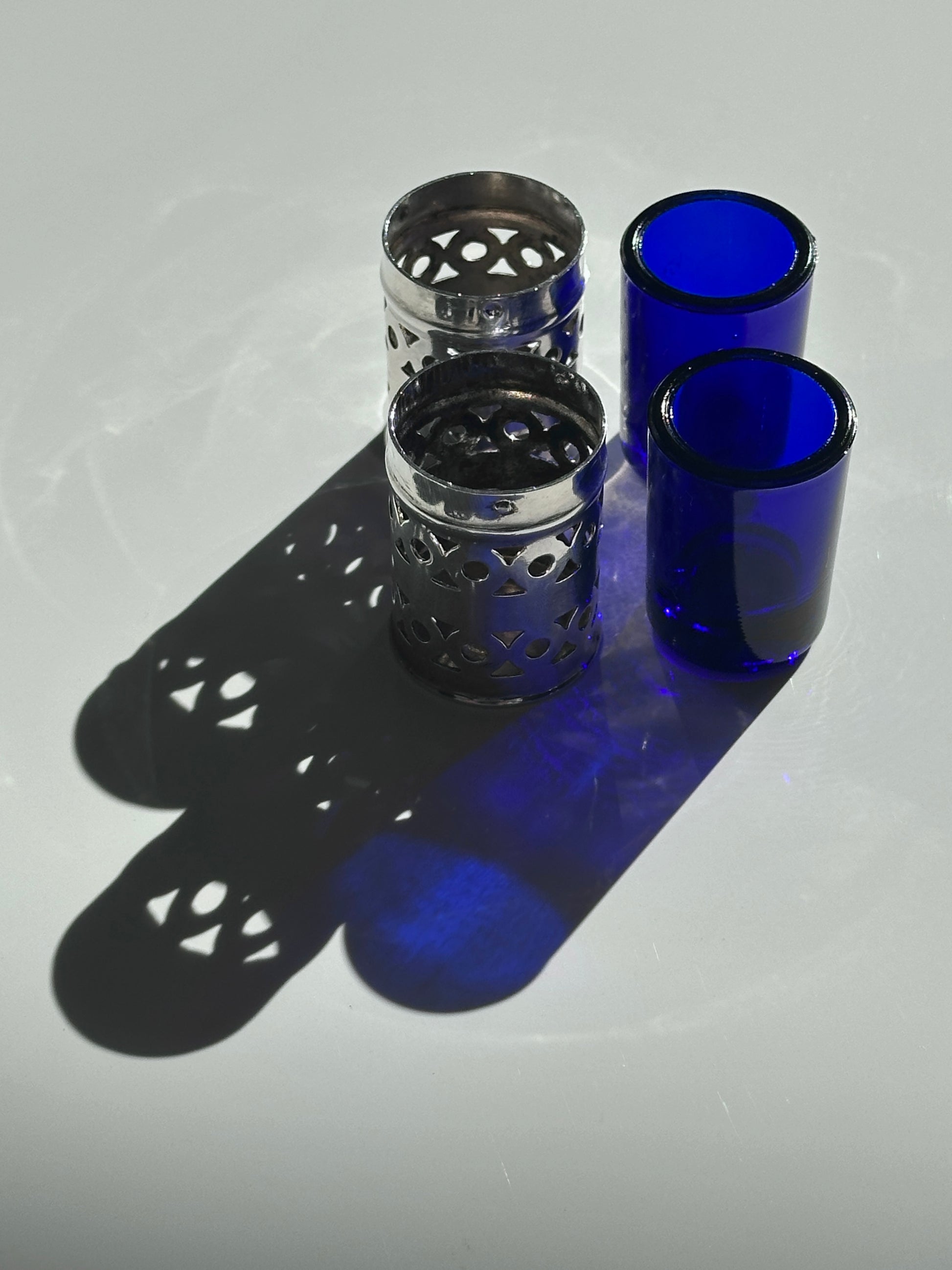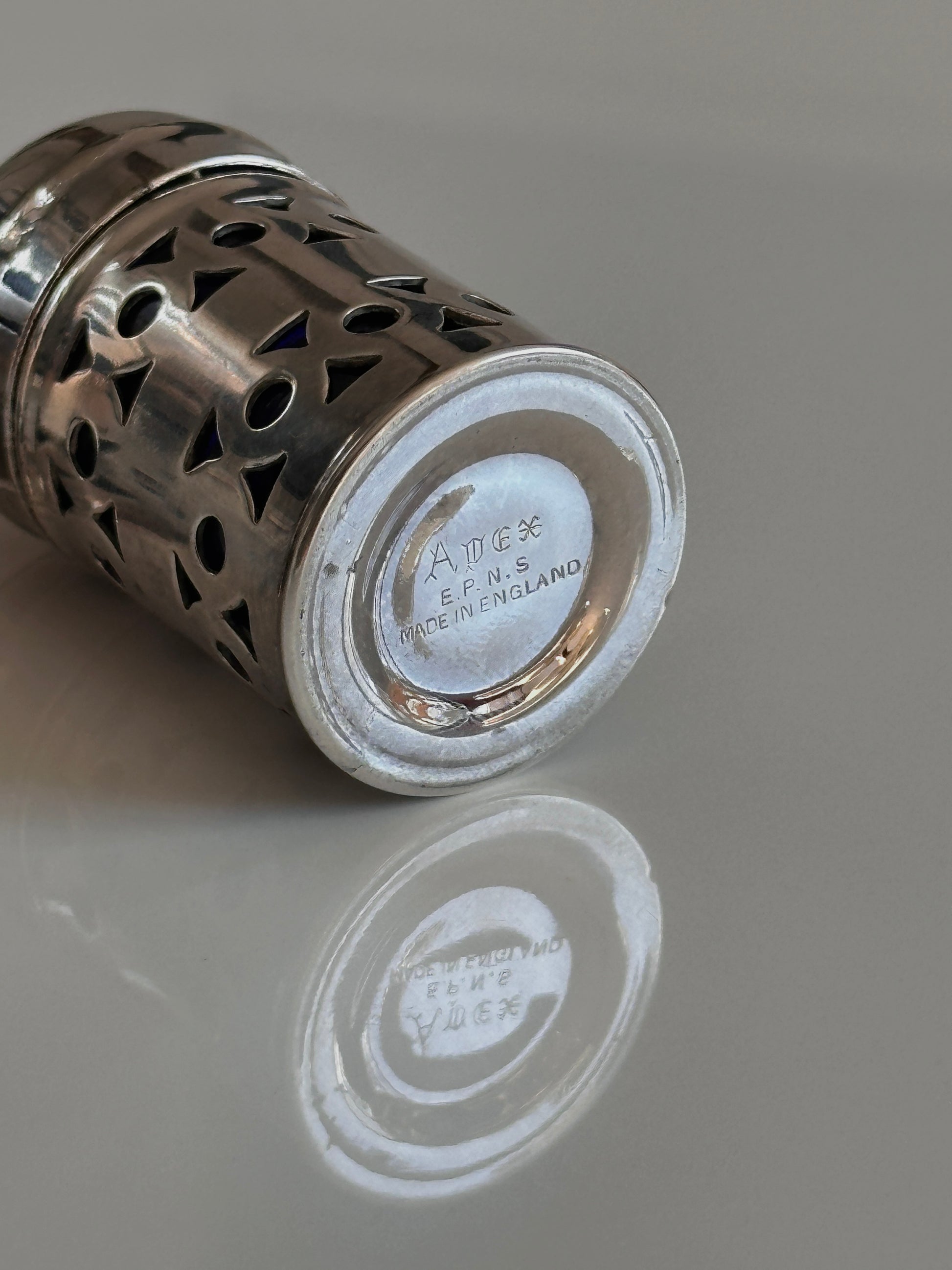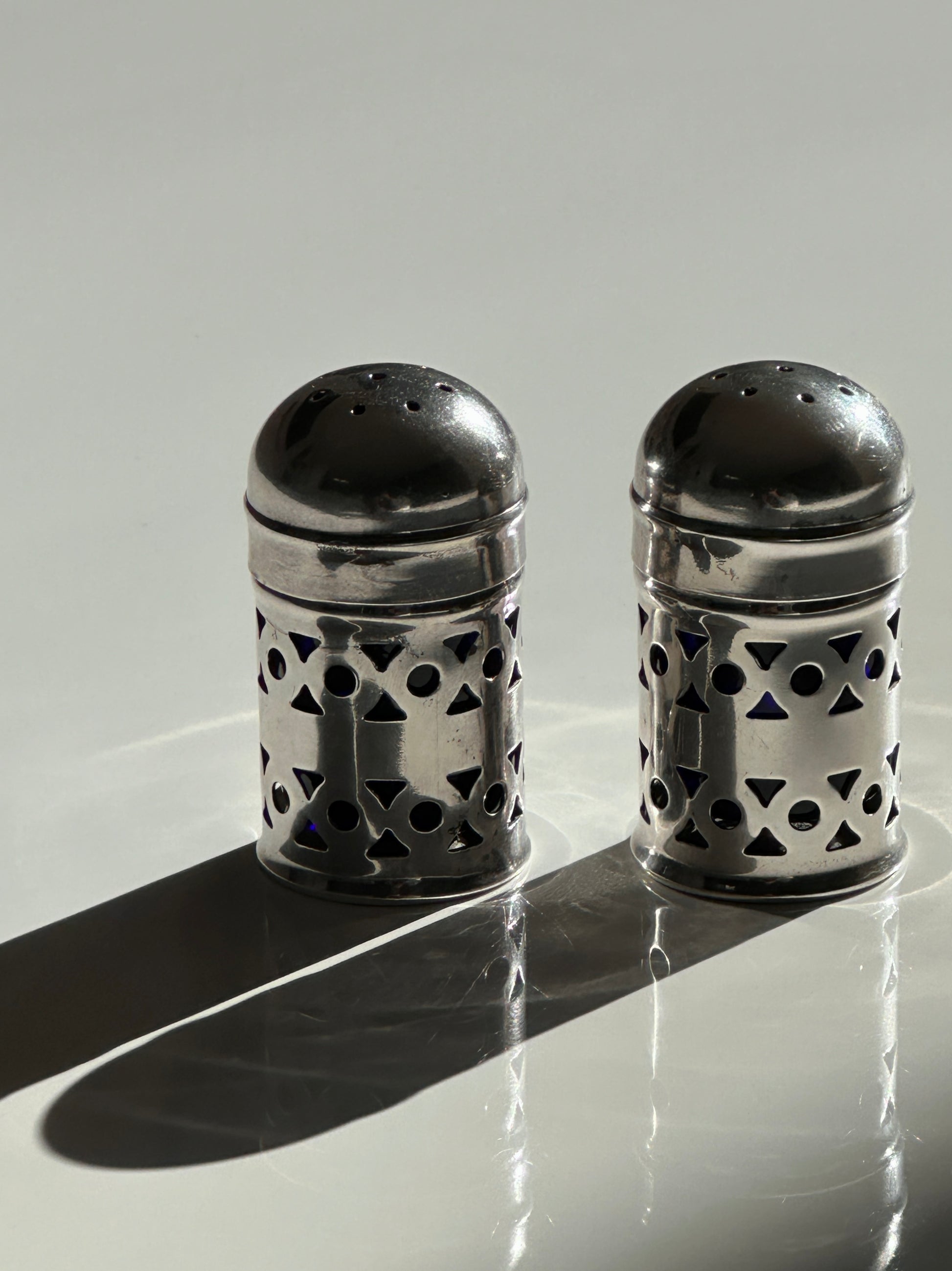 These mini art deco silver plate salt and pepper shakers bring a delicate vintage appeal to your dining table. Featuring intricate cut-out designs, cobalt blue liners, and a sleek polished finish, they are both functional and decorative.