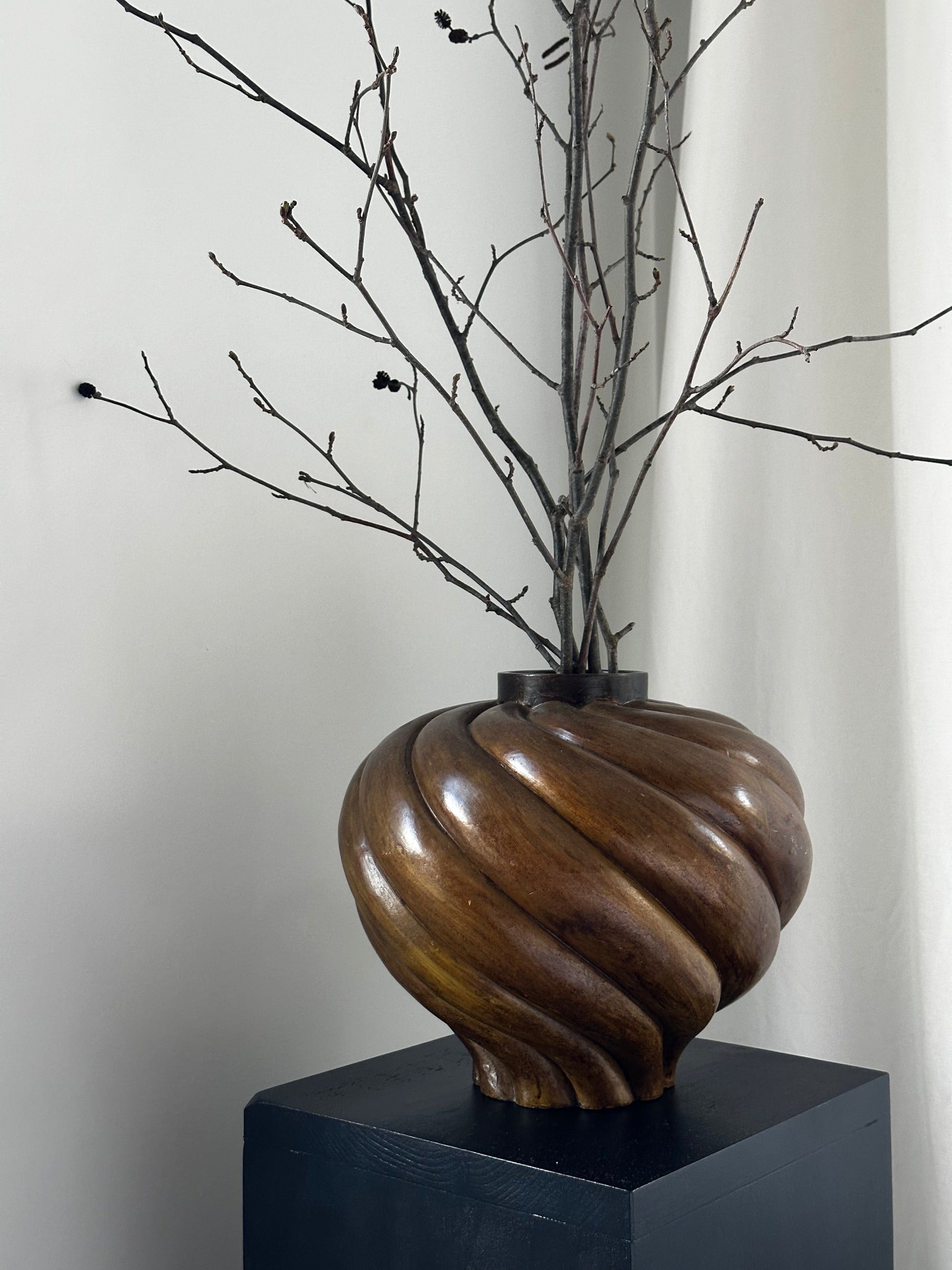 Add a touch of natural beauty to your home with this exquisite spiral carved vessel made of wood. This vessel features spiral carvings that add depth and dimension to the overall design. The dark warm tones and natural grain of the wood create a sense of warmth and serenity, making it a perfect statement piece.