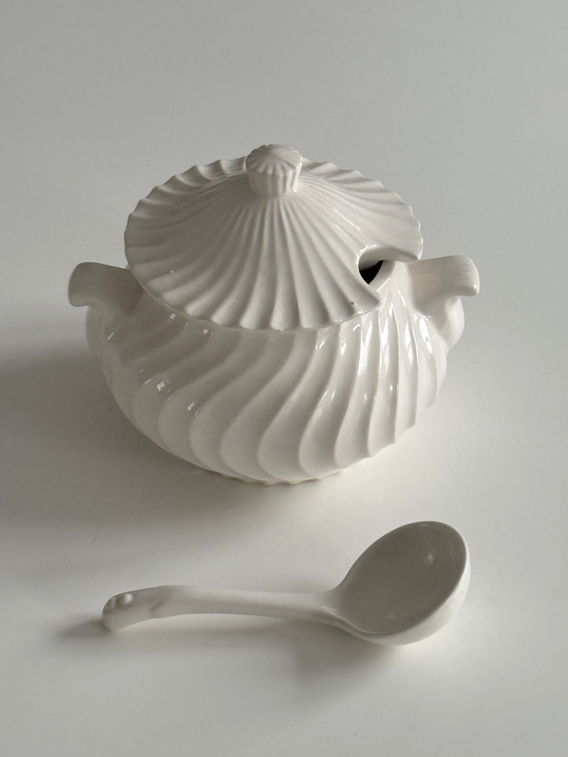 This Swirled Ceramic Bowl comes with a matching lid and serving spoon, combining elegance and functionality for effortless serving.