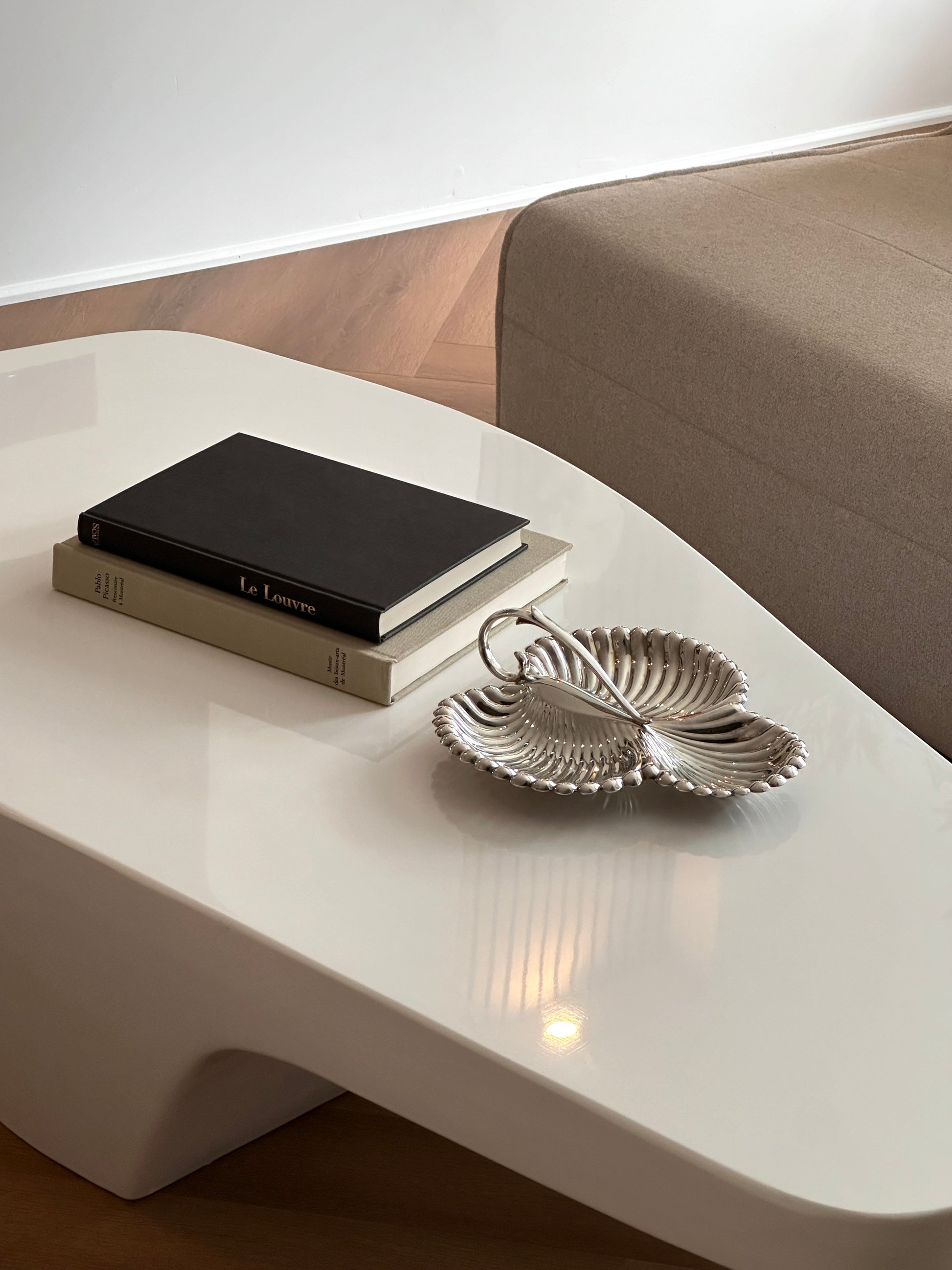The Triple Shell Silver Plate Dish features three shell-shaped sections and a polished silver finish, perfect for serving or as a decorative piece. Its timeless design adds elegance to any setting.