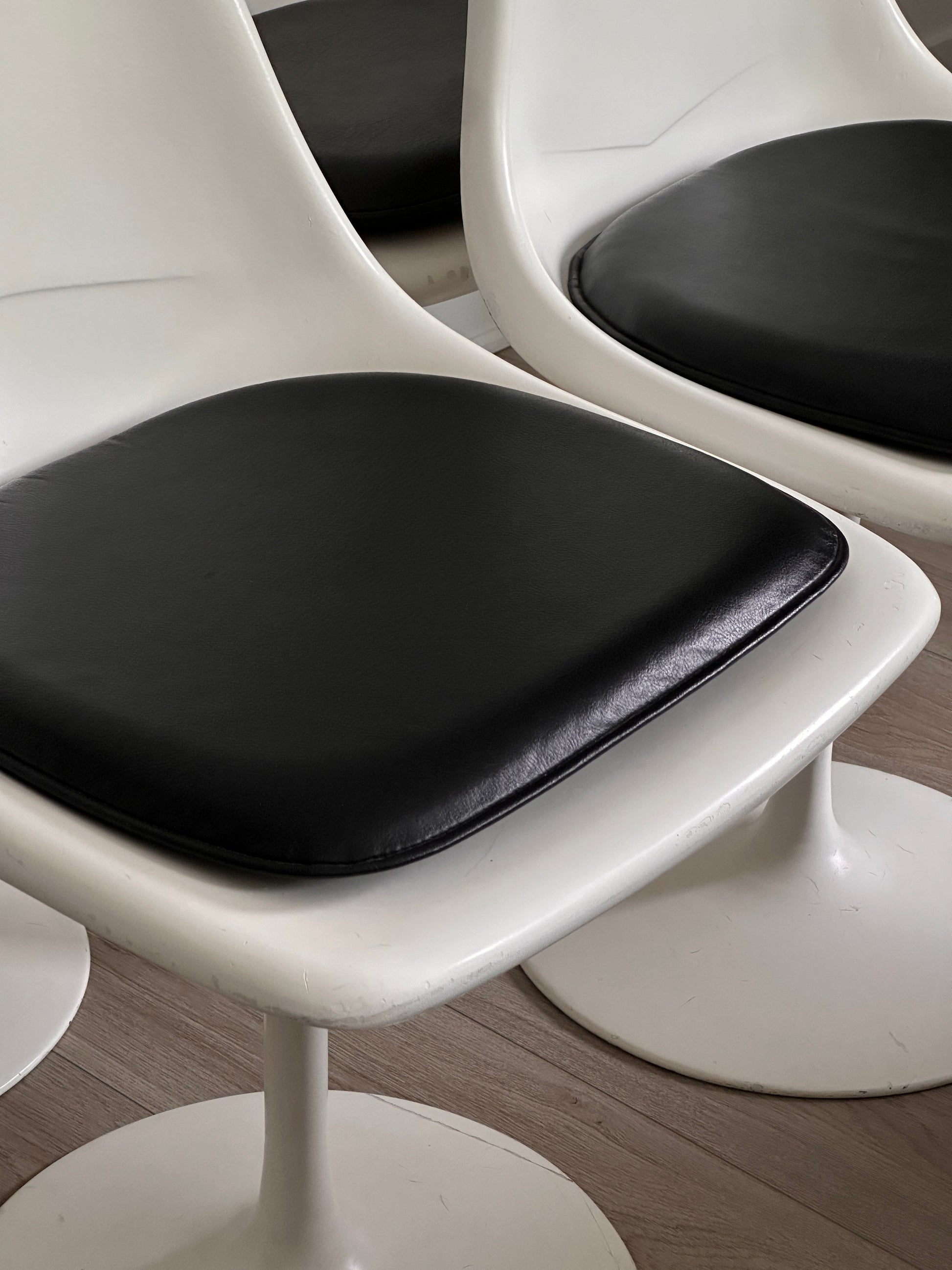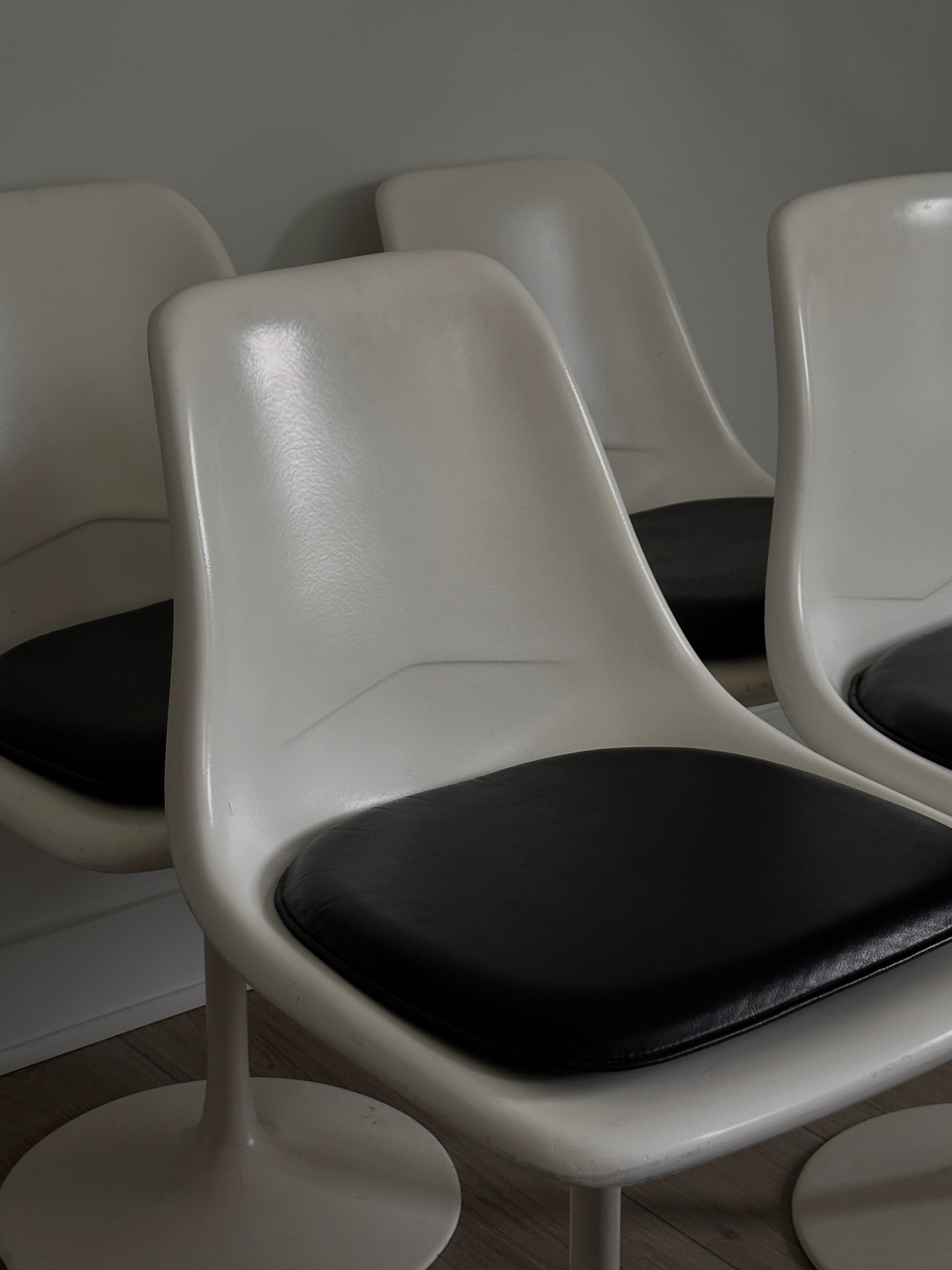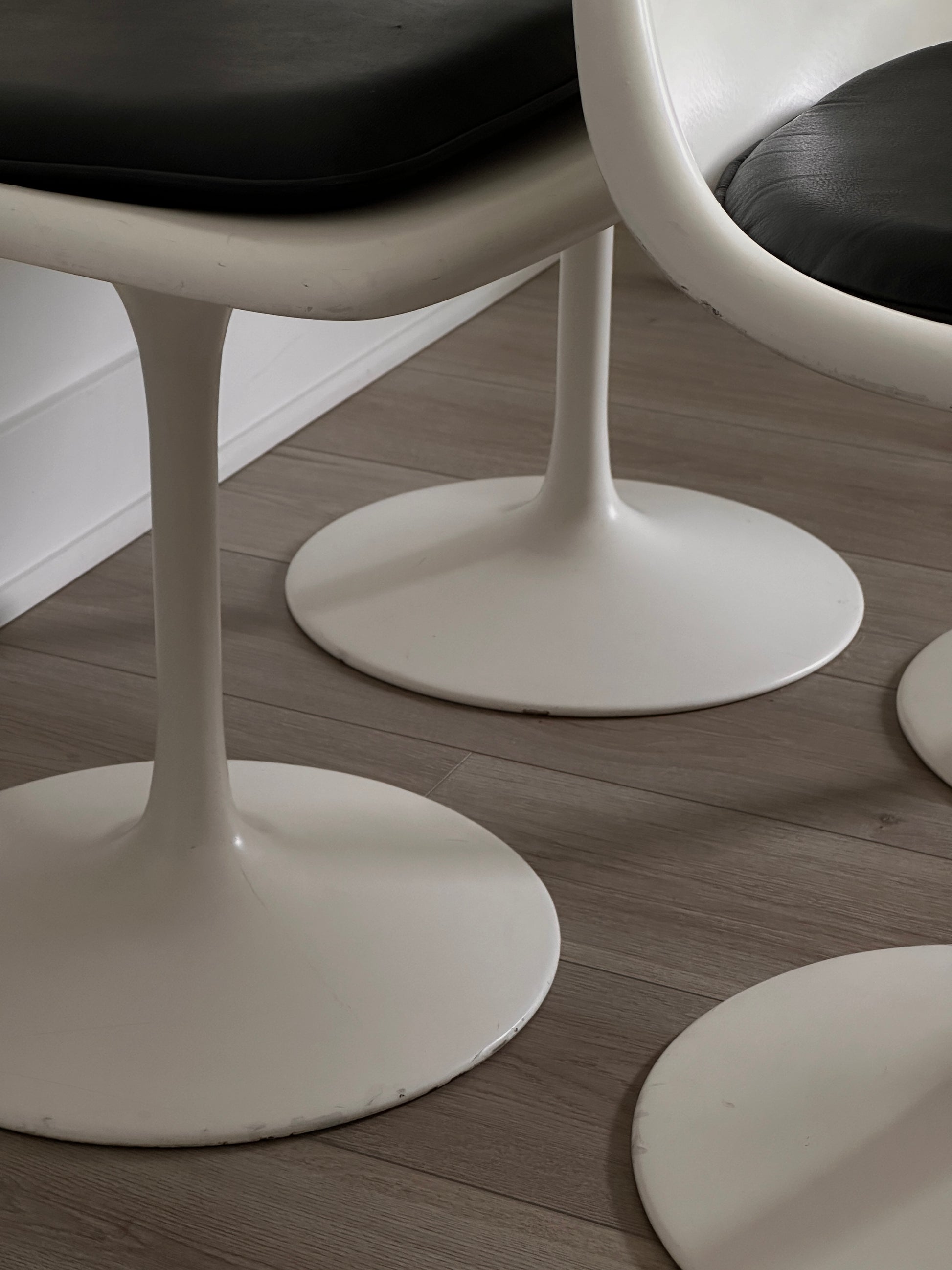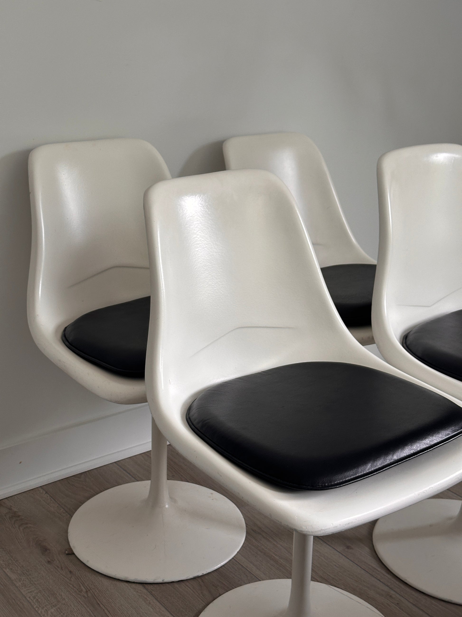 Iconic White Tulip Dining Chairs from the 1970s, a mid-century modern design. Crafted from durable fiberglass, these chairs feature a sleek, white tulip base that defines the elegance of the era. The black leather seating adds a touch of luxury and contrast, ensuring both comfort and style. Showcasing very minor wear due to age, these chairs embody authenticity and character. Perfect for adding a vintage flair to any dining space.