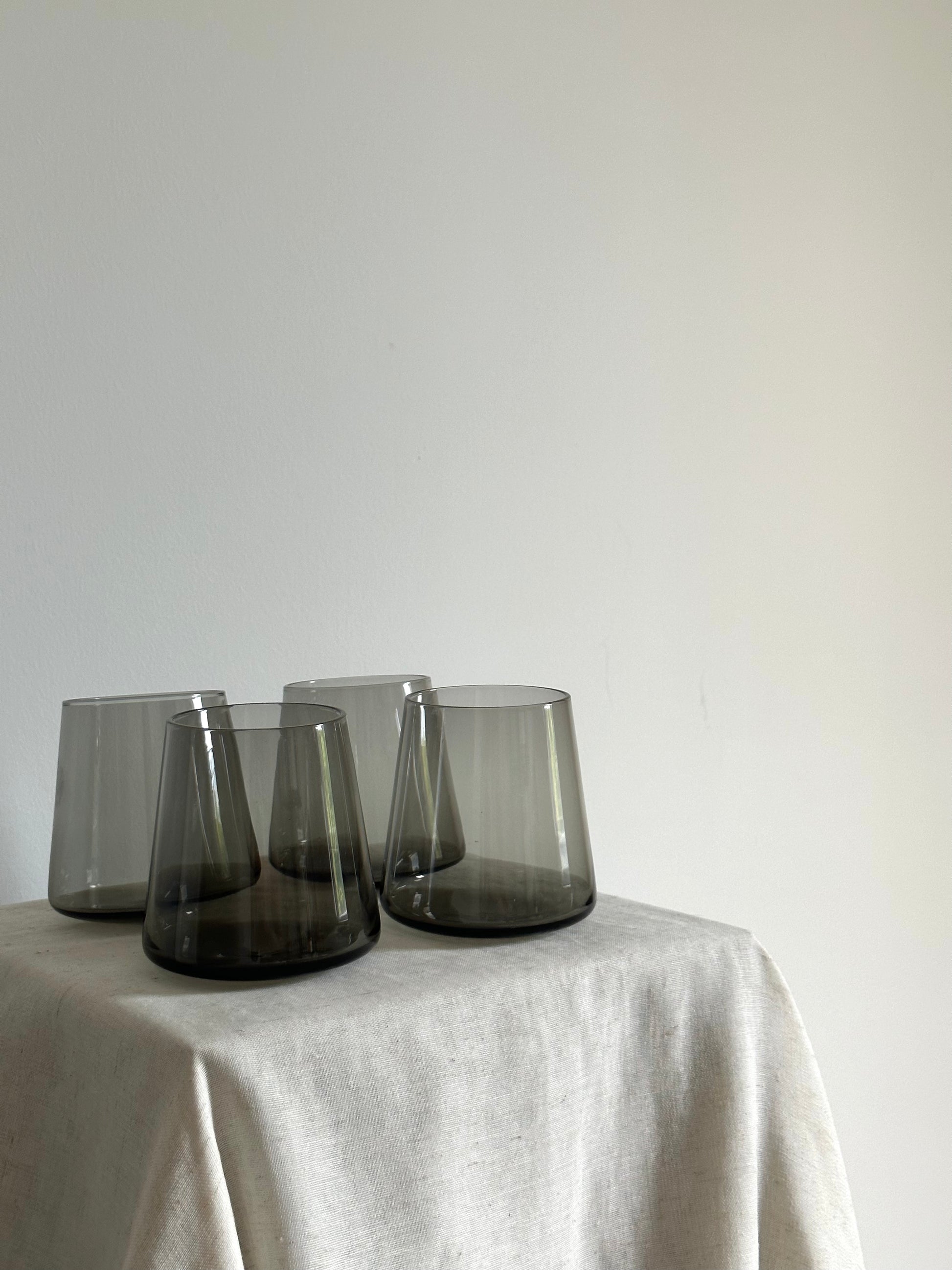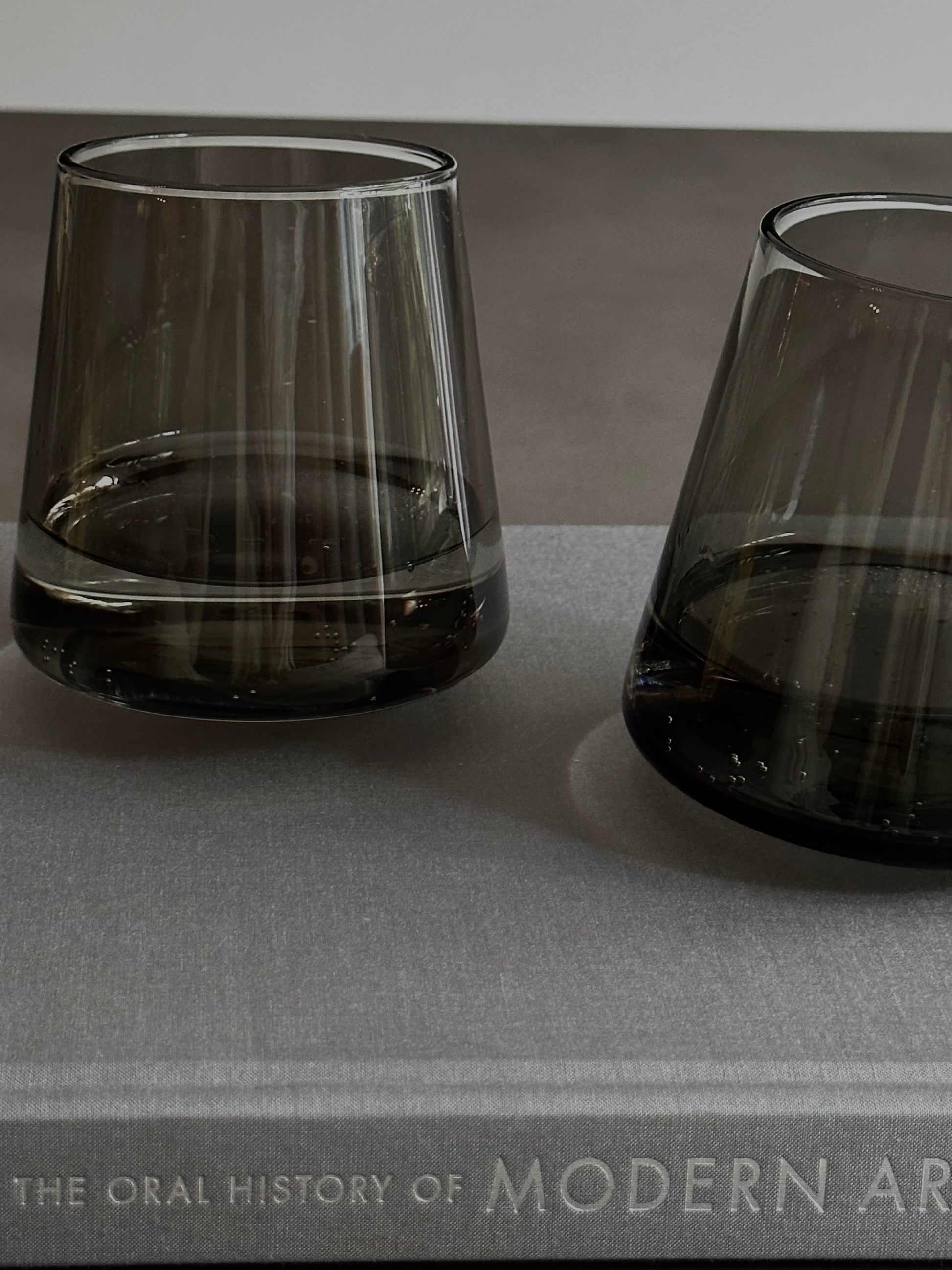 Putting a moody twist on a timeless dining essential, the smokey grey drinking glass introduces a sense of drama to your collection of glassware. Its alluring tapered design brings a touch of refined style, adding an elegant aura to your dining table arrangement or when showcased on an open shelf.