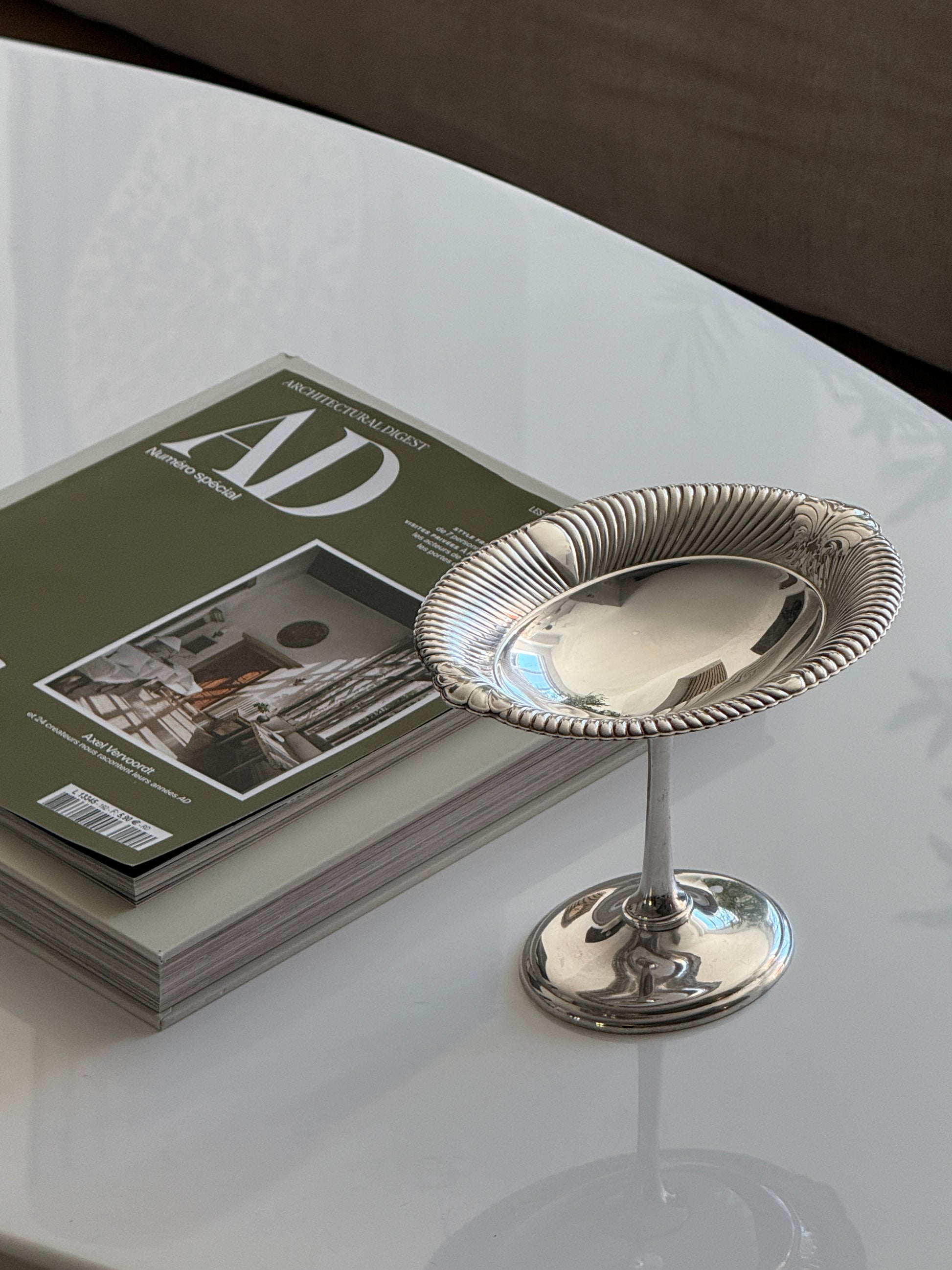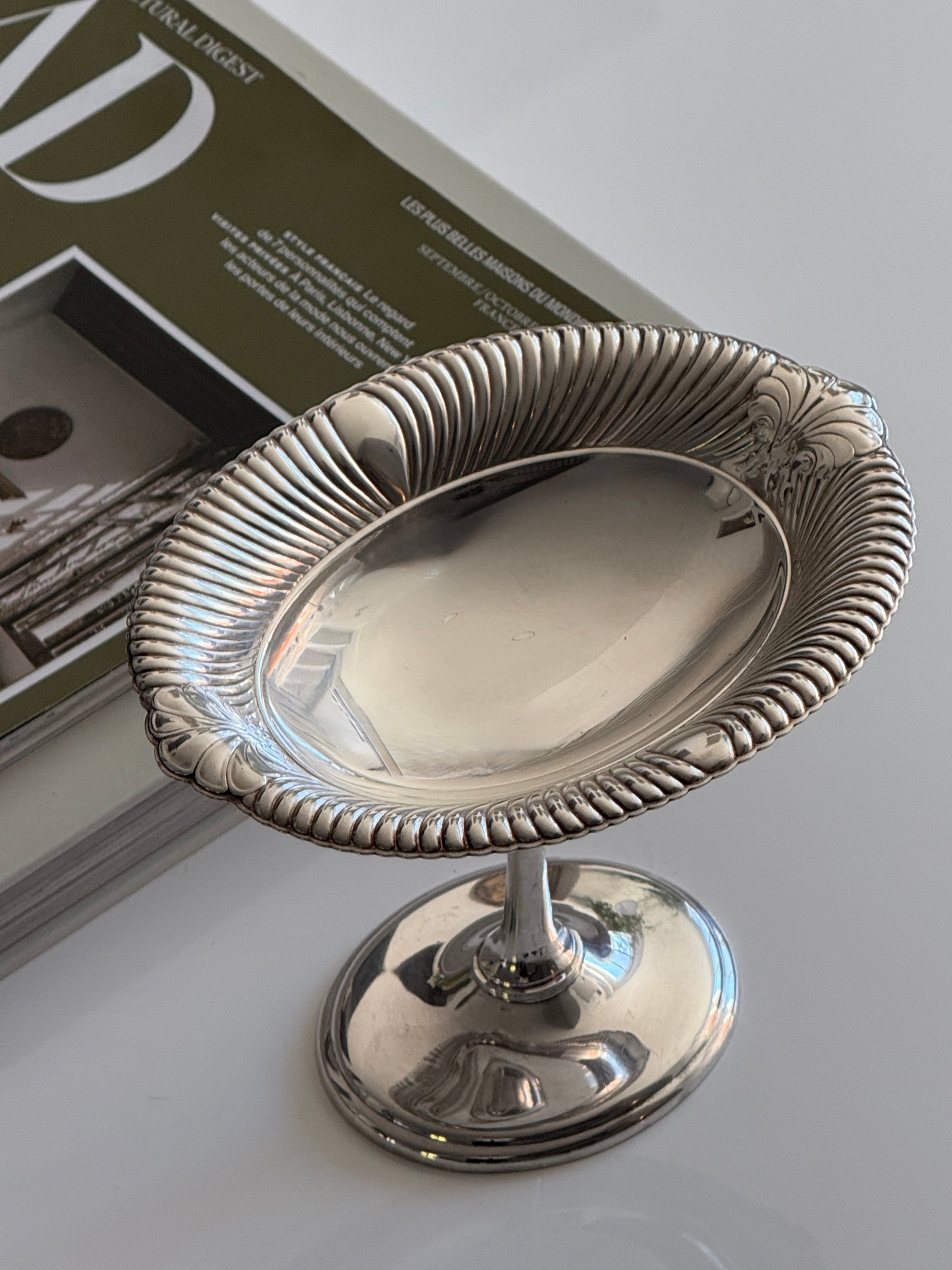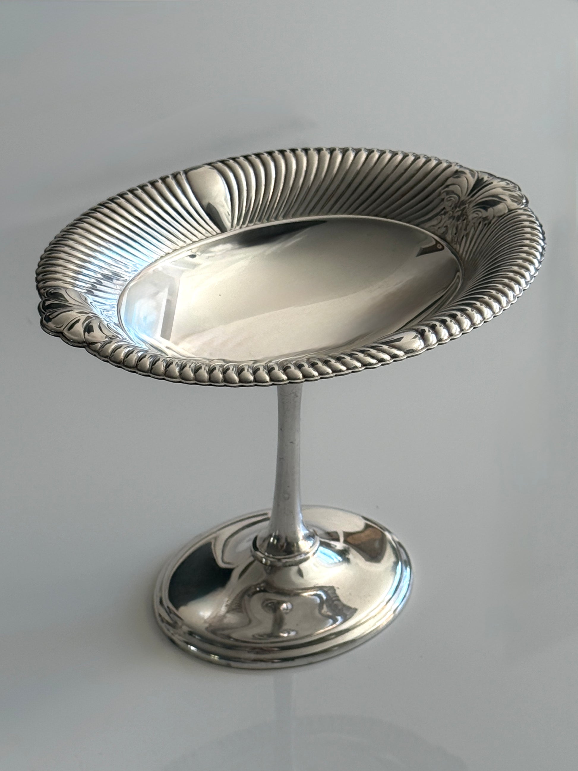 An ornate silver-plated pedestal dish from the 1940s, showcasing scalloped edges and intricate detailing. Its elevated silhouette and timeless craftsmanship make it a striking centerpiece.