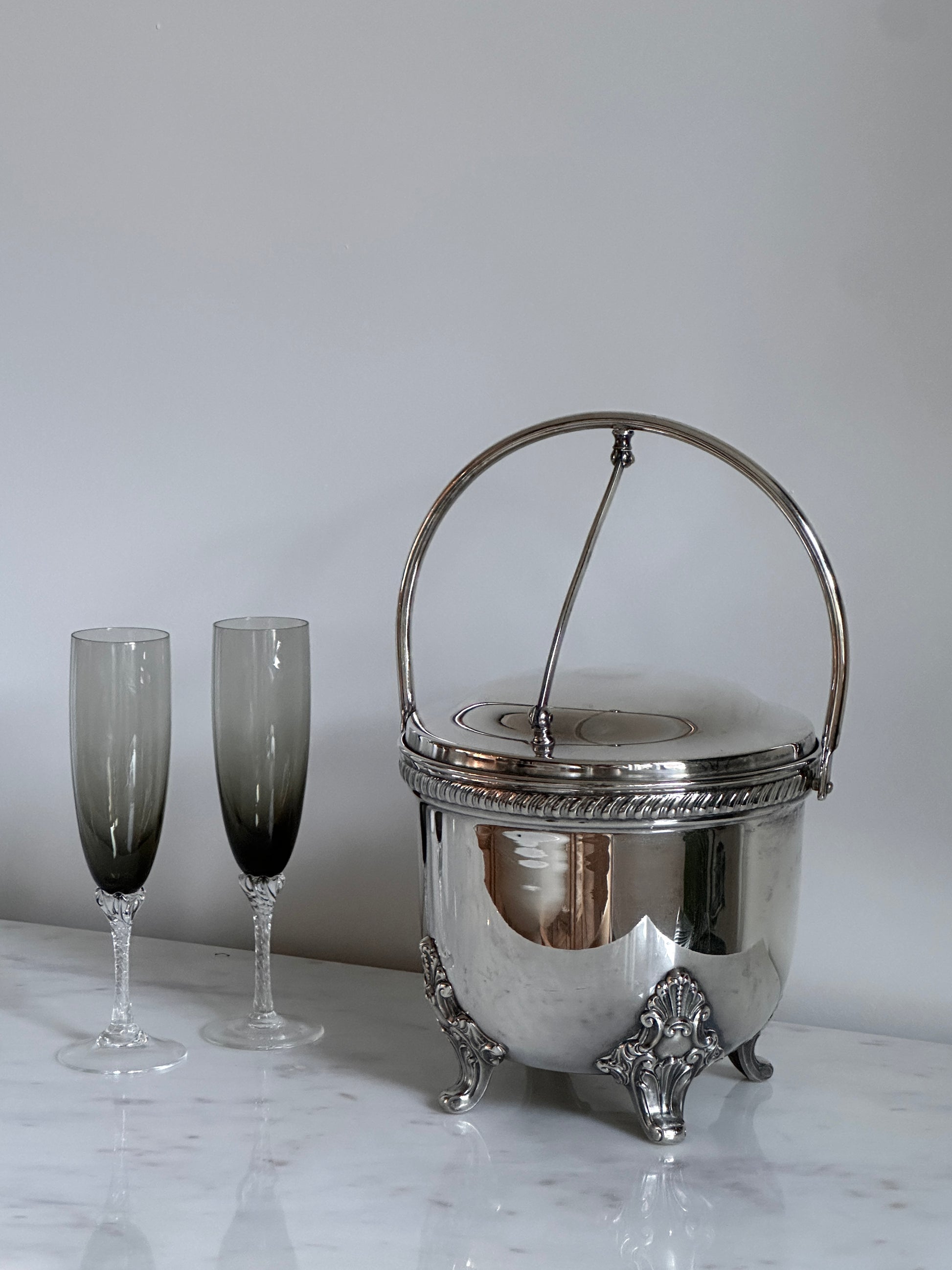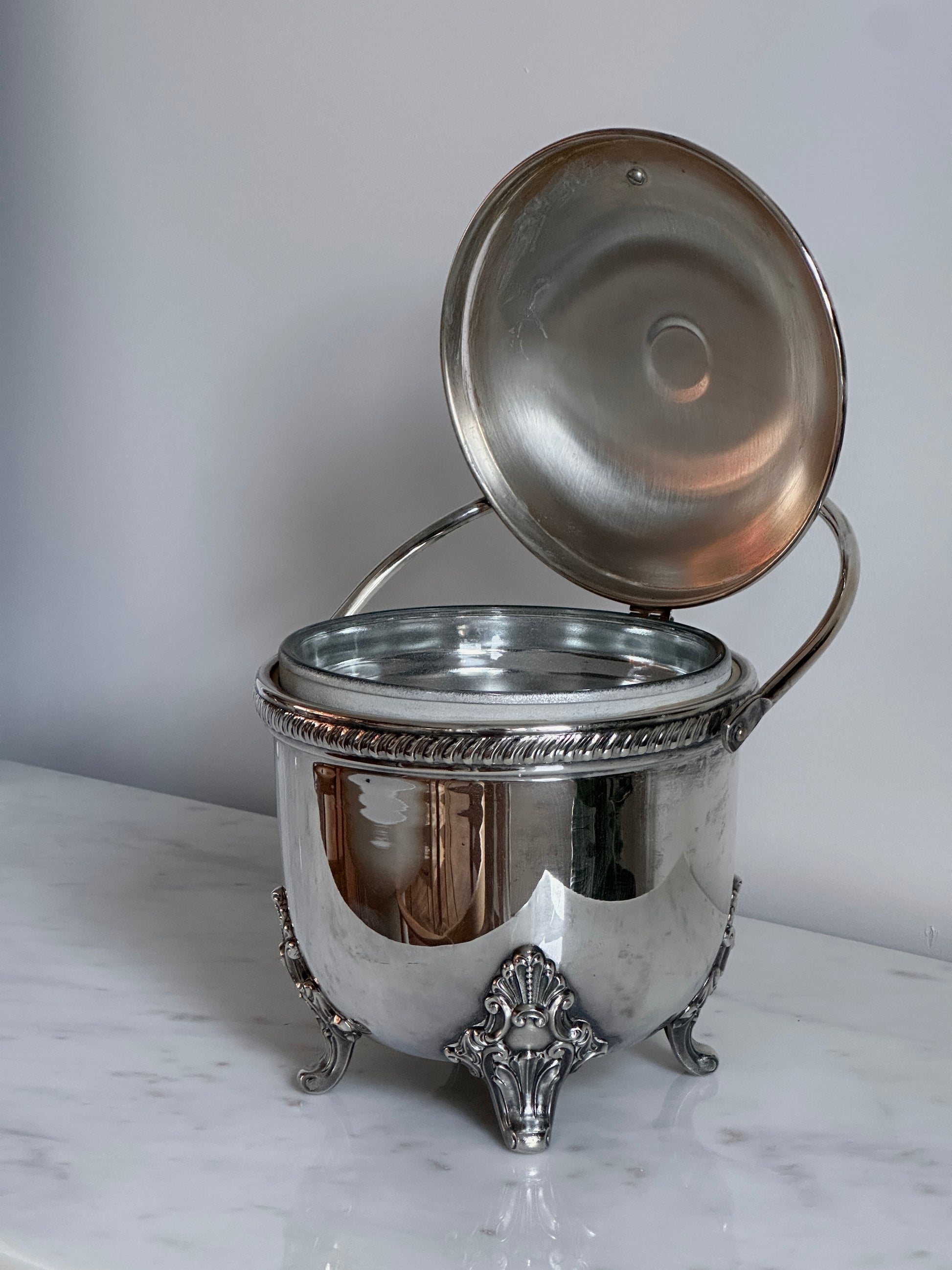 Elevate your entertaining with this polished vintage silver ice bucket. Featuring intricate, detailed feet and a sleek finish, it combines timeless style with function. Perfect for keeping drinks chilled while adding a touch of elegance to any space.