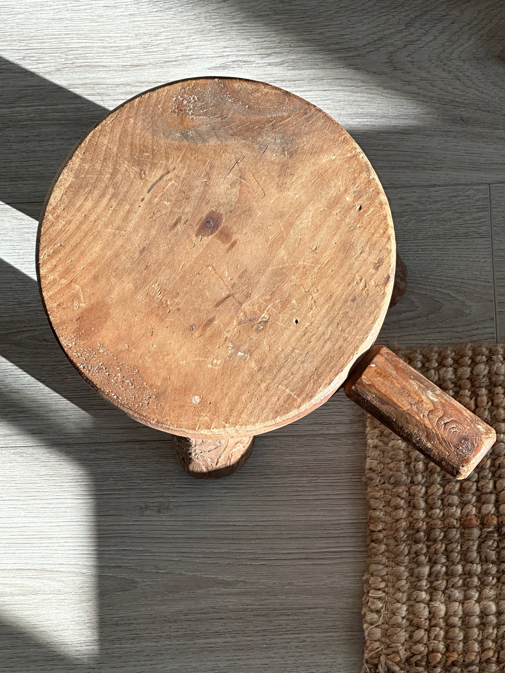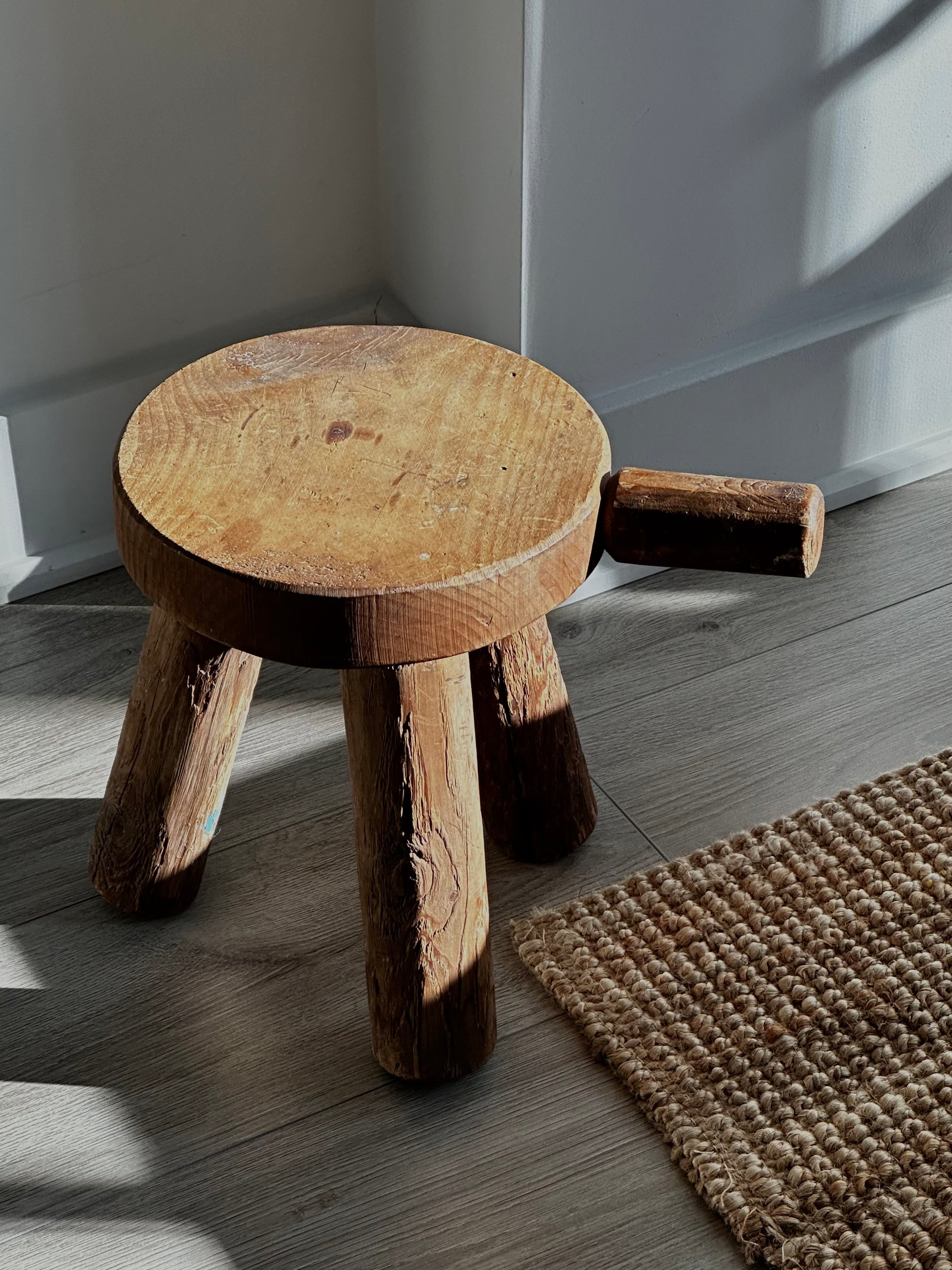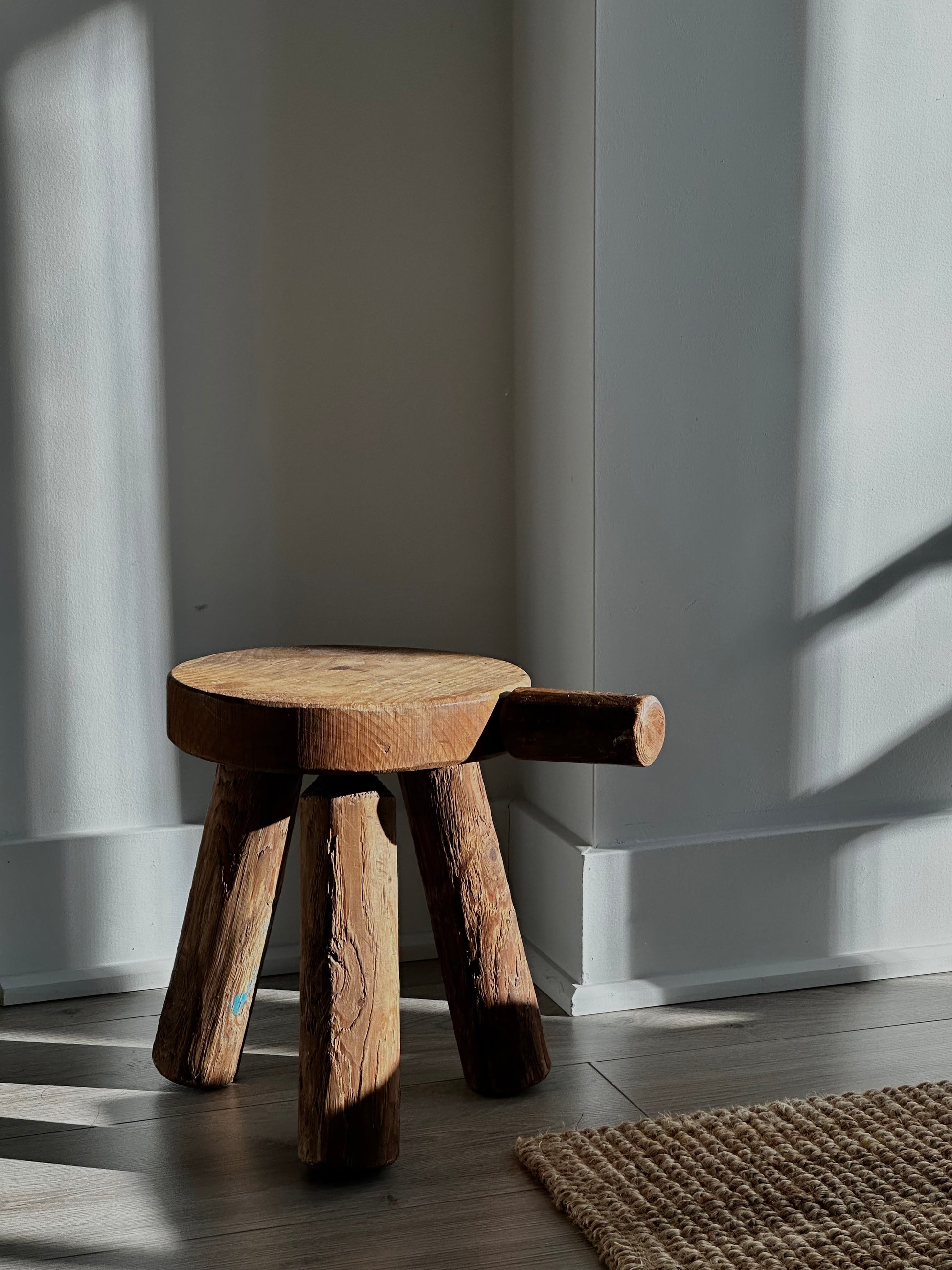 This stool boasts a raw and rugged appearance, characterized by bold geometric shapes, rough textures, and an unapologetic embrace of materials. The distinctive silhouette of this milking stool draws attention and will sparks conversation.