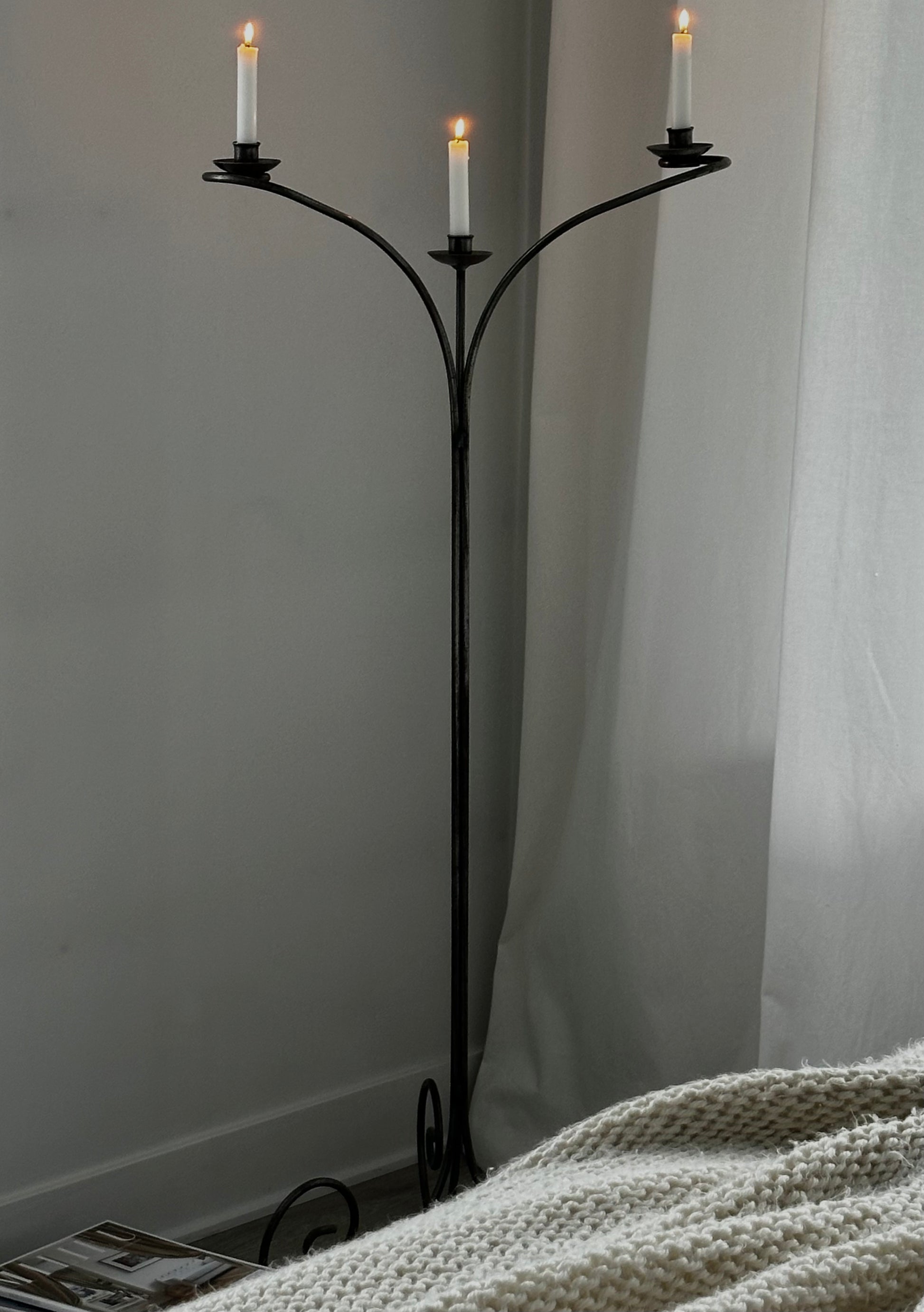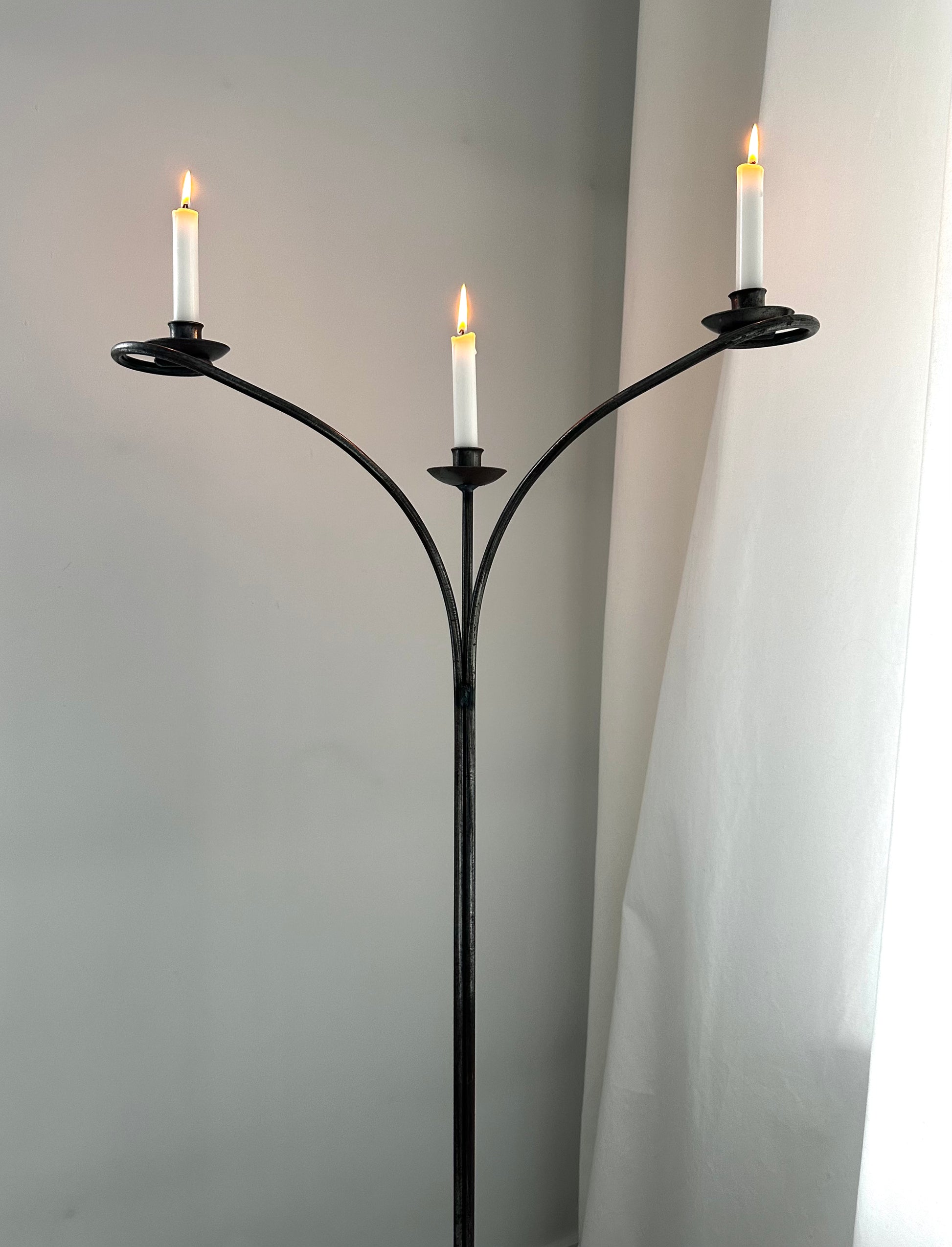 Light up your space in style with this stunning tall floor candelabra! Crafted from robust metal, its stable tripod base and mesmerizing swirl design combine functionality with artistic flair.