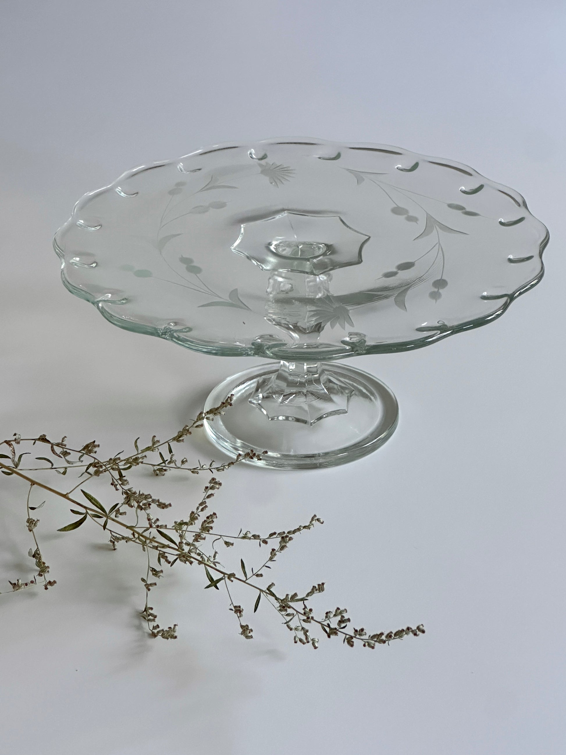 Showcase your desserts in style with this vintage glass cake stand, featuring a delicate floral etch design. Perfect for cakes, cupcakes, or anything that deserves a little extra flair, it brings a whimsical garden vibe to your table.