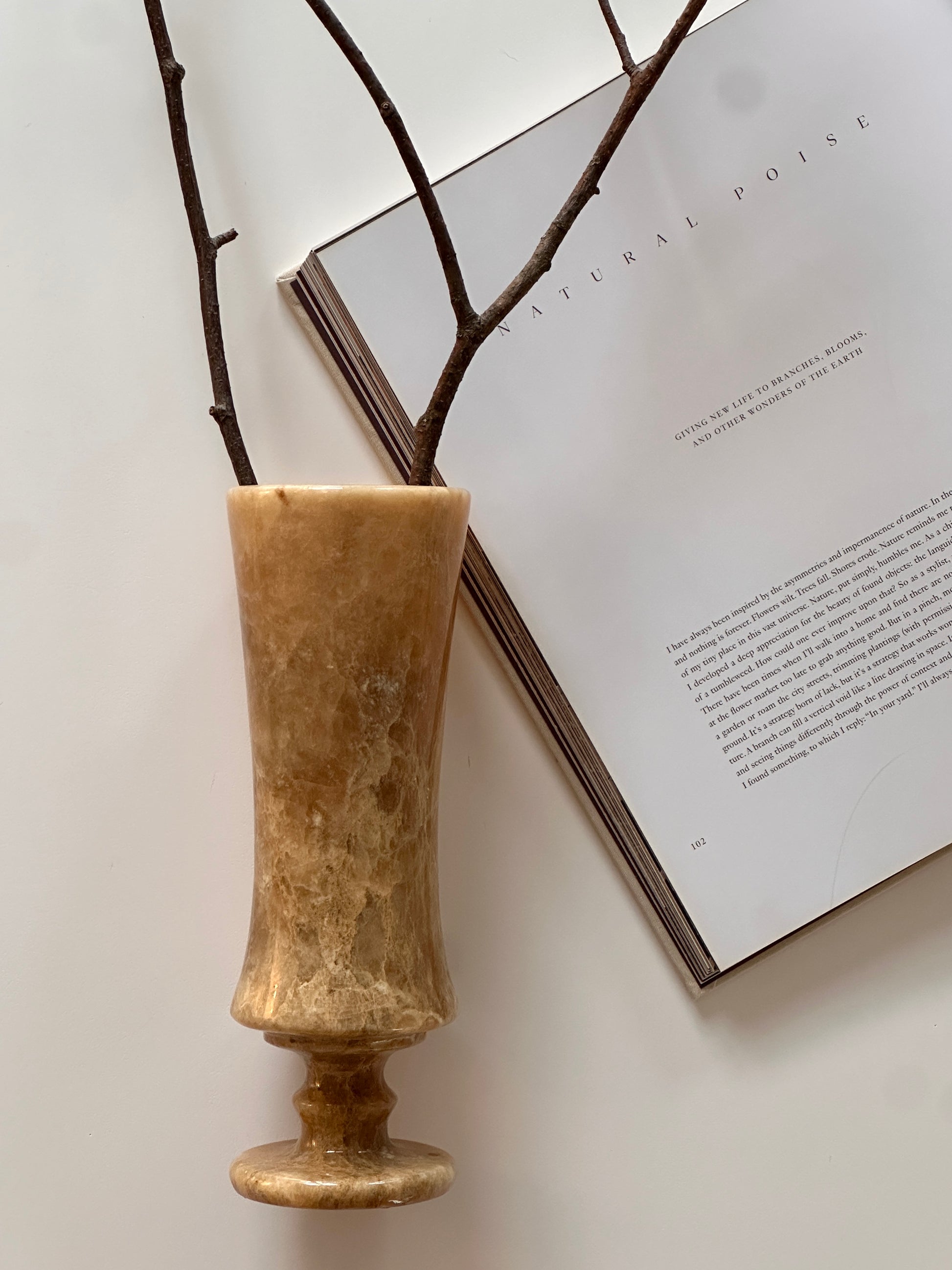 Add a touch of elegance to your space with this Vintage Honey Onyx Pedestal Vase. Its warm, natural hues and rich veining make it a unique piece, perfect for showcasing flowers or standing beautifully on its own as a statement decor item.
