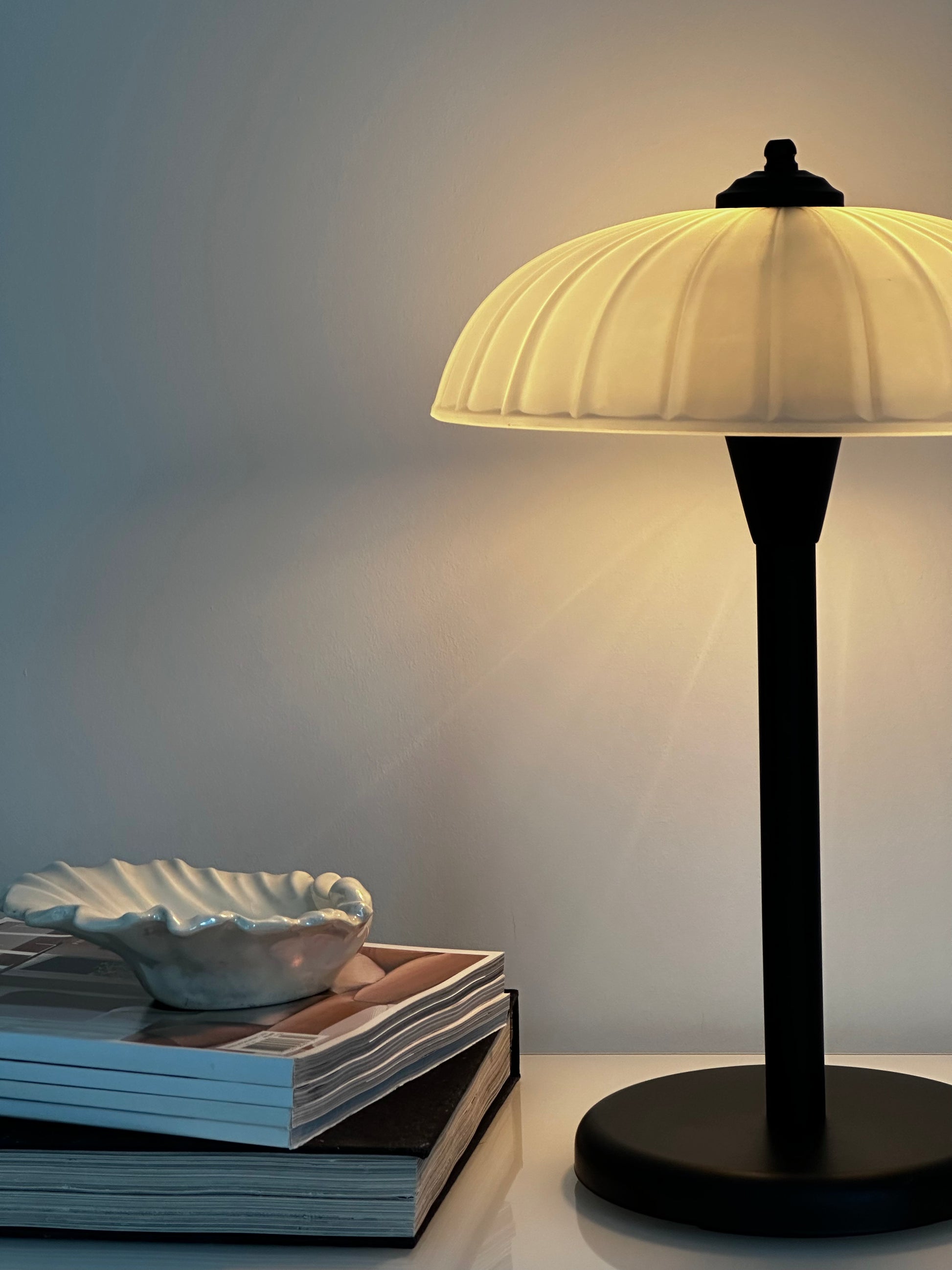 The translucent glass shade gently diffuses warm, soft light, creating a cozy ambiance that’s both inviting and relaxing.