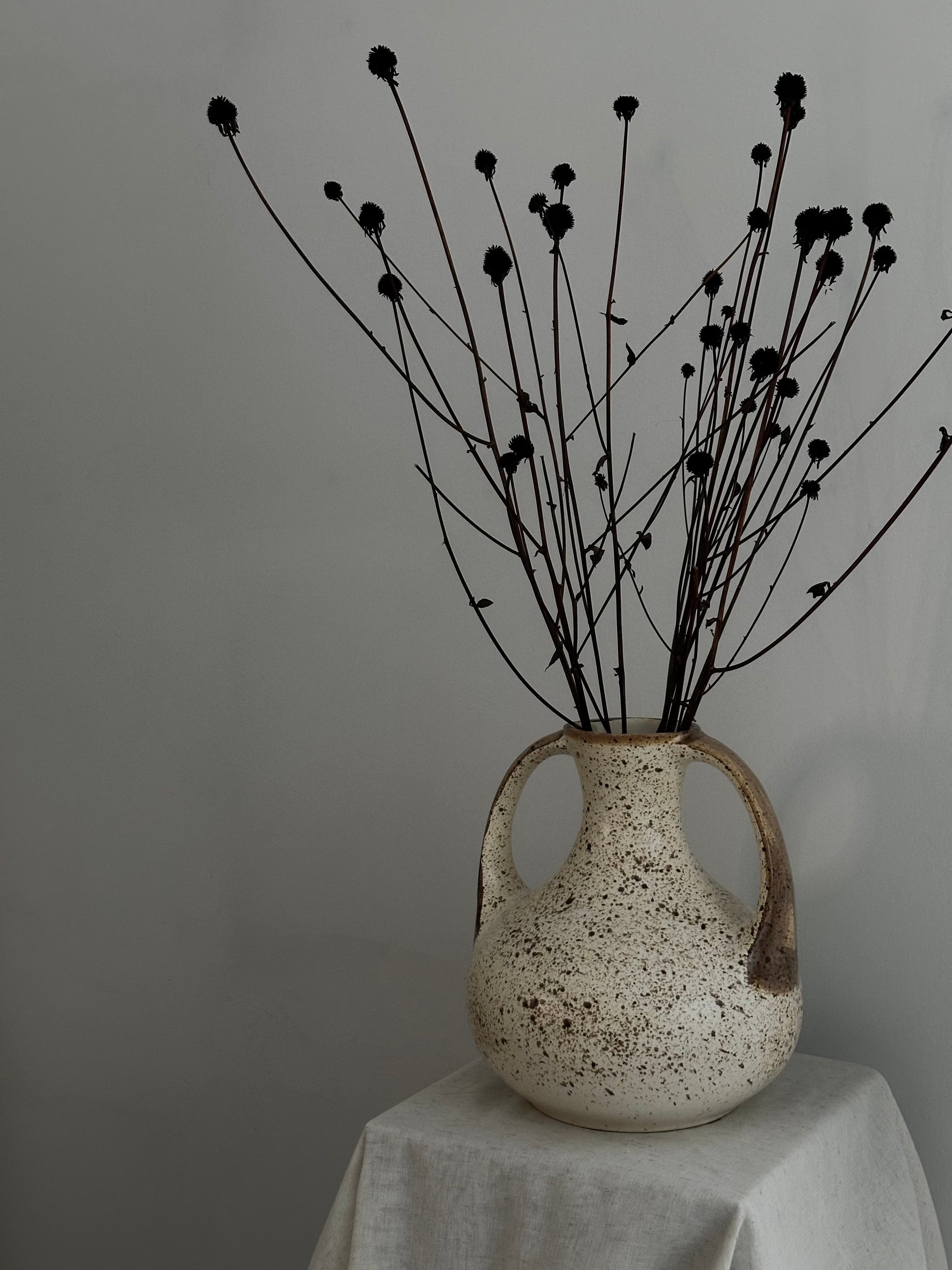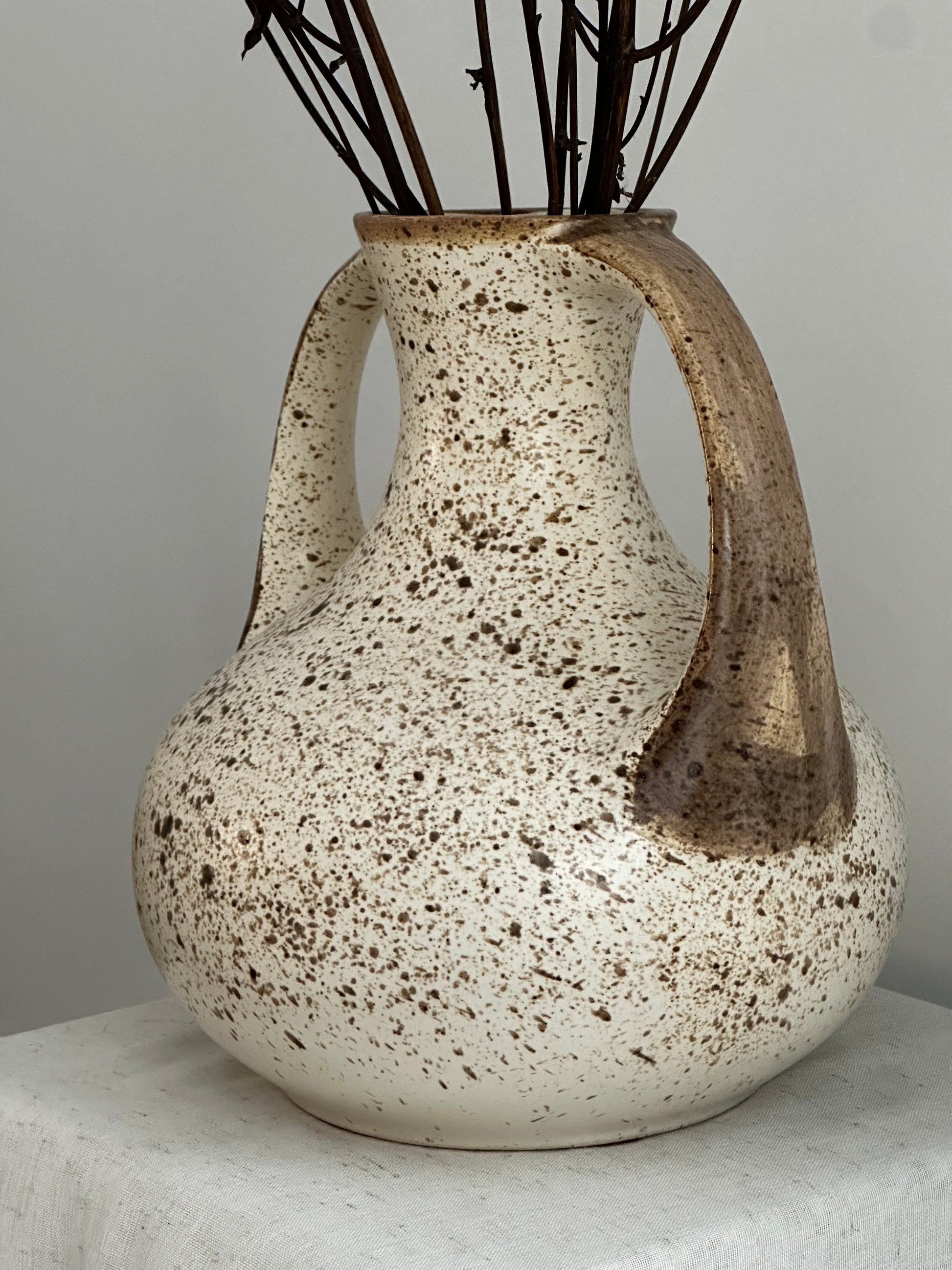 This vintage vase is a timeless piece that effortlessly combines rustic charm with modern aesthetics. The freckle beige and sand colors create a warm, inviting ambiance, while the carefully crafted handles add a touch of classic elegance.