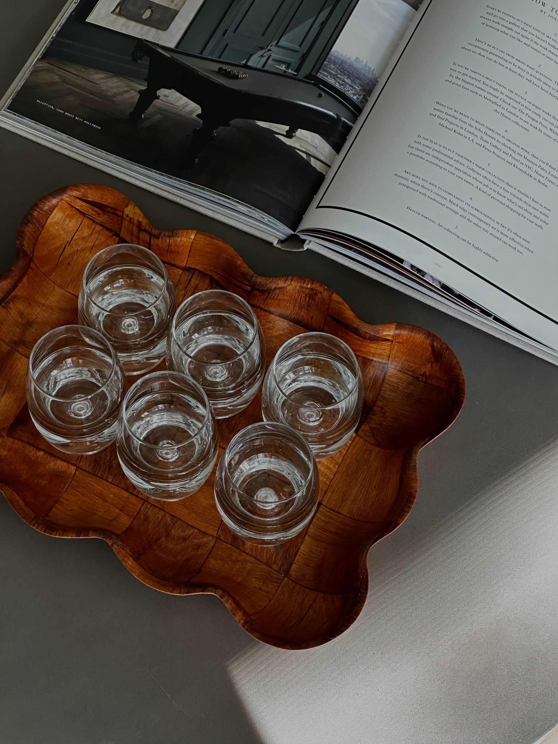 This wooden tray boasts a classic checkered pattern, with wavy edges with a lightweight feel.